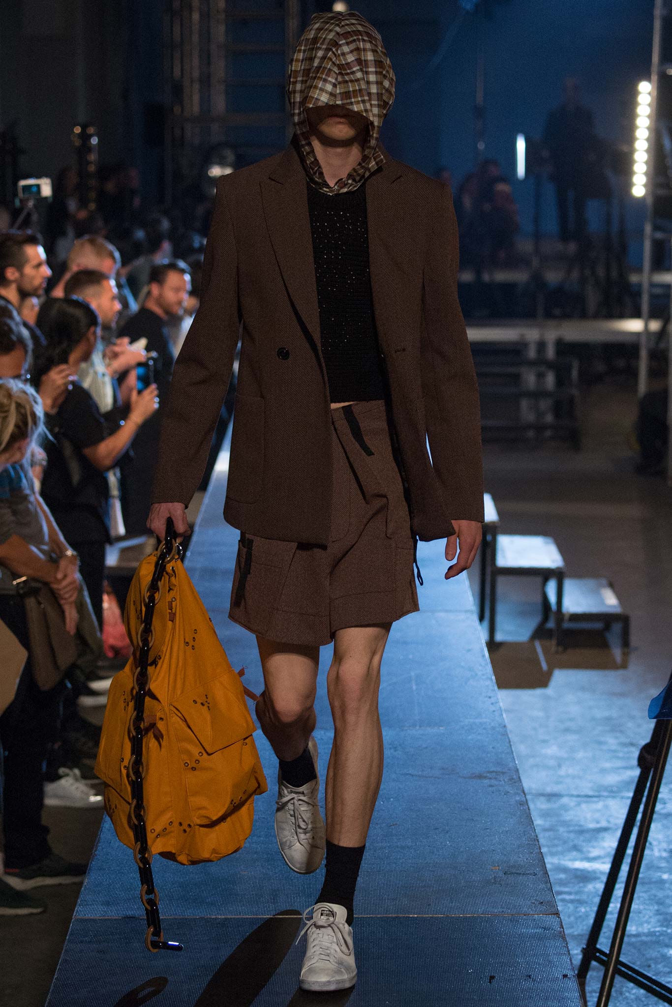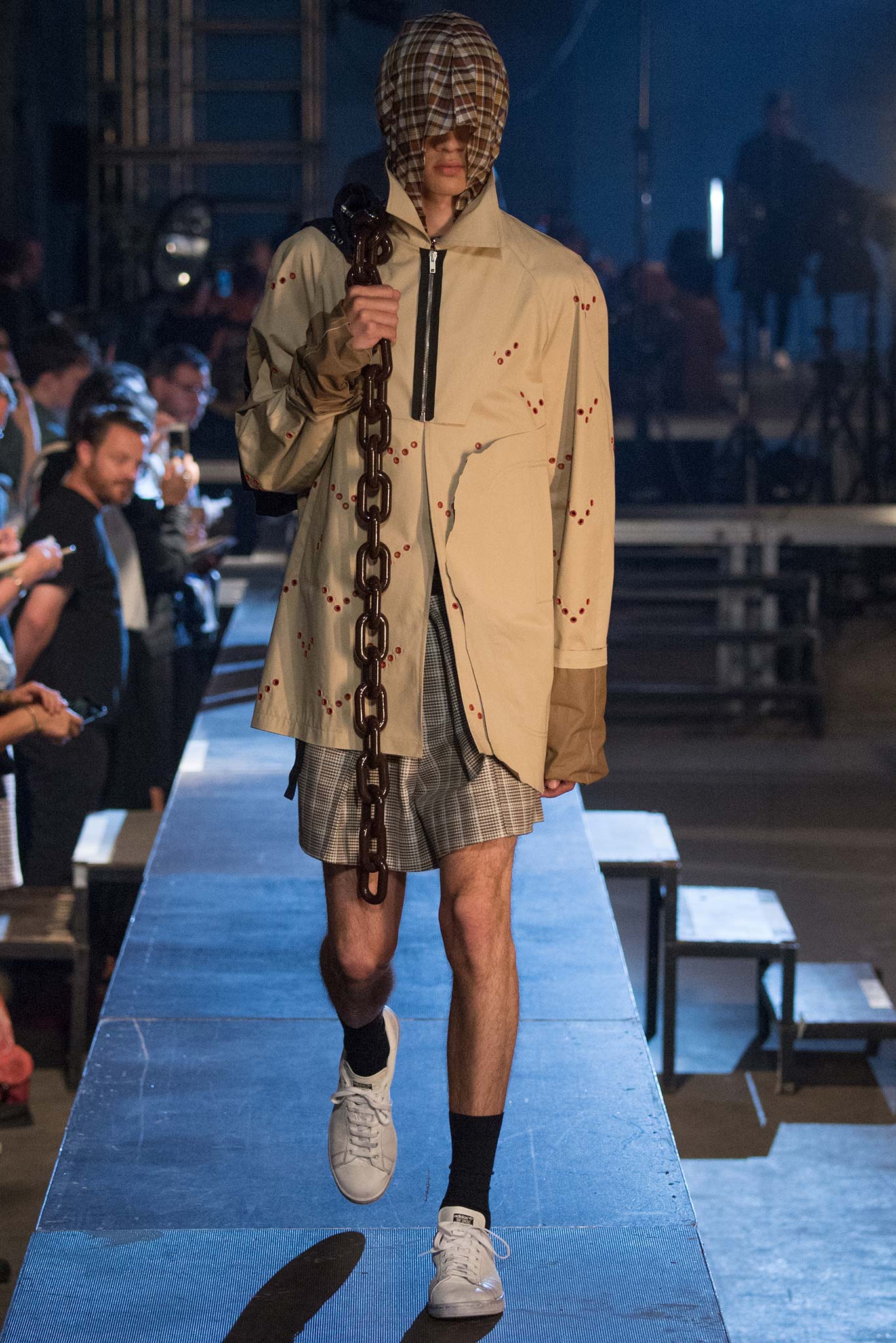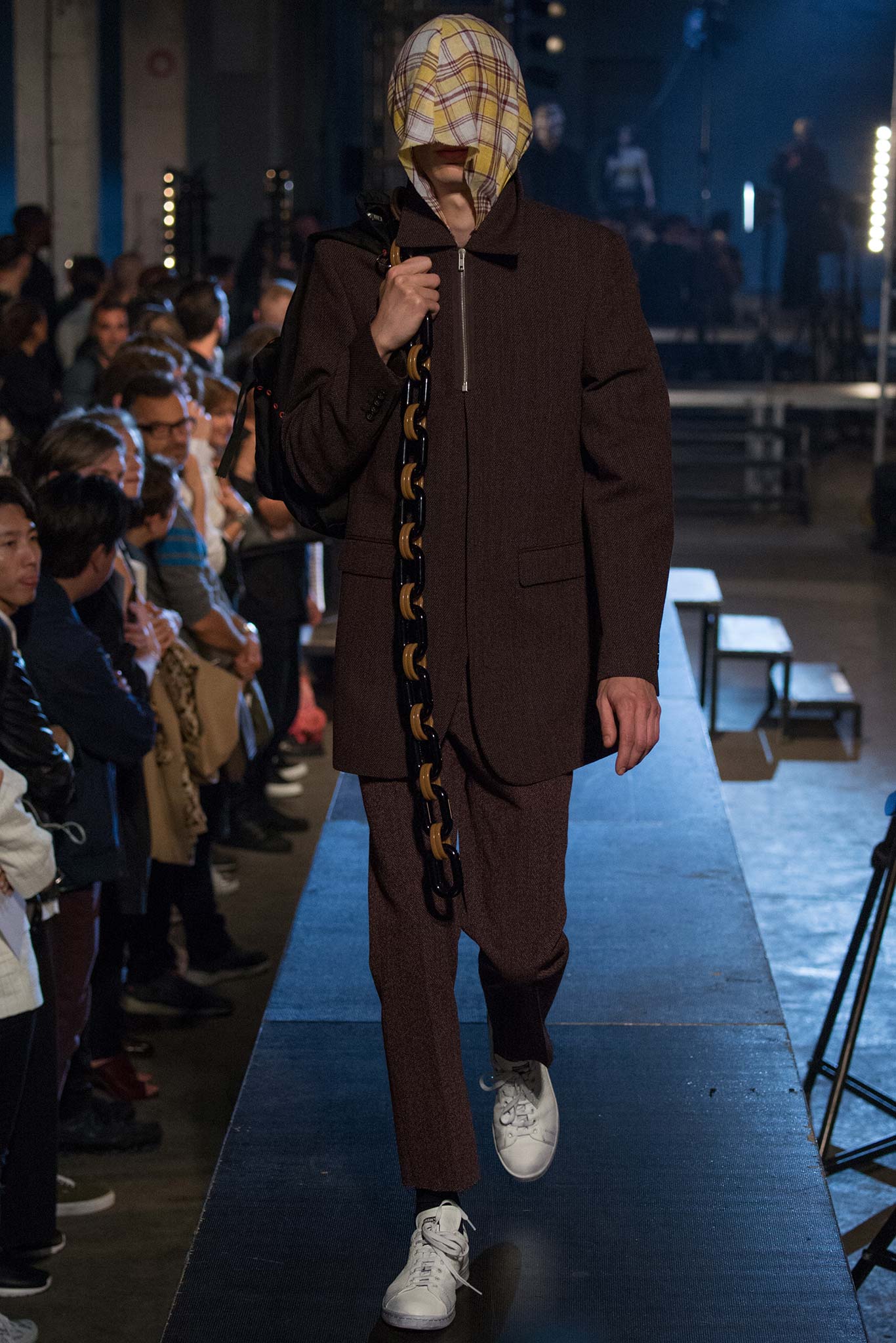 我相當喜歡他在衣服上表現的一些隱晦的暗喻手法,這次設計的風格靈感為「very gang」,我們從很多刻意遮住臉龐去臉部化的套頭衫可以想像,不論你是什麼種族、什麼膚色、什麼長相,只要穿上了Raf Simons的服裝,就都是同一族群。我很喜歡這樣的表達方式,另外,我們看到這一季重點單品,也就是包包上的巨大鎖鍊設計,不也在暗喻著告訴我們,人生旅程中所要承擔的負擔很重(背景音樂可以配上陳奕迅的你的背包,超合適),但也只有扛著,馱著,才能不斷繼續往前。最後,我只能說我太愛他的白色sneaker,有點刻意弄髒的觸感,相當合我的胃口(立馬把converse弄髒)。