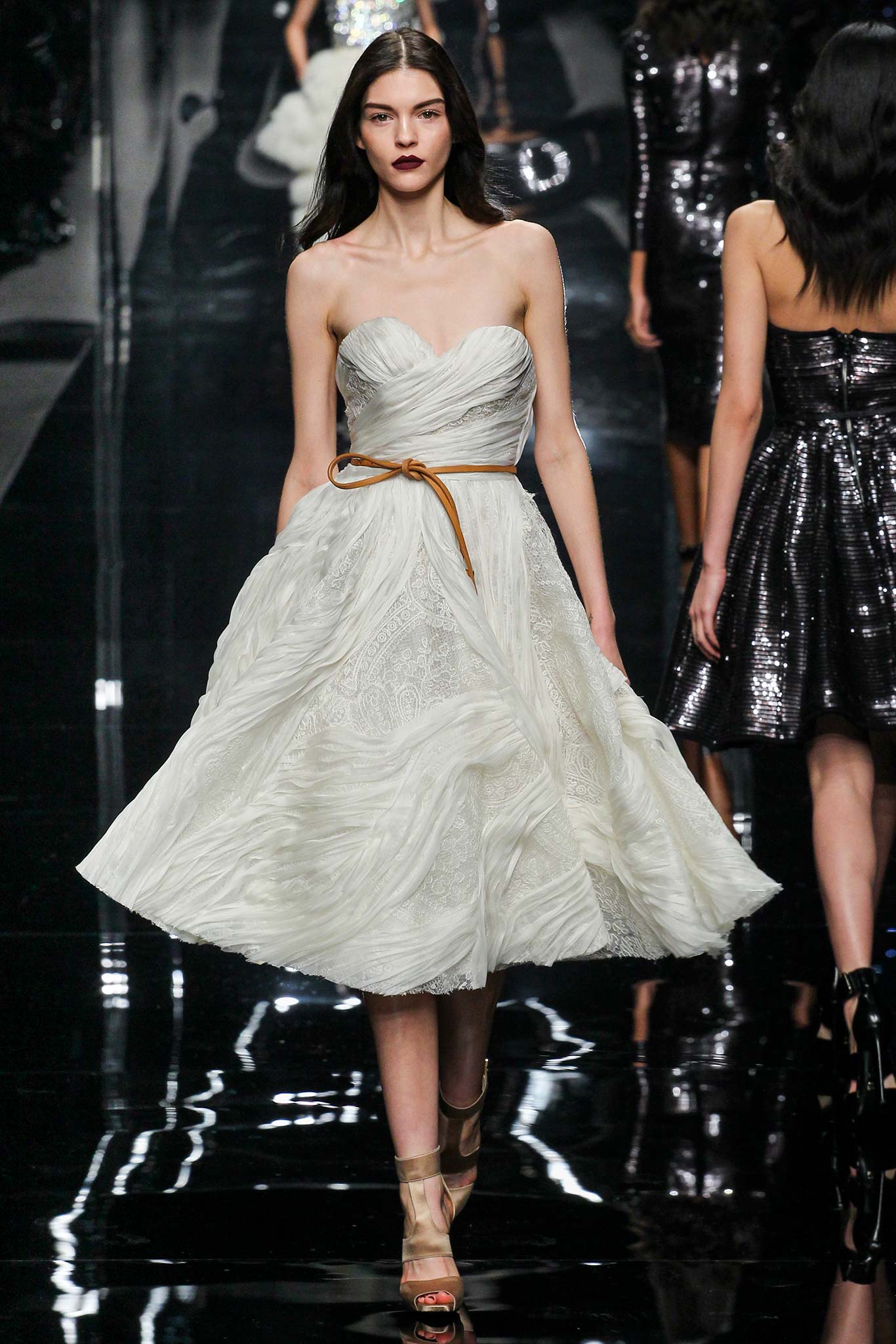 這套Ermanno Scervino 2015秋冬的小洋裝,在秀上看來細節十足,衣服上綿密細膩的抓皺實在很像是千層派也很像天上的雲朵,配上駝色繫皮帶好有氣質。但大S穿起來覺得輕盈感不見了,從雲朵變成棉花糖。