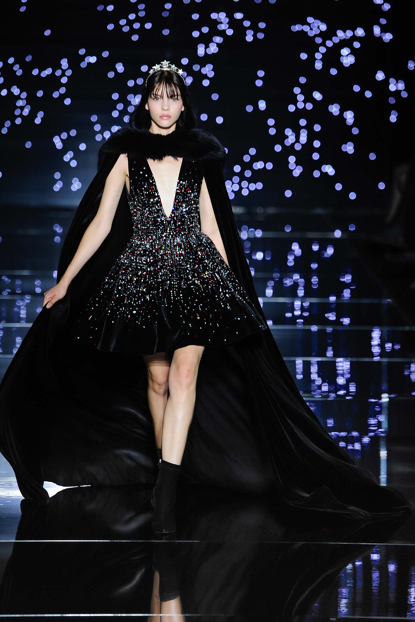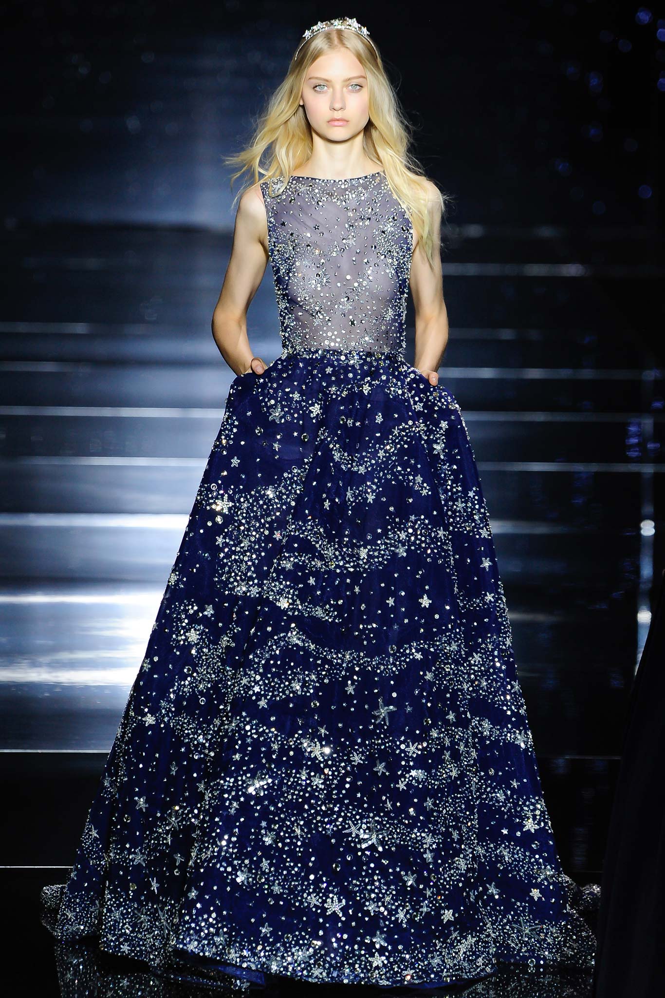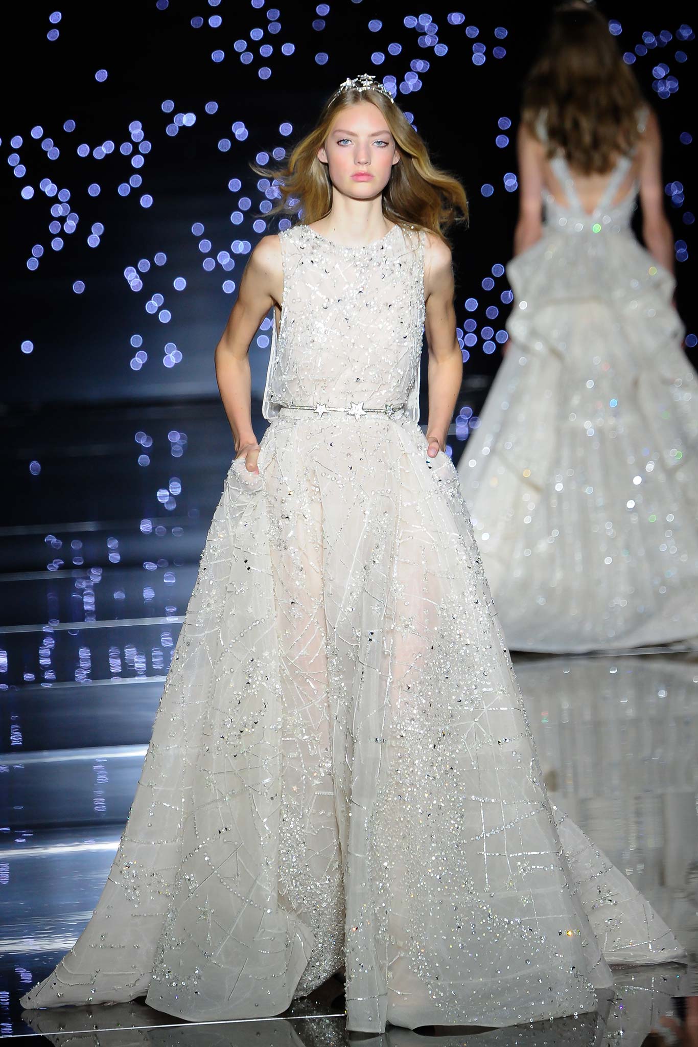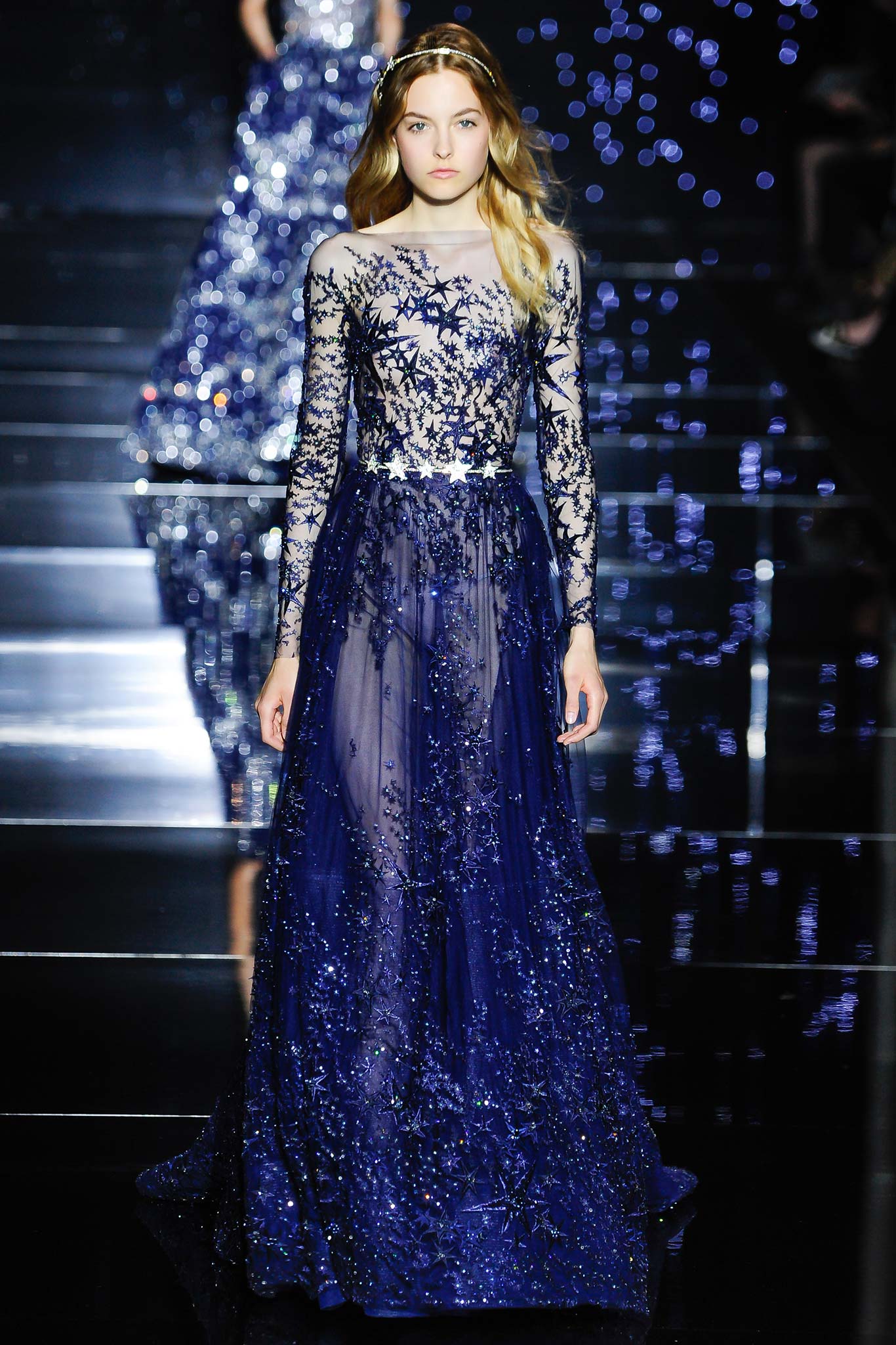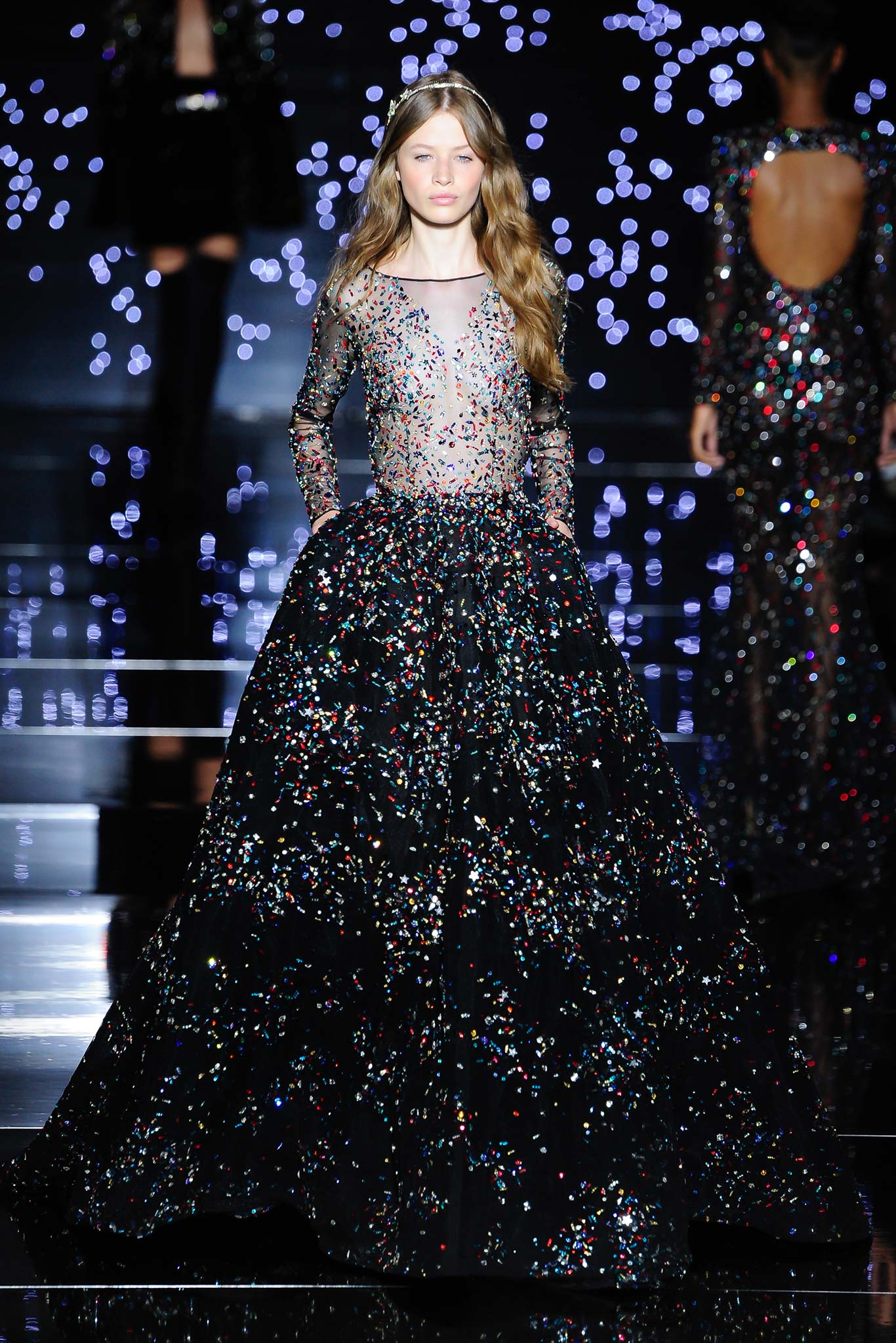 高級訂製服中華麗唯美至極的亮片、刺繡、珠墜以及水晶(這同樣也是Zuhair向來拿手的)配上本來就閃耀與充滿神秘美感的星空銀河靈感,成果要不美也難。