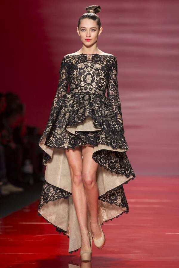 這一件有著明顯前高後低結構的平口禮服,上面有著極細膩的黑色蕾絲,很可愛也很有氣質;不過我一直覺得內裡的顏色有點干擾我就是了。