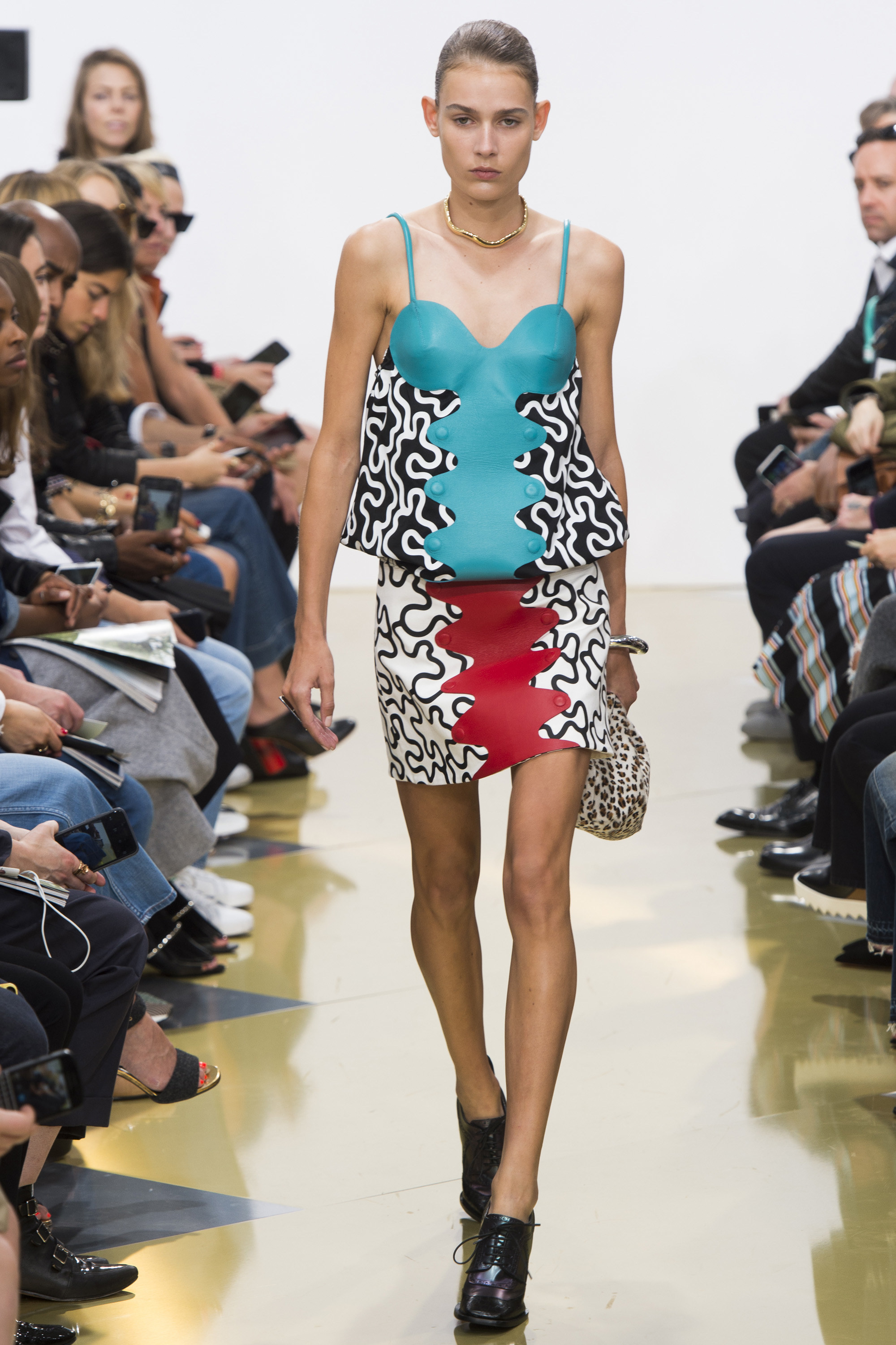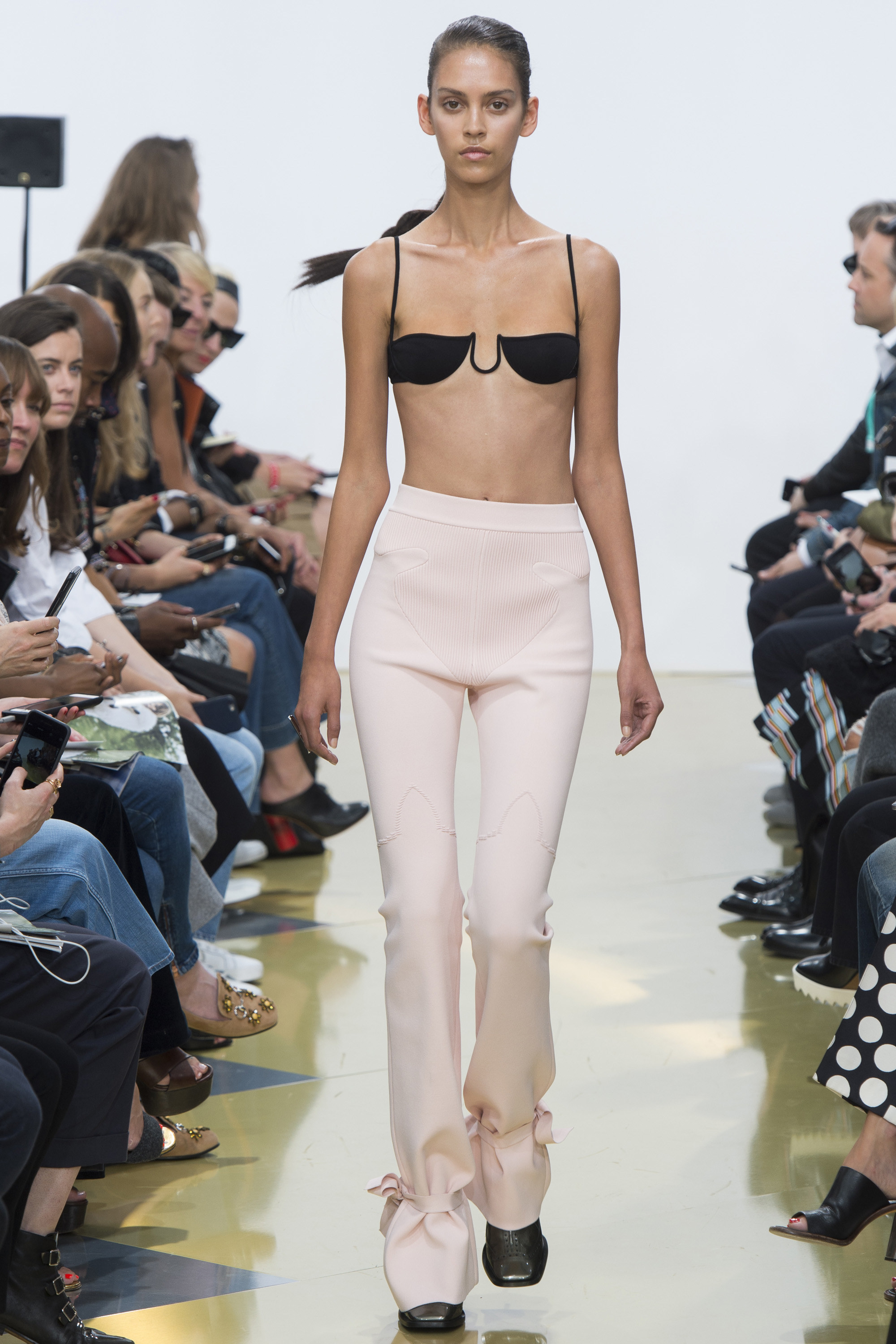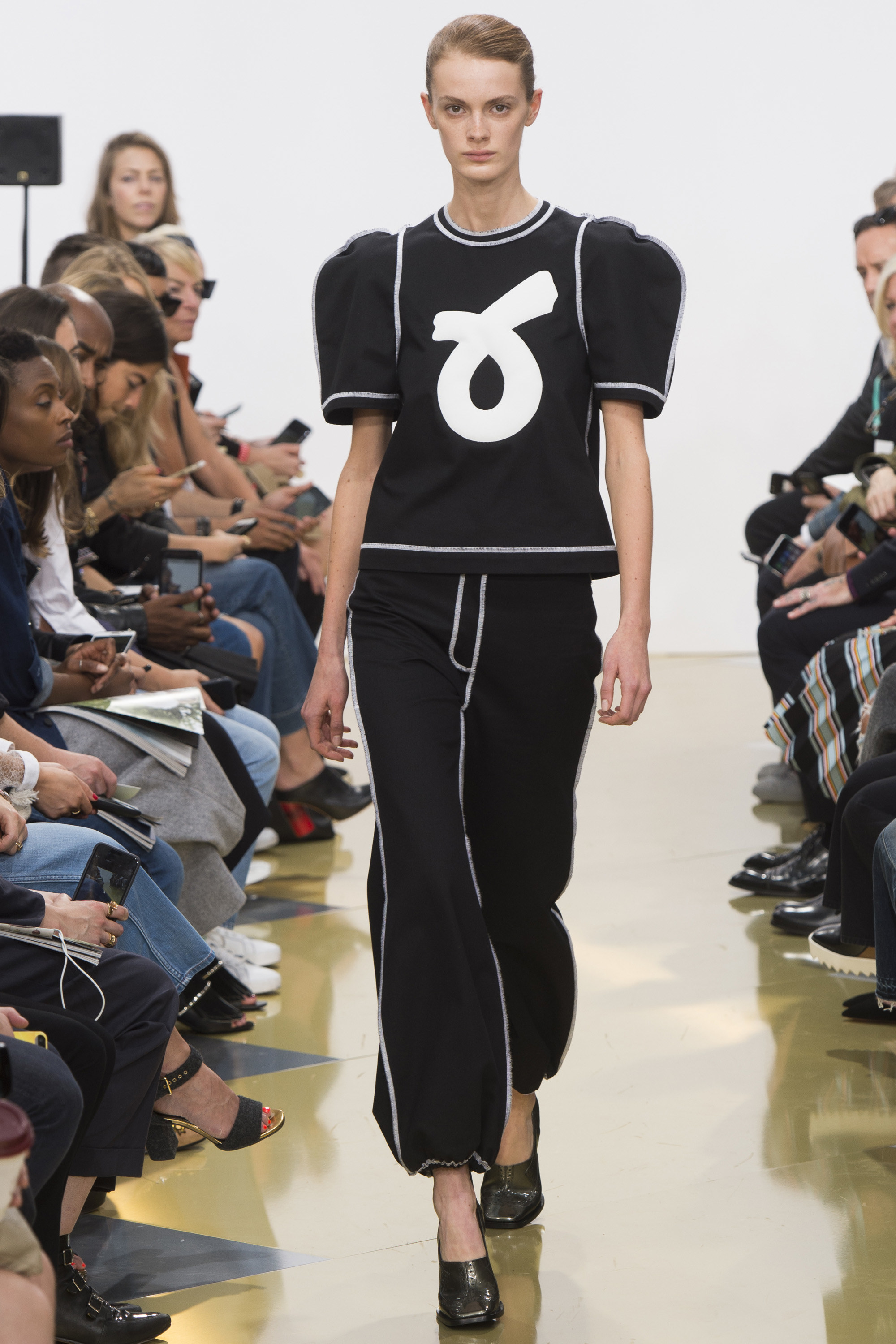 帶點宮廷風又浮誇的羊腿袖的出現讓服裝輪廓走回復古感,但是衣服上Keith Haring的印花在復古中又帶著普普風與當代藝術感,這是八零年代風格的進化;再來是九零年代的極簡風,我們看到了單一的胸罩與剪裁精準的褲裝,不過在褲管上,又加入新的抽繩處理,在冷調中又參進了一絲溫柔感;接下來充滿眾多個人化的設計或單品舉凡蕾絲組成的長/短褲、刻意做出的服裝縫線、有點雷射光水波紋的印花都很有個性。