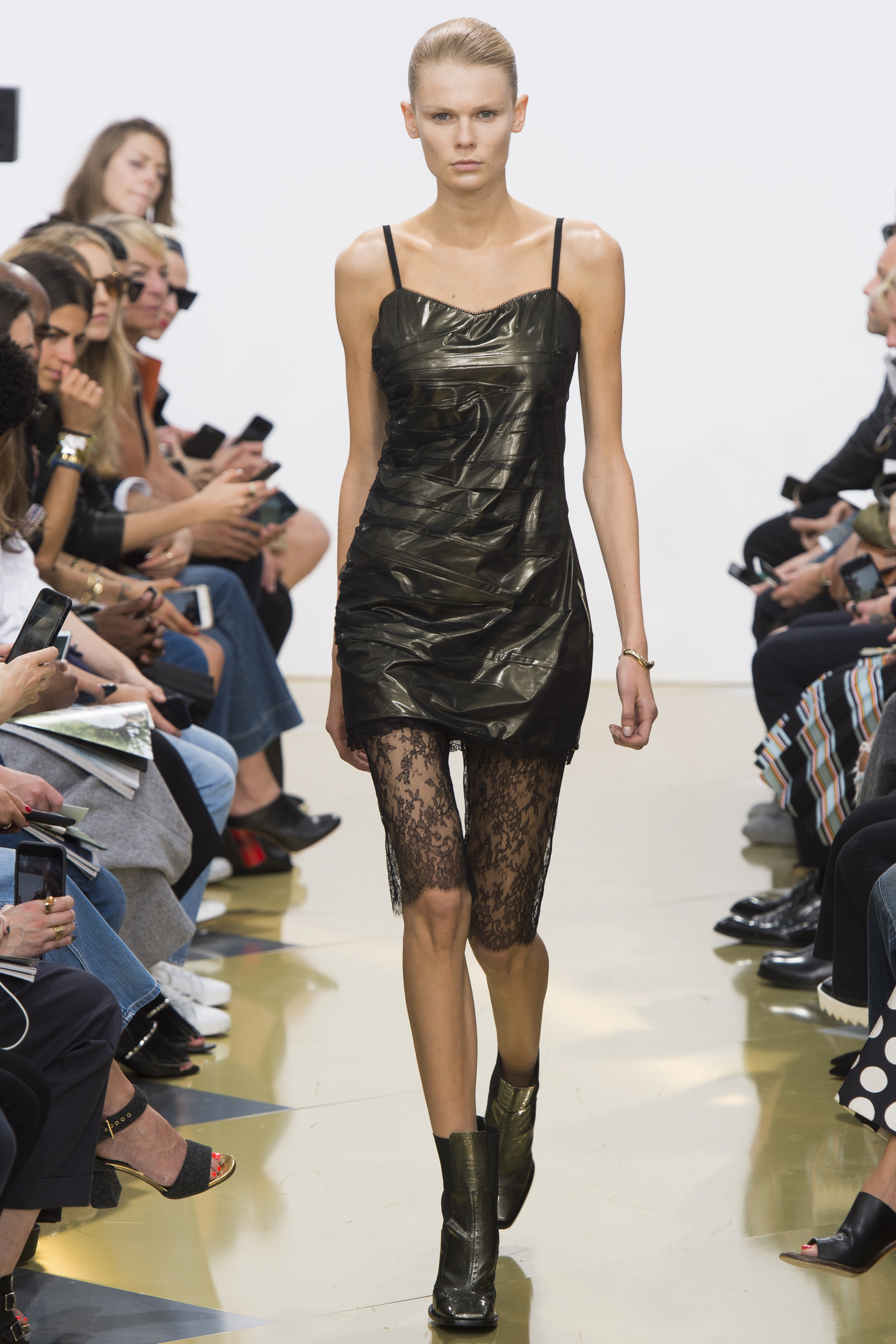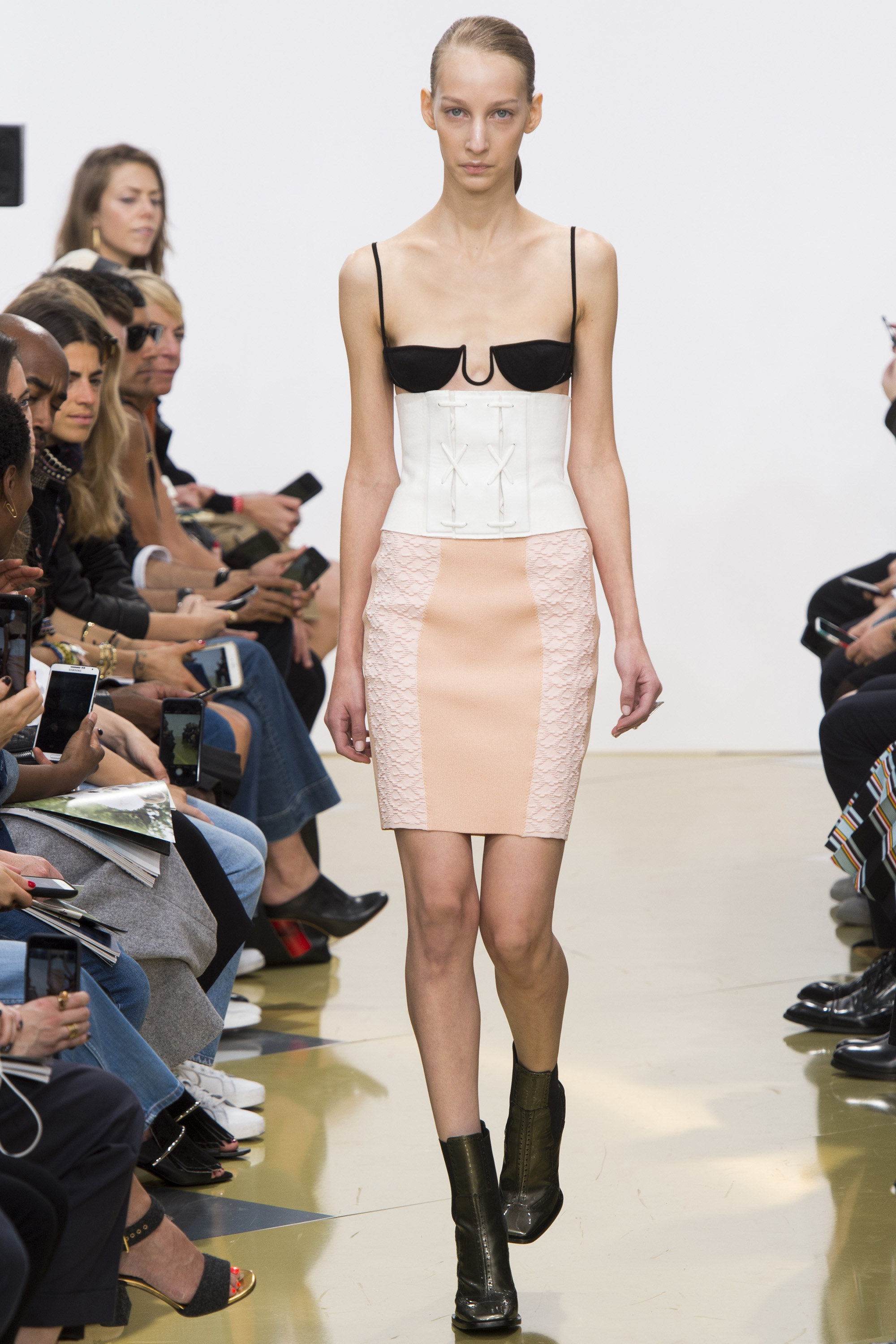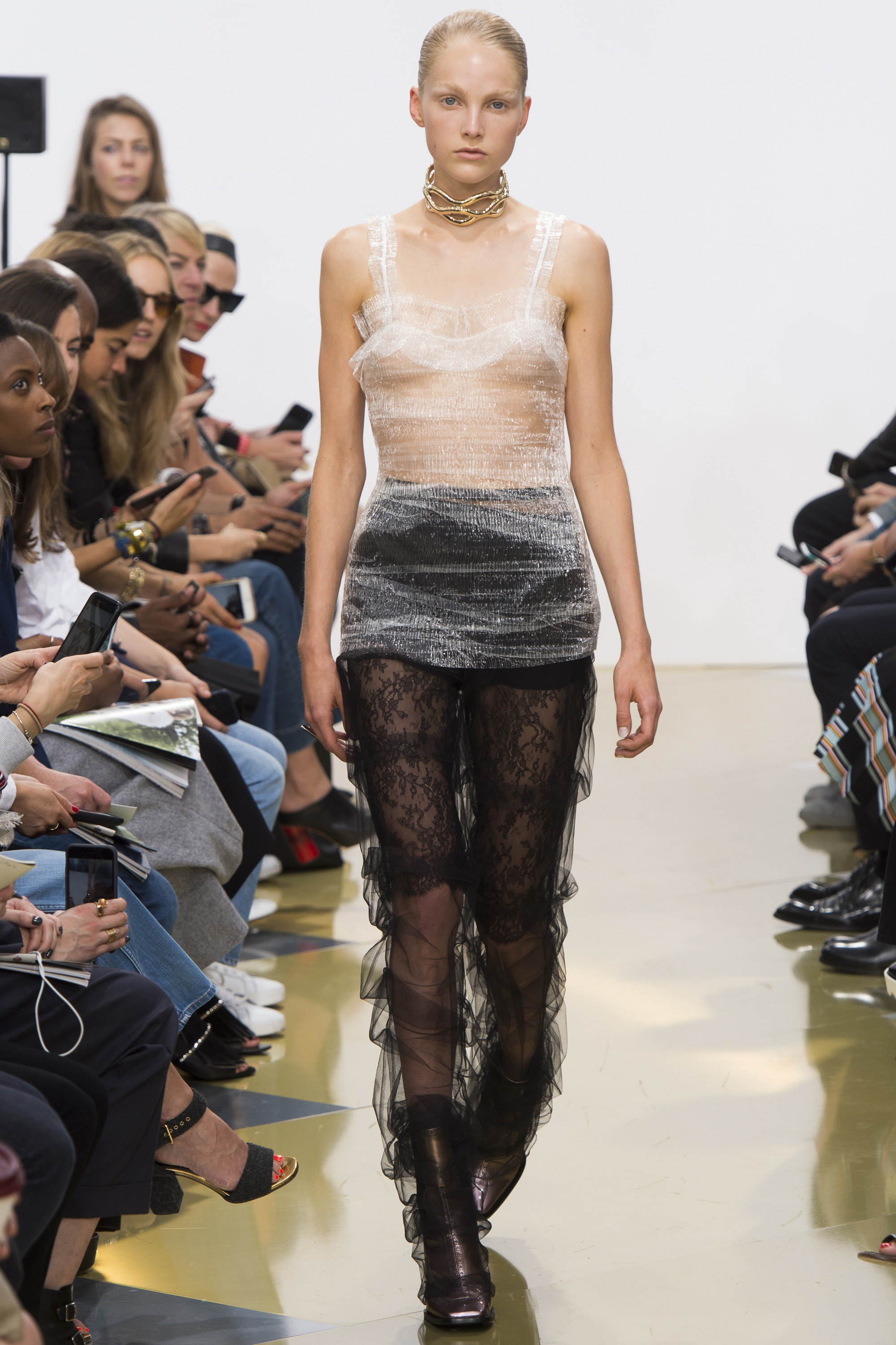 帶點宮廷風又浮誇的羊腿袖的出現讓服裝輪廓走回復古感,但是衣服上Keith Haring的印花在復古中又帶著普普風與當代藝術感,這是八零年代風格的進化;再來是九零年代的極簡風,我們看到了單一的胸罩與剪裁精準的褲裝,不過在褲管上,又加入新的抽繩處理,在冷調中又參進了一絲溫柔感;接下來充滿眾多個人化的設計或單品舉凡蕾絲組成的長/短褲、刻意做出的服裝縫線、有點雷射光水波紋的印花都很有個性。