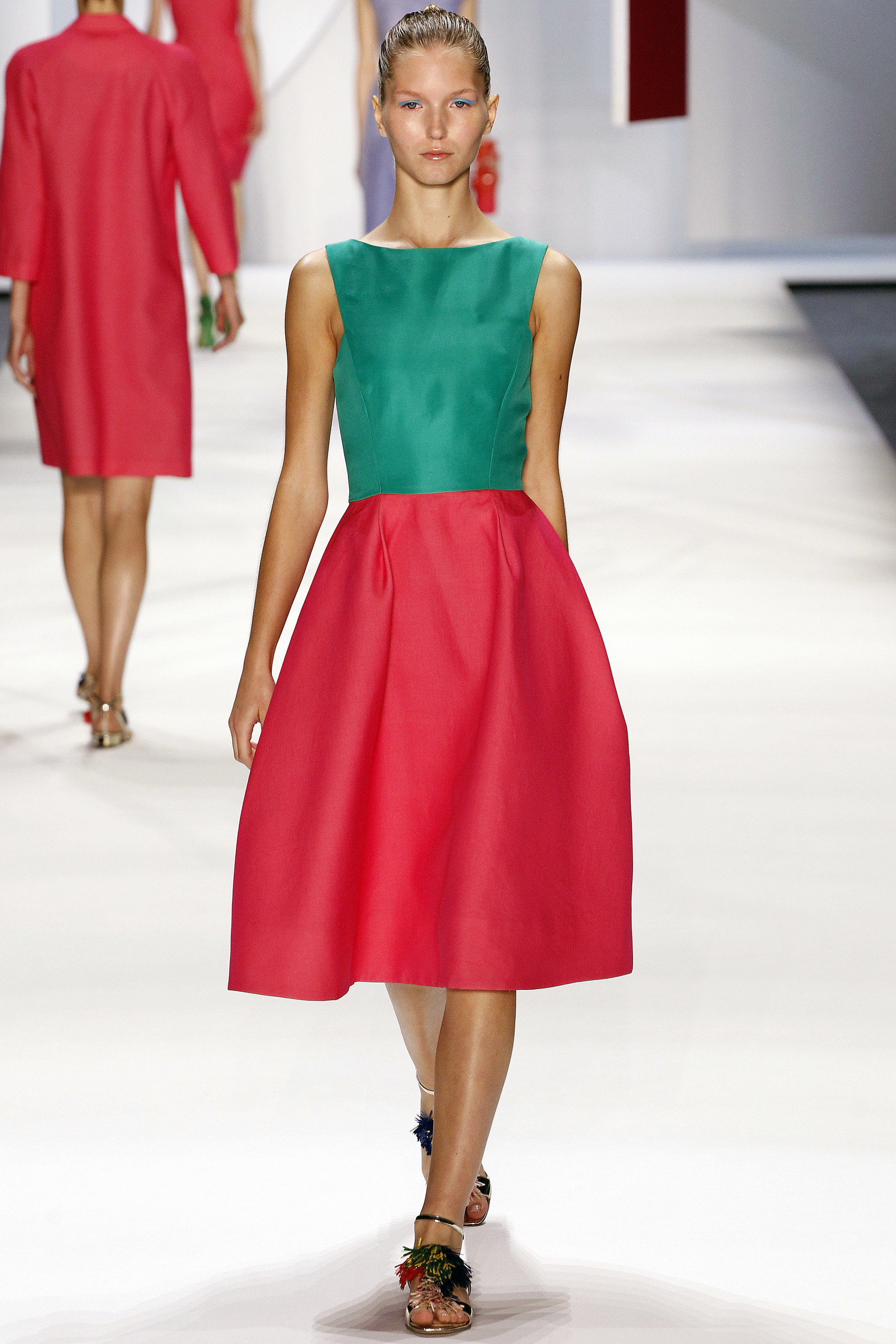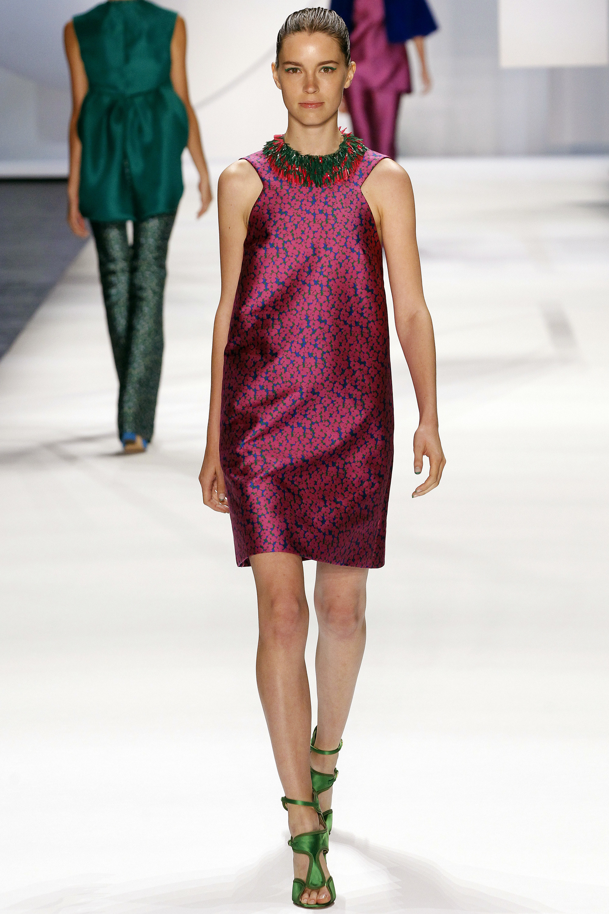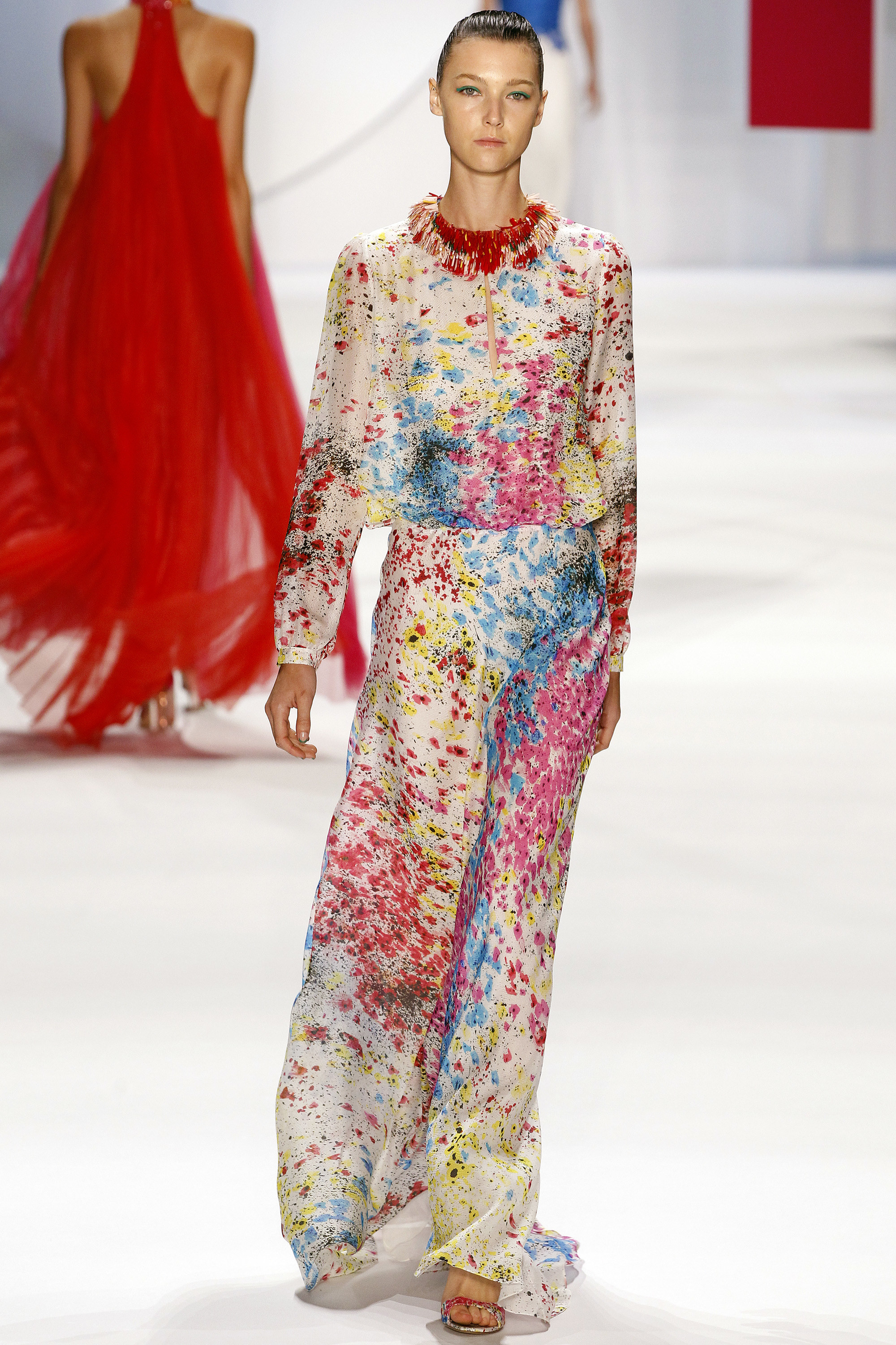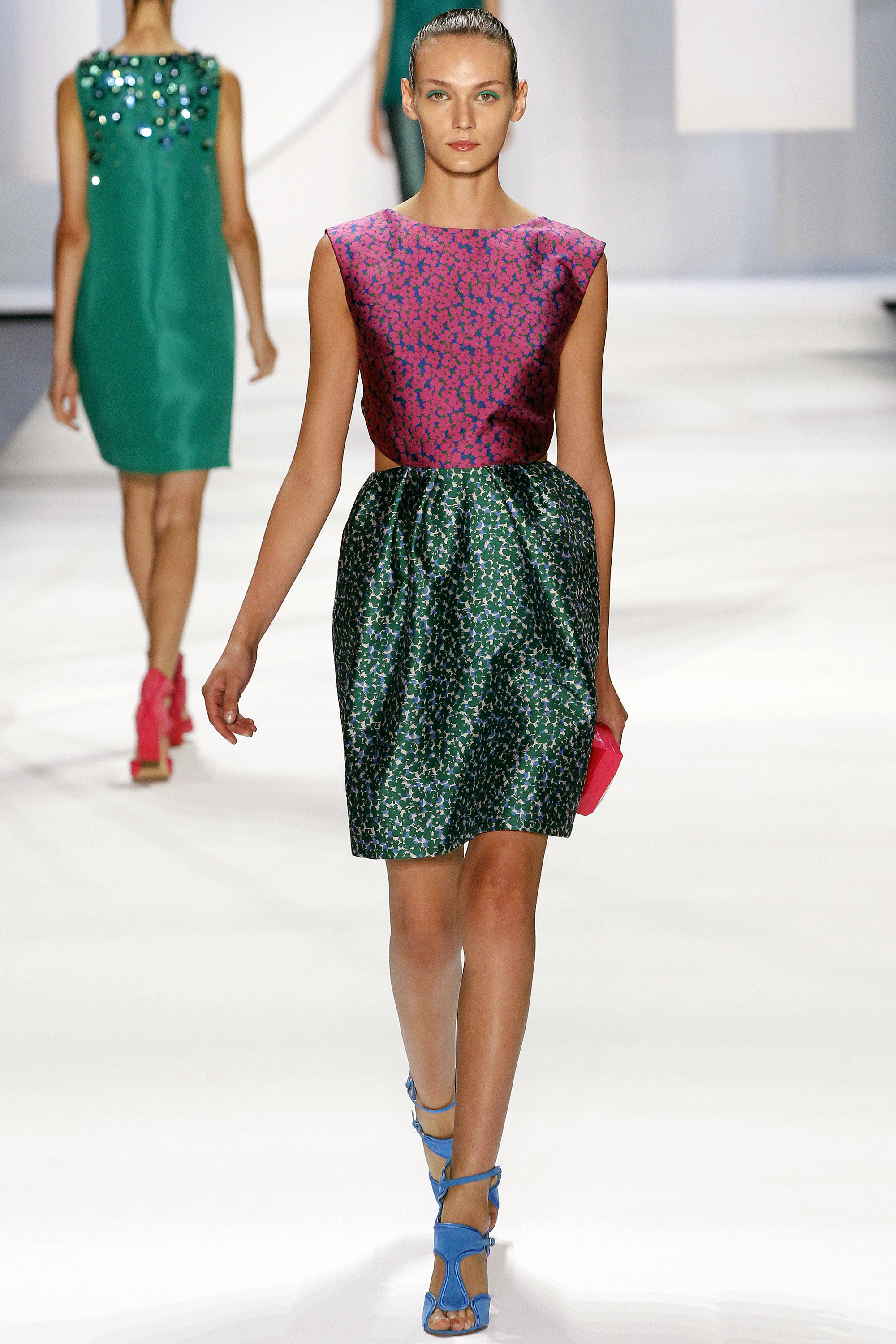 一開始的好幾套略嫌沈悶,直到開始使用顏色之後才讓我醒過來,可能又是我腦補,我在看這個系列的時候,腦海中不斷浮現Giambattista Valli的印花、Dior、Prada、Saint Laurent的輪廓,我比較看不到設計師自己的主張(除了美不勝收的顏色運用之外),感覺就是一系列好看的衣服,有點可惜。