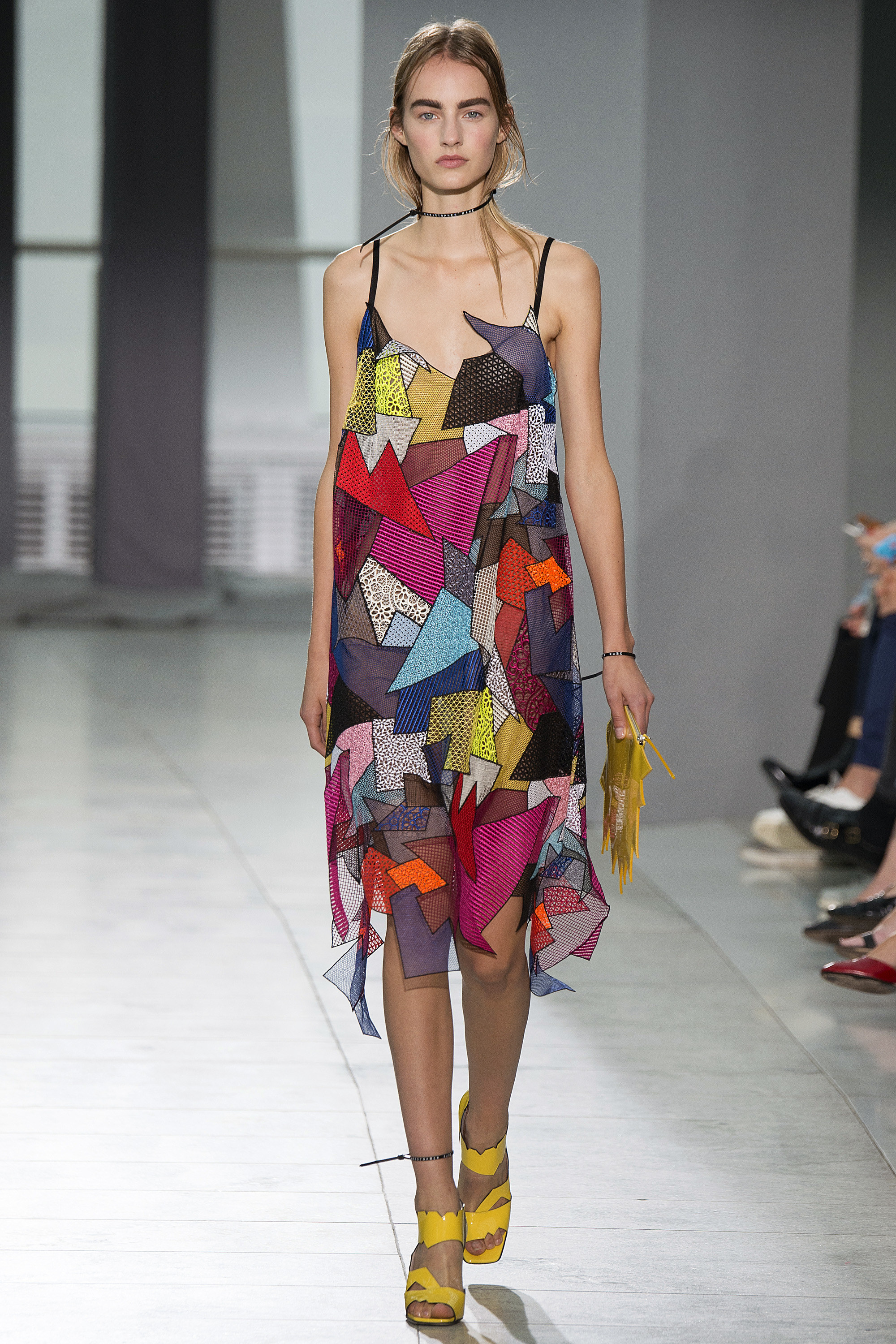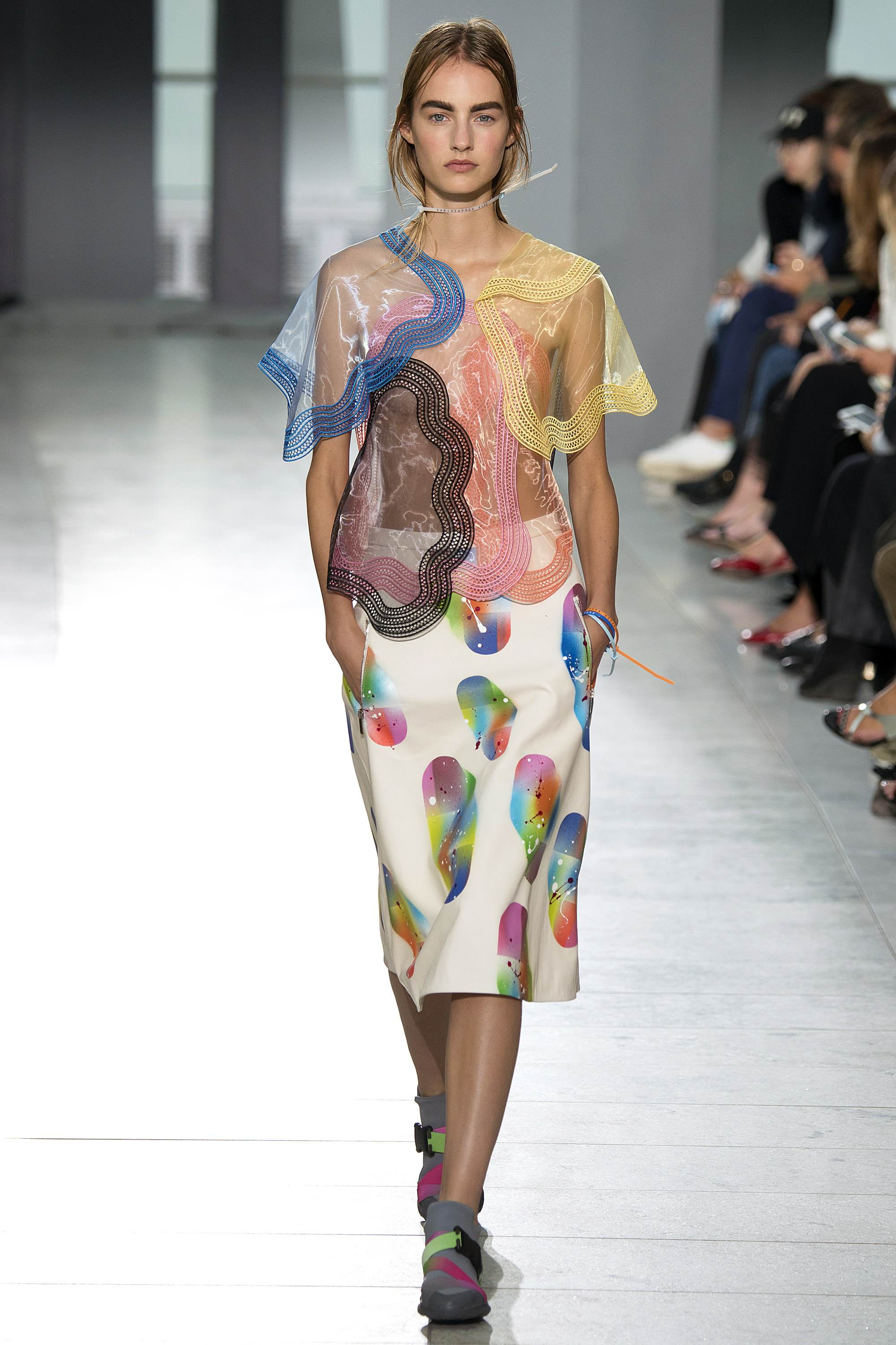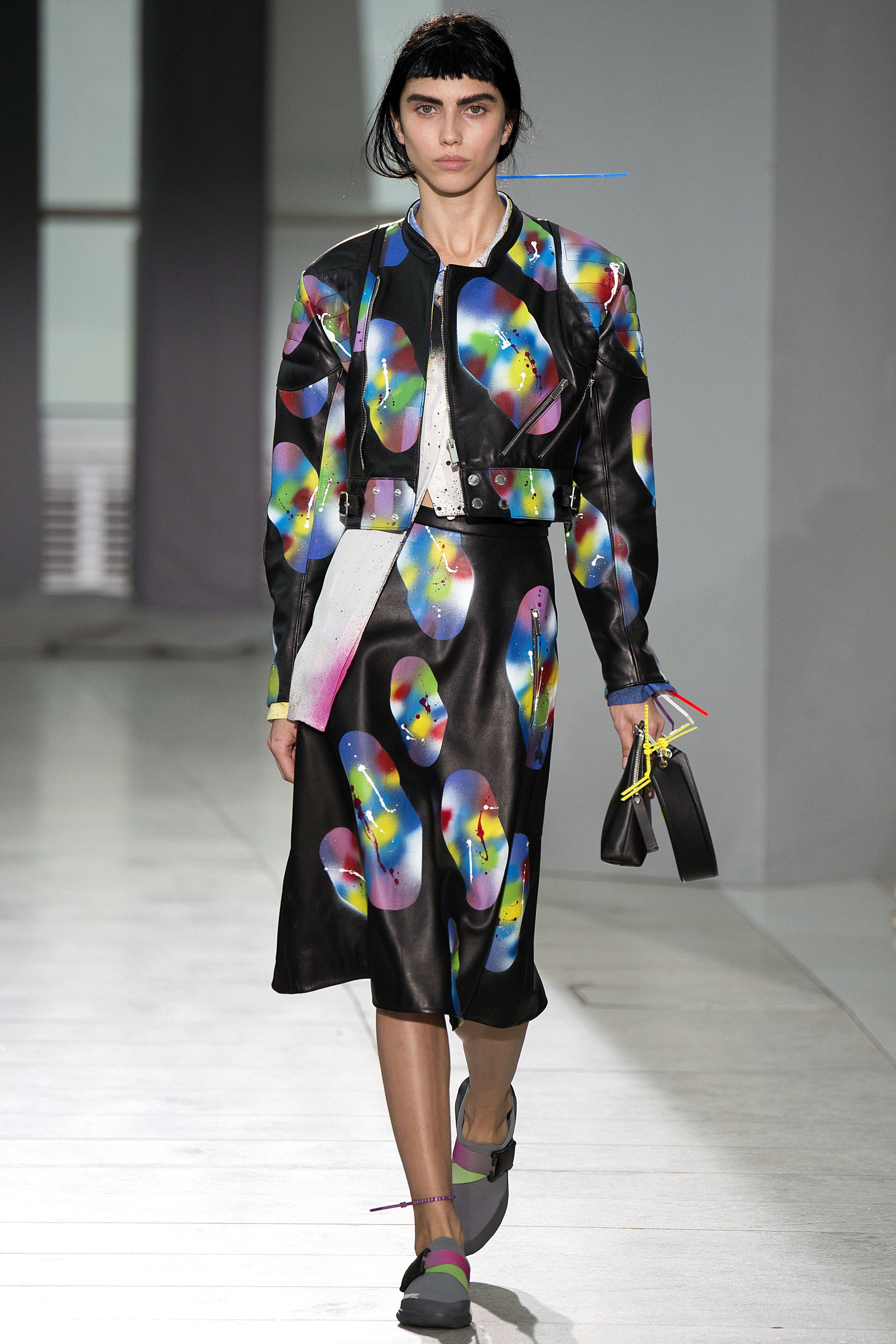 這一季讓我感到太多太強烈的情緒,很衝擊、很複雜、很掙扎還有一點點扭曲,我們看到像是漫畫中表達激動情緒的鋸齒對話框的七彩線條組合而成的洋裝,又或者是一片漆黑閃耀的繽紛流蘇,又或者是那些看似廉價的霓虹色拼貼而成的洋裝,也有著像是表達出噴漆感的印花(我實在太愛),還有延續上一季中帶著透視感又有趣味感的線條。