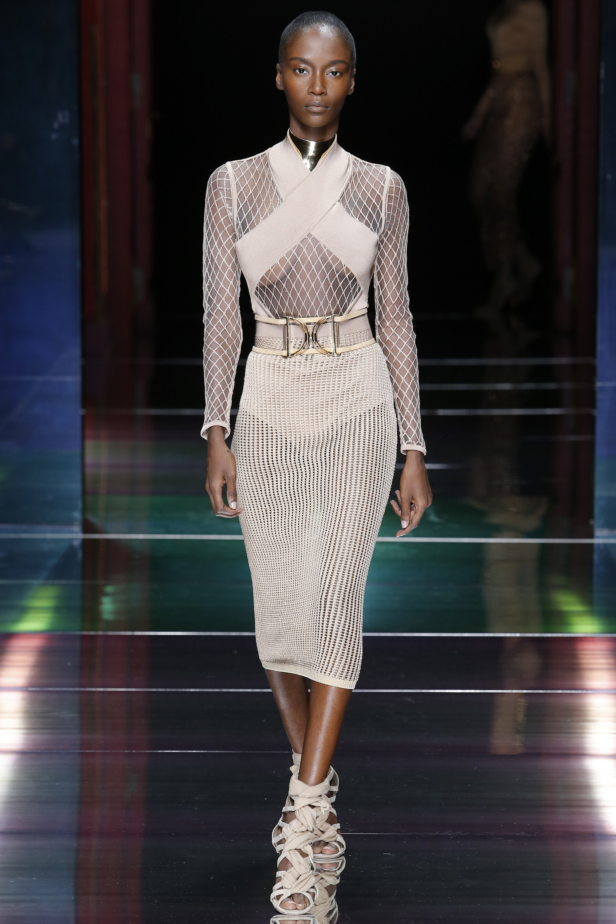 這一季絕大部份的顏色都不張揚,但是在服裝的輪廓上仍保持一貫能裸露就不浪費的風格;像是各式各樣的網狀交叉設計,在裸露之餘還帶著一絲情慾感。我相當喜歡的Balmain式肩線在外套或大衣中屢屢出現,製造出強勢幹練的形象;除此之外,在早春裡我們看到的荷葉邊,在春夏的系列佔了很大的比例,成為裙子還有洋裝的主要構成元素;藉以平衡過於性感或強勢的感覺。