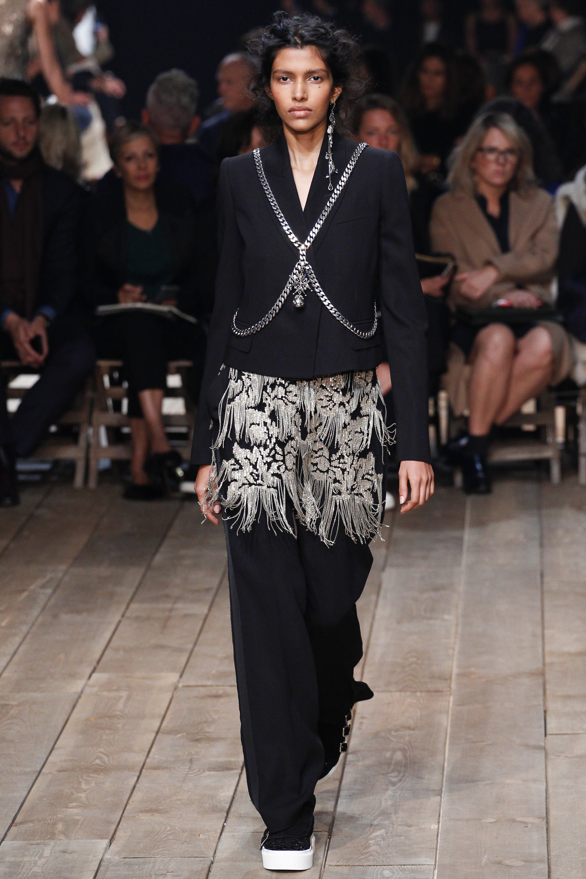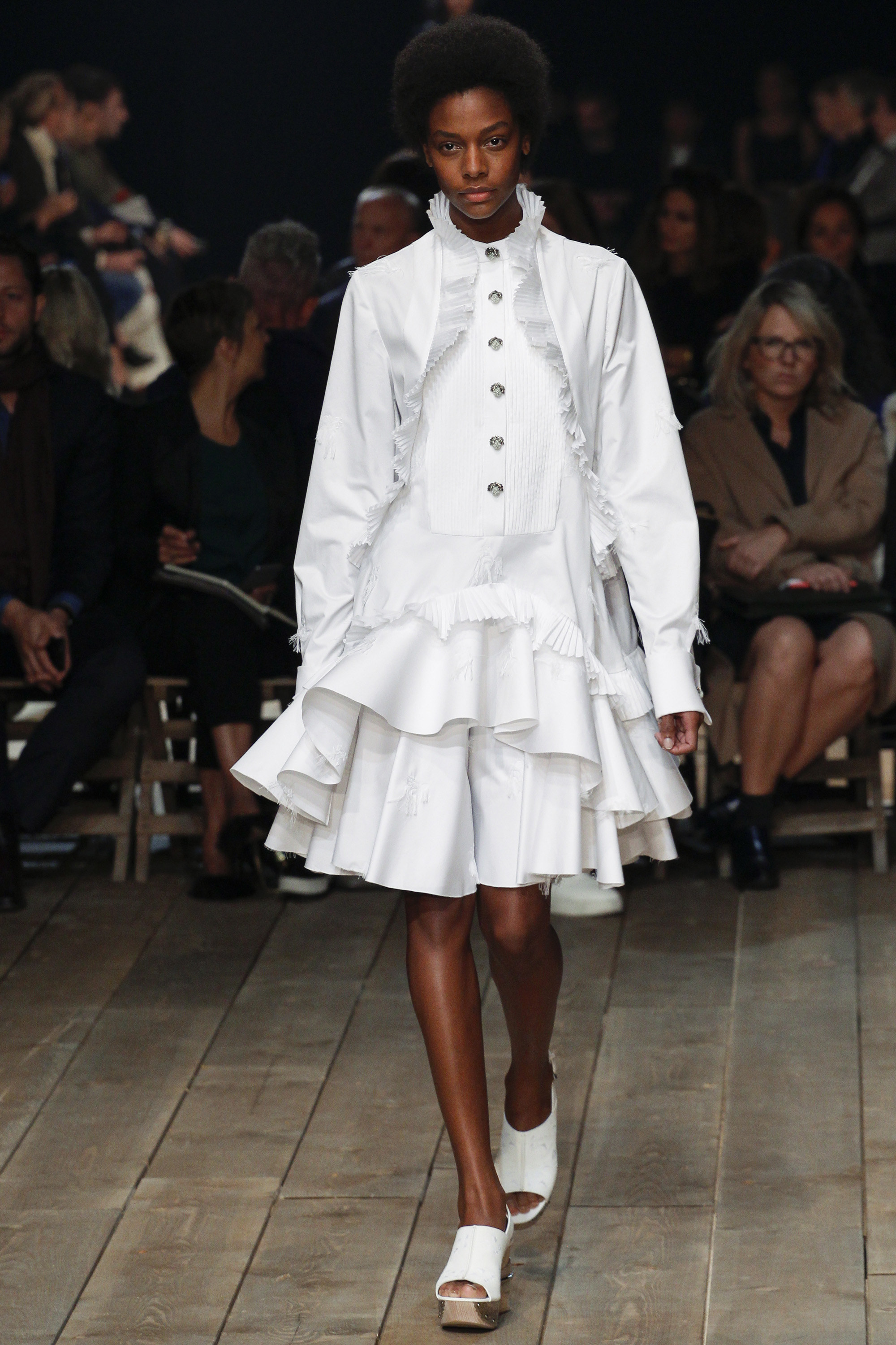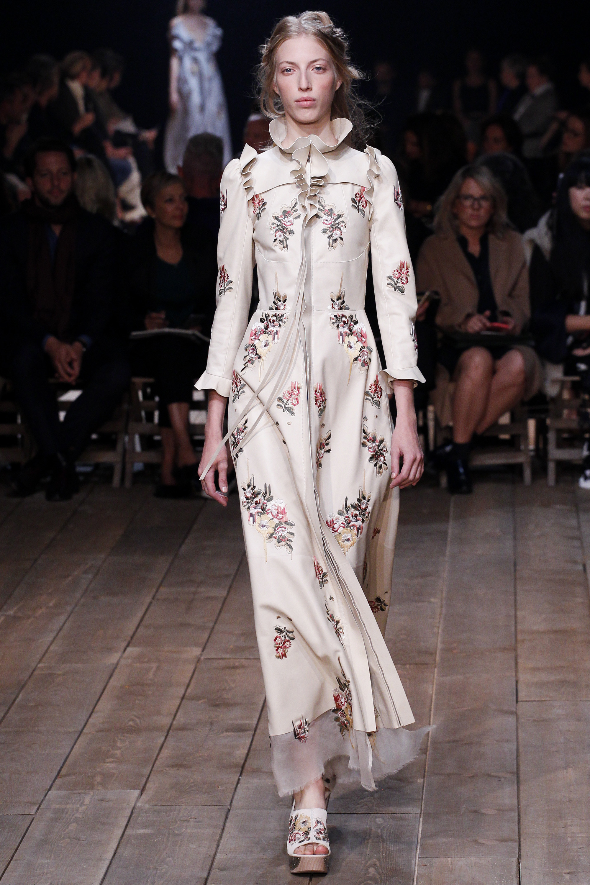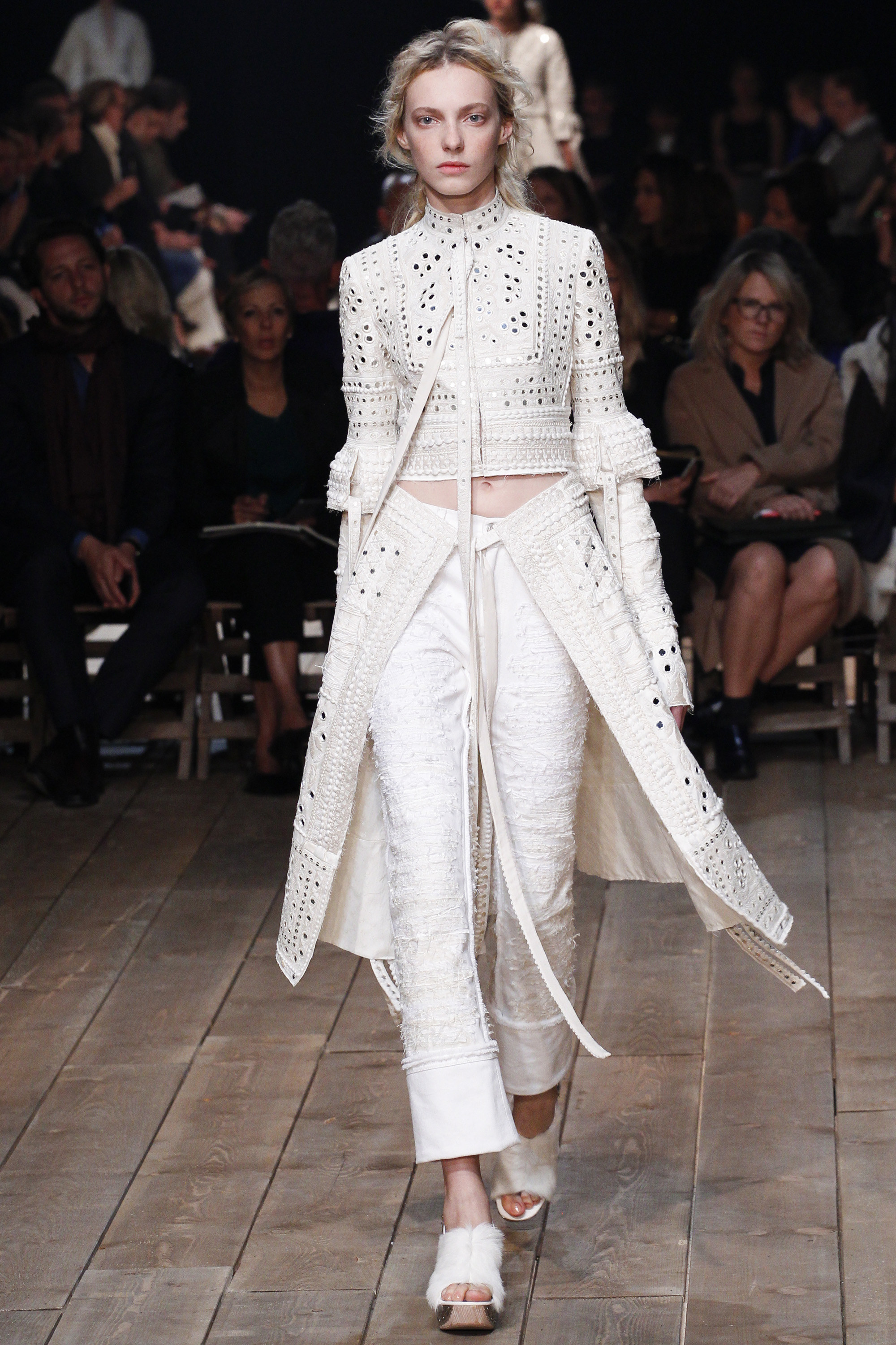 這一次的靈感從Huguenots的遷徙過程出發(十七世紀從法國流亡到英國的新教徒,帶著他們純熟的絲綢工藝,落腳倫敦的Spitalfields開啟了他們安身立命的新篇章),對他們當時十七世紀古典風味膚色罩袍、充滿荷葉邊的長禮服特別有感。從溫柔的力量開啟這個系列,隨即出現剪裁精準的白色外套配長褲,但是參雜了金屬鎖鏈增添些許剛強氣息,再到刮起浪漫風暴的膚色蕾絲長洋裝外搭不對稱紅白配色騎士外套(這外套太好看),都在女性柔美元素當中融入不同個性,其中在丹寧面料上縫上精美刺繡的設計有著閒逸的華美感,相當好看。