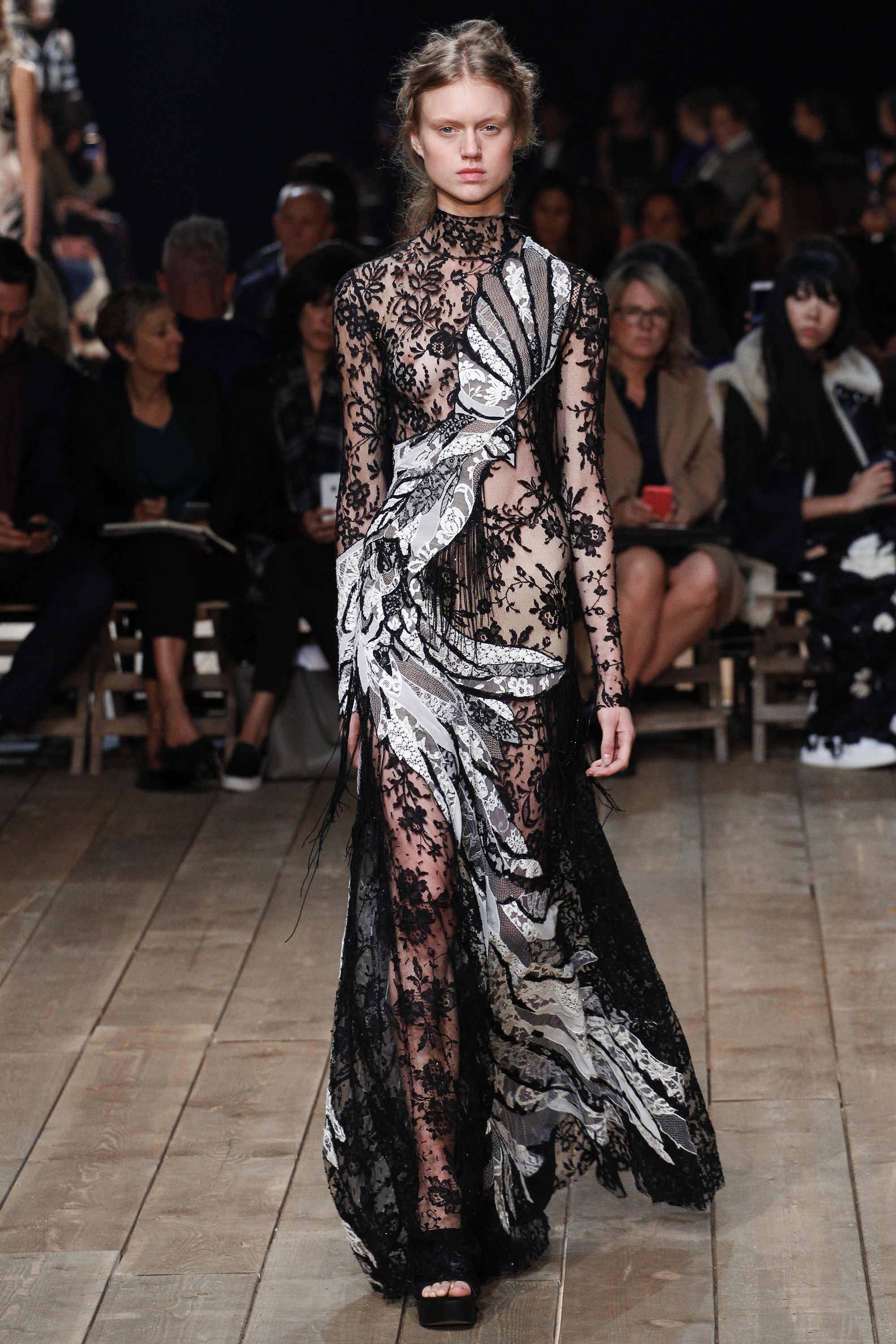 我特別喜歡一襲黑色蕾絲的洋裝上面用白色蕾絲組成一隻巨大的靈雀,有著溫柔的細膩,同樣有著Alexander McQueen經典的鳥類與羽毛元素,這一件看著看著我突然有點傷感也有歡喜,傷感英才早逝,歡喜後繼有人;這一套洋裝有著白色的相對版本,一樣好看到嚇人,好想看Rooney Mara來穿喔。