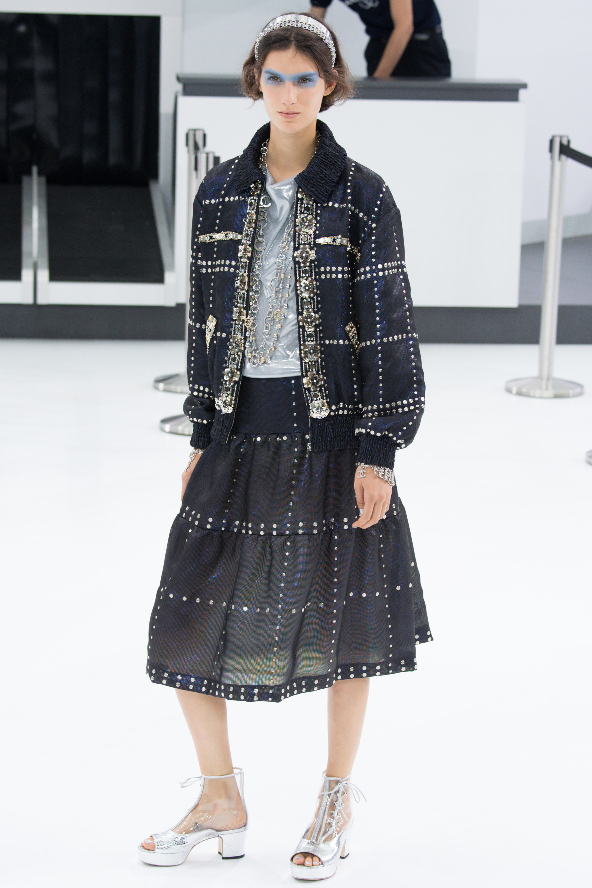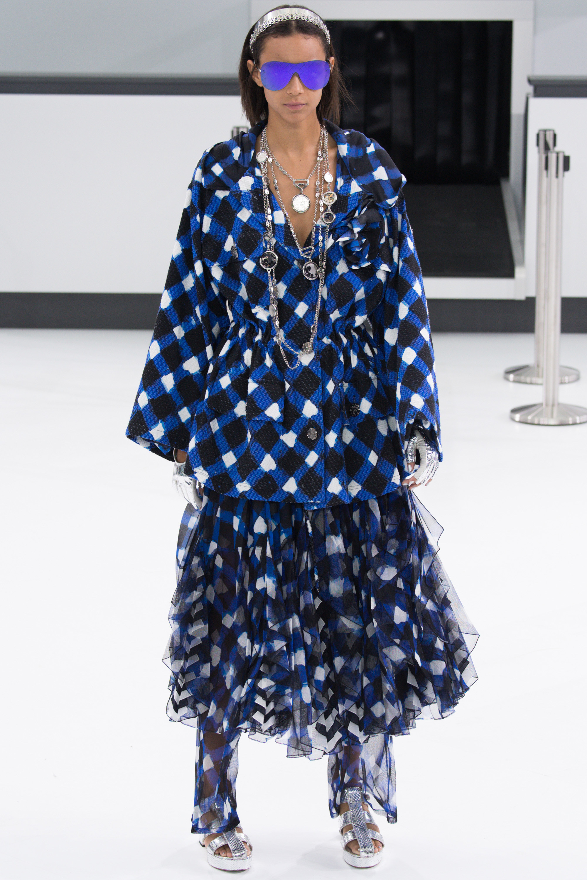 回歸到衣服上,我其實蠻喜歡這一次的系列(除了中間有點像是霓虹或是什麼玻璃紙面料那一段看到讓我出神以外),其他的單品都很有設計感、很有Chanel style,也很和主題扣合,當然,實穿度也很高。最直觀的,就是把飛機當作印花印在衣服上,這個用法出現在許多的單品,無論是外套、洋裝還是連身褲裝上,我喜歡這樣青春帶著運動風的打扮;或者是把招牌斜紋軟呢(tweed)無所不用,搭配上早春繽紛的色彩,同樣有著擋不住的歡欣氣息。系列當中單寧的部份以及成熟一點的單品,像是標準的全身Chanel look配著禮帽,也都非常吸引人。