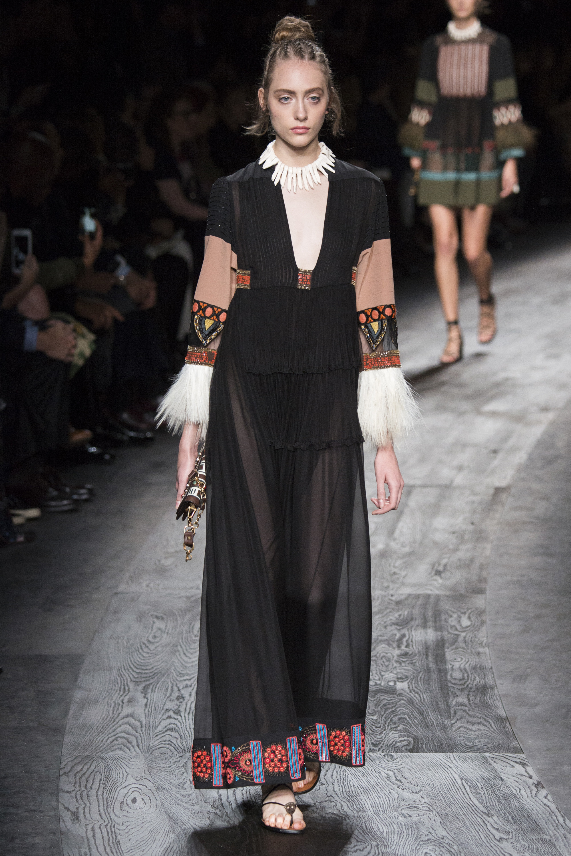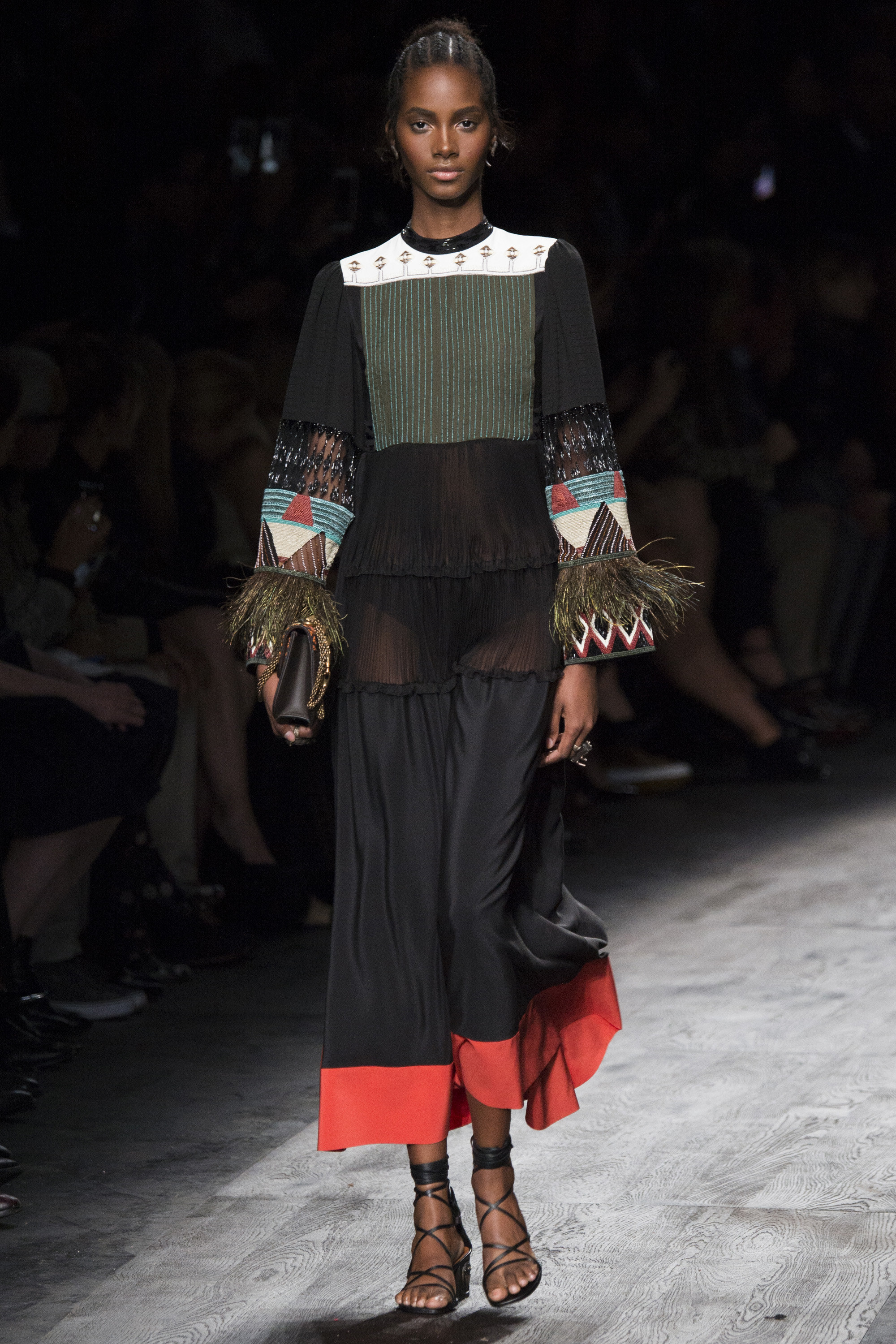整個系列保有我們熟悉的Valentino充滿仙氣的神聖輪廓,但是在細節上的組成卻融入了強烈的非洲民族風。於是我們看到了斑斕的色彩、圖騰的組成、色塊的組成、短羽的層次這些顯而易見的元素,還有很多像是壁畫上的圖案做成洋裝,除此之外,也看得見把非洲的戰士服裝元素和羅馬神鬼戰士的概念重合的洋裝,這樣的組合讓整個系列看起來相當有生命力,同時又帶著優雅、大器的風格(雖然有一兩件讓我想起Reem Acra的樣子)。這系列絕對會大受歡迎,但很挑人詮釋,讓我們一起期待這些服裝在紅毯上被詮釋的樣子吧。