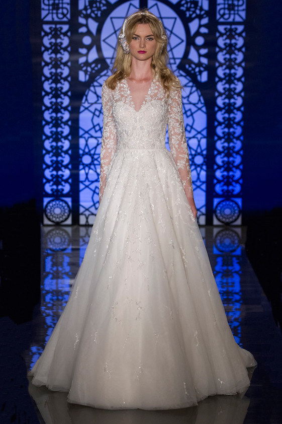 Reem Acra 這一次的婚紗有一點點不一樣,設計師試圖把「睡衣風」這個方興未艾的流行風潮融入,雖然華麗感依舊,但是就多了一點輕巧感,透視感的運用讓婚紗更多了一些具誘惑味道的性感。