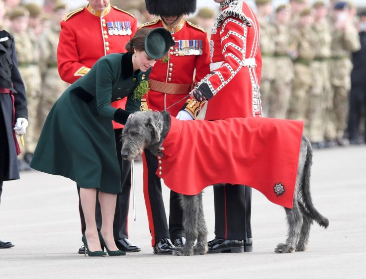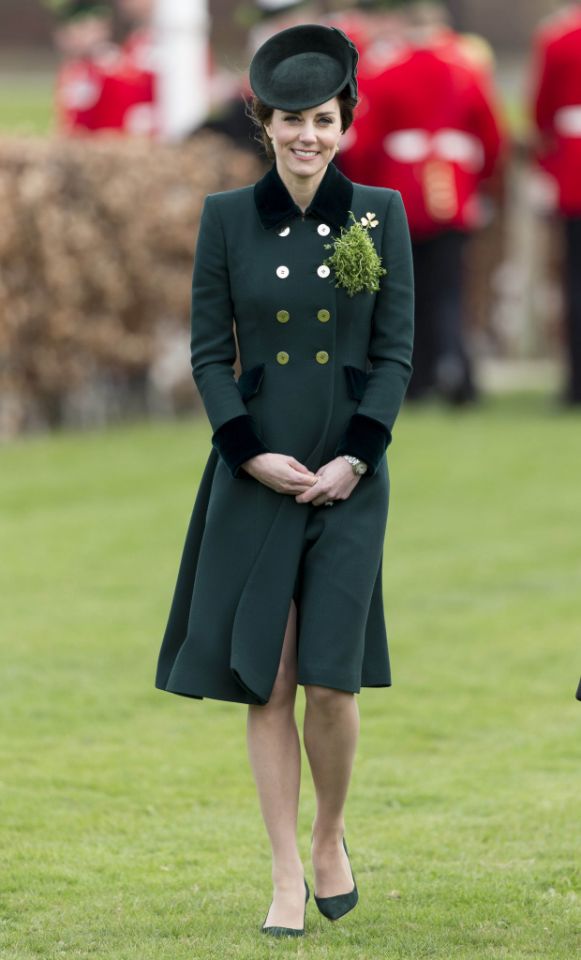 凱特王妃 Kate Middleton 在 St. Patrick’s Day這天,按照習俗穿上了綠色套裝;這套是來自 Catherine Walker,然後搭配同色系的 Gianvito Rossi 的高跟鞋,端莊大方有氣質,領口和袖口的黑色配得真好。(胸口的三葉苜宿也是點題!)