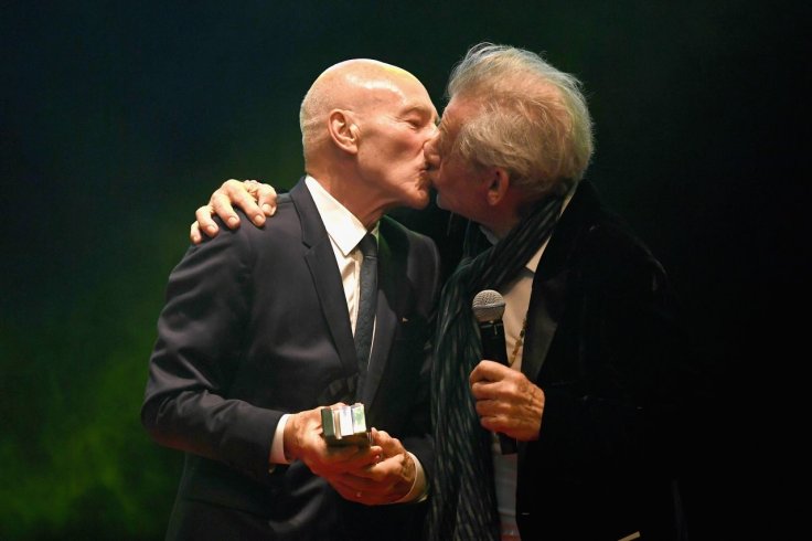 X教授 Patrick Stewart上台領取 Empire Legend獎時,又和好兄弟萬磁王 Ian McKellen呈現吻你千遍也不厭倦的畫面(手比愛心)。