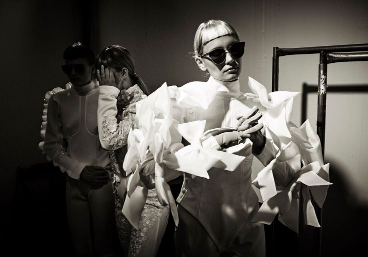 第二套是由 Zaldy與 Gentle Monster合作的擊劍裝非常醒目,華麗如摺紙藝術的蝴蝶結袖子好美;翅膀面罩則是出自 Stephen Jones Millinery的作品,這一套很撐得起「Bad Romance」這首歌!