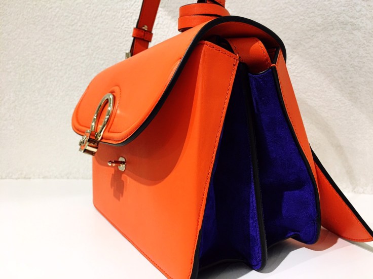 DV One還有一個比較厲害的版本,就是包面有皮革製成的立體花繡的這顆。只看到照片時,我心裡還有一點疑慮,但看到包本人以後,瞬間烏雲退散,感到相當驚艷!優雅中帶著成熟的嫵媚,原本那一絲絲會不會過熟的想法早已湮滅;藍、黃、橘的配色讓包包生動活潑、層次豐富,是顆個性豐富又吸引人的包(因為花繡,為了避免太過浮誇,這顆在側邊就不做撞色處理,讓重點得以一目瞭然)!