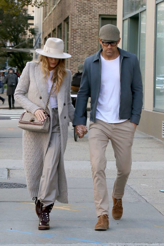 Blake Lively,今天和腦公 Ryan Reynolds一同上街時,穿了 Max Mara 2017秋冬的大衣和長褲,好輕鬆大方悠閒的一套,好喜歡帽子,包包也是同色系搭配過的 Bottega Veneta 2018早春的編織包,鞋子有點兒小突兀但很真實,老公怎麼臉臭臭,來,我給你呼呼😘😘😘