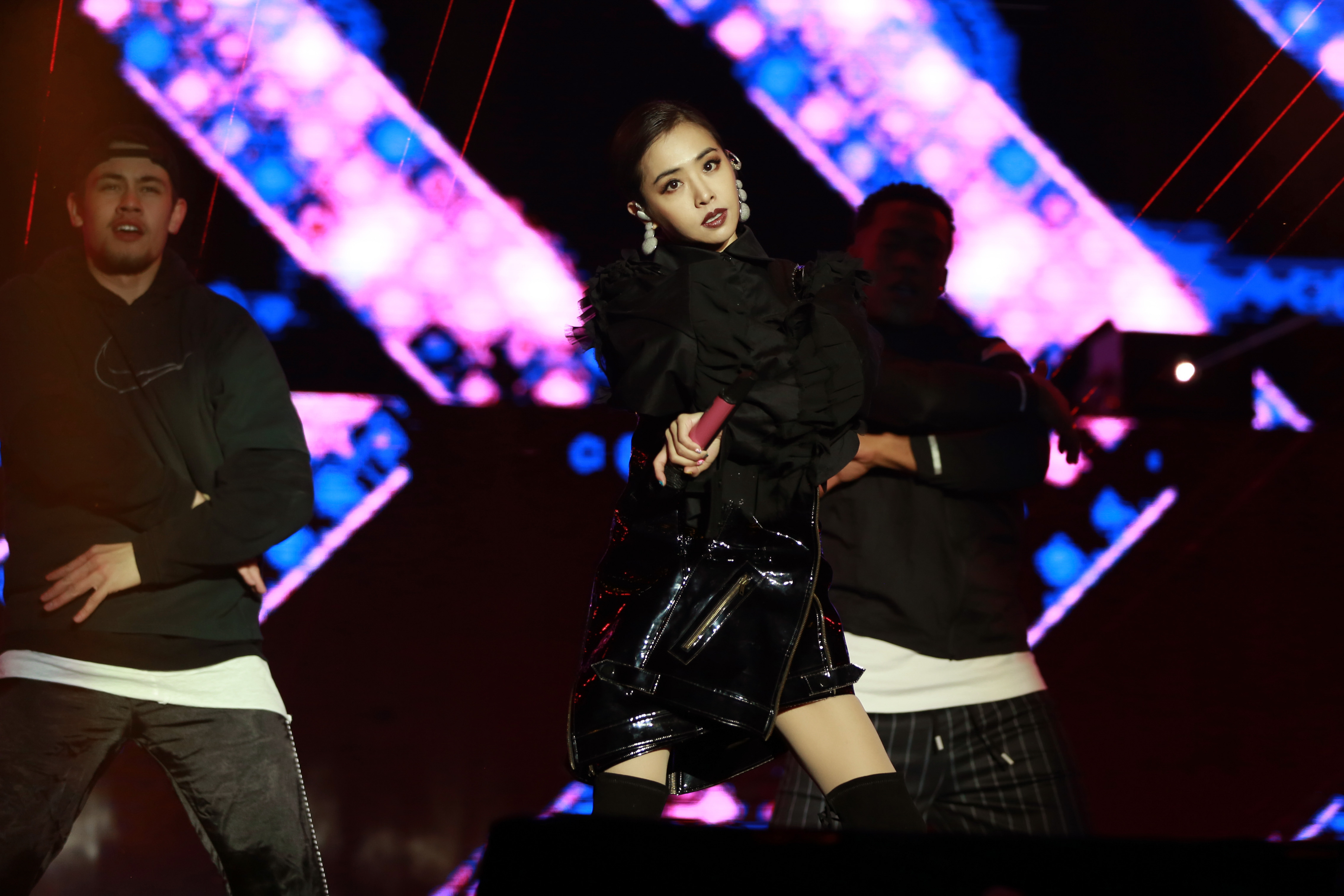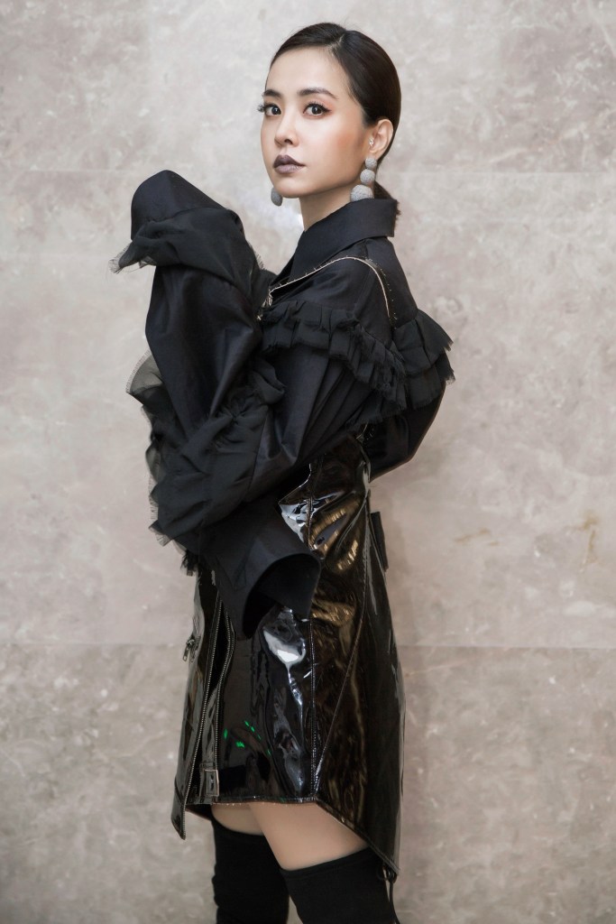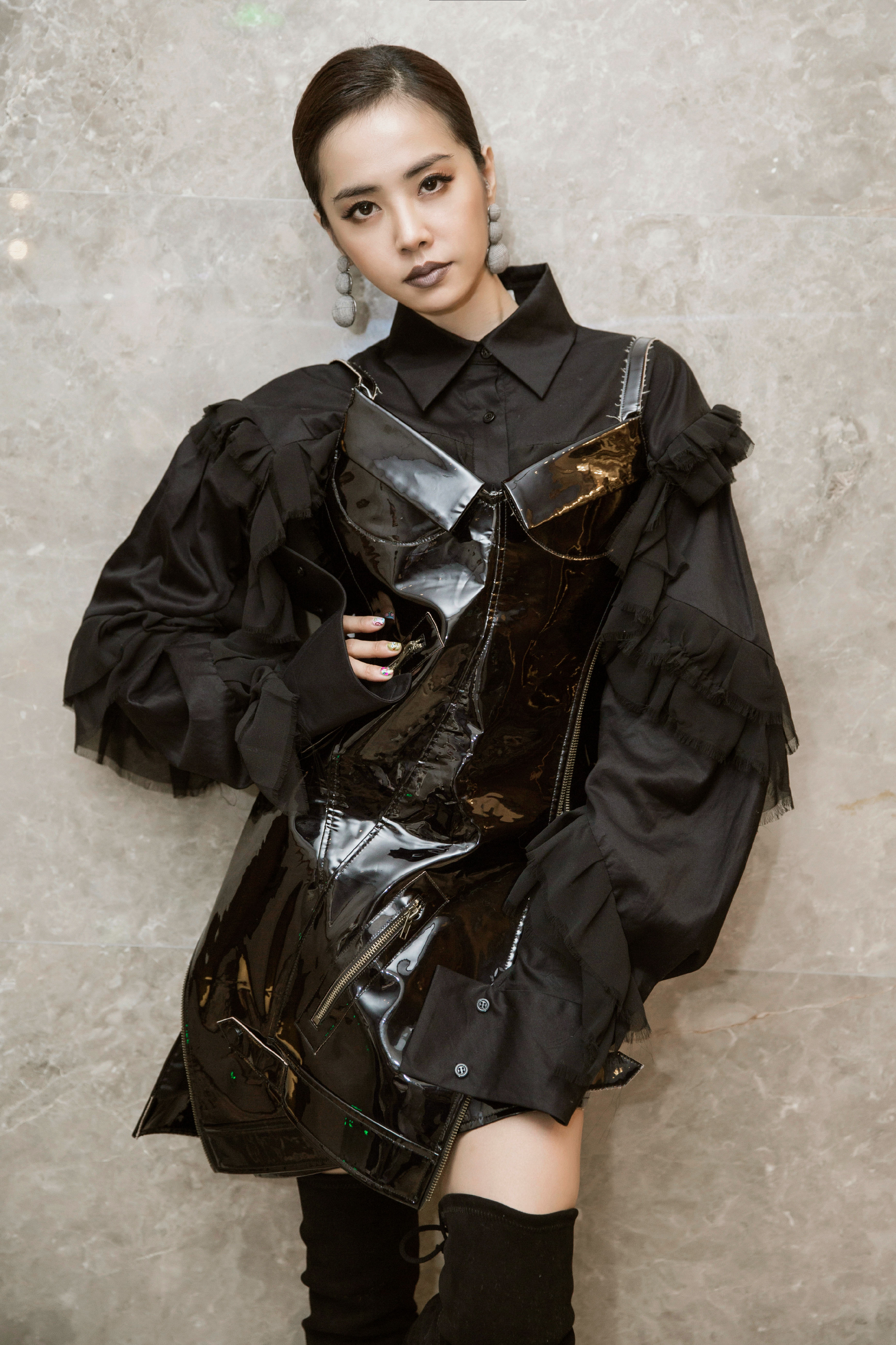 Jolin 蔡依林在鄭州的表演走一個冷漠搖滾女王的路線,身上這件 Masha Ma 2017秋冬的洋裝又有浪漫的荷葉邊又有性感搖滾的漆皮洋裝,有點衝撞,再配上超長靴子,很酷!