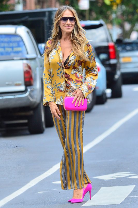 莎拉俊雄 Sarah Jessica Parker以 INTIMISSIMI的睡衣,搭配她自己品牌 SJP by Sarah Jessica Parker 的桃紅色高跟鞋和手拿包,有種家庭聚會中總有個覺得自己很時髦的阿姨感捏…(然後大家都會陪笑說對啊,妳好時尚喔這樣