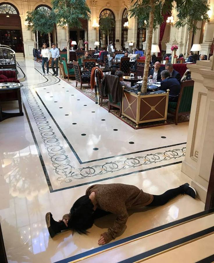 欣賞她下飛機以後馬上在飯店大廳劈腿舒筋暢骨的自在(笑