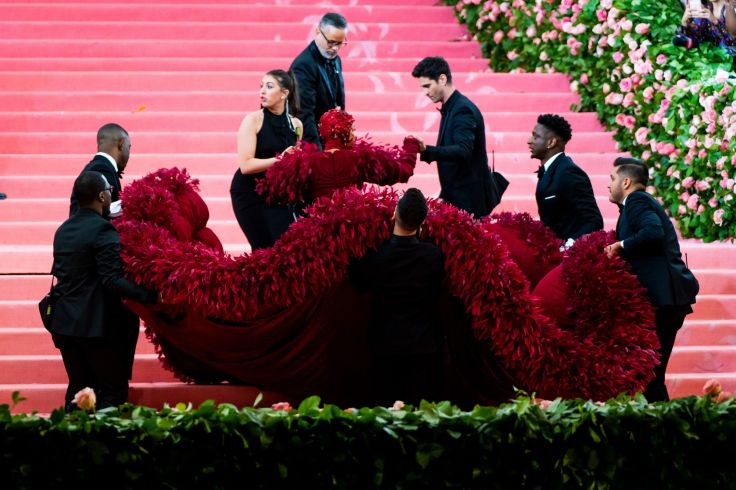 Cardi B今年在Met Gala的戰袍來自 Thom Browne 2018春夏的延伸設計,這件乍看之下有一點像是時尚蕭婆 Rihanna當年的烘蛋裝,但是這應該是巨大的大王花吧!這一套衣服用了三萬根羽毛製作而成,也是浩大的工程,厲害。