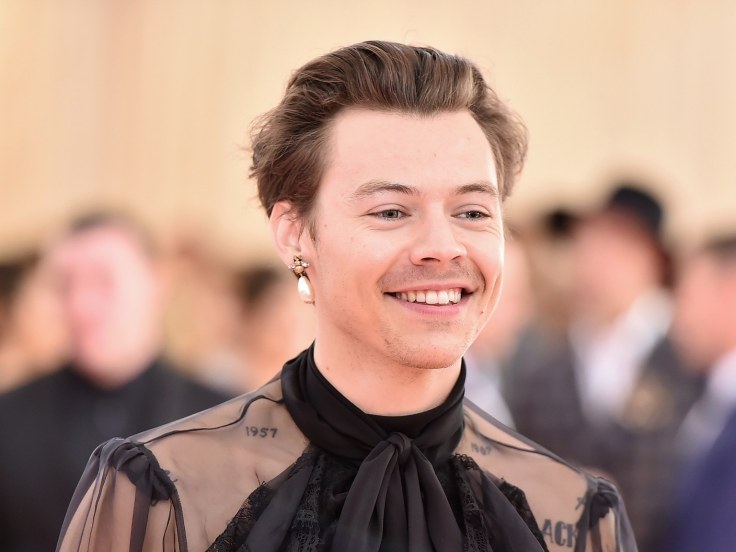 而Harry這身蕾絲連身褲裝有一點2019秋冬的輪廓,把柔美和柔媚穿上身,還擦指甲油,有突破!