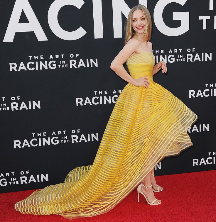 哎呀! Amanda Seyfried 出席電影「The Art of Racing in the Rain」世界首映時,穿了 Oscar de la Renta的黃色條紋禮服,這件洋裝的剪裁以及顏色讓人看了心曠神怡,心情很好,加上帥氣男主還有兩位毛孩,太美!