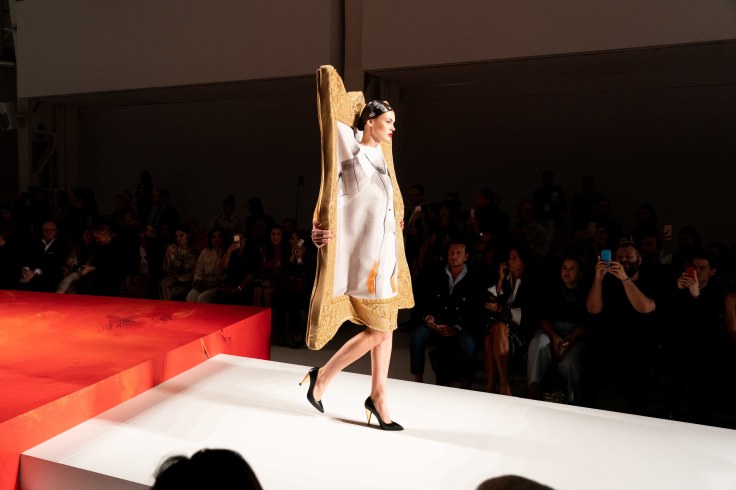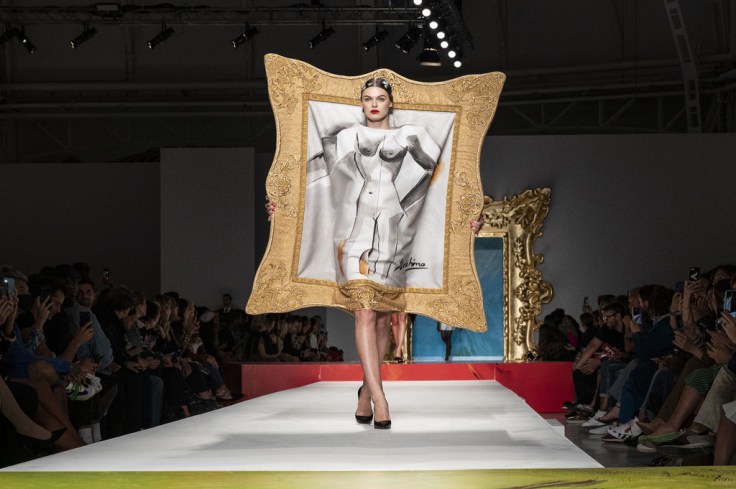 登等登等!!! Moschino 2020春夏女裝是以畢卡索的畫作為靈感,創造出許多超現實/現實交錯的作品;這一件出現時我在心中喝了一聲采,這件真厲害,畫框是展示畫作的邊界, 內容也是把藝術的界限融化。瘋,但很棒。