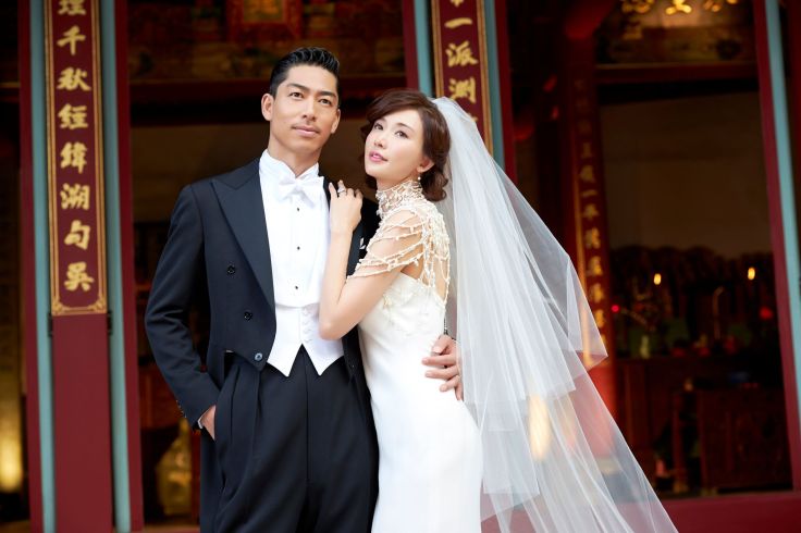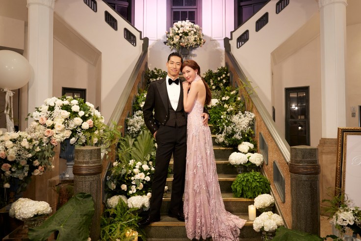 這對新人都穿上了 Ralph Lauren,姊姊是訂製的婚紗,純白高雅的緞面禮服加上以手工縫上的珍珠,氣質更是加分;姐夫這套西裝燕尾禮服把帥氣做了最好的示範。