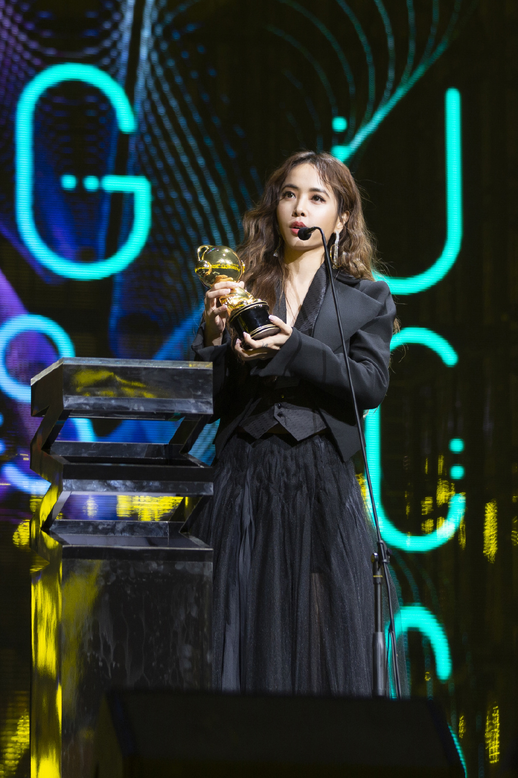 蔡依林表演後又換了一套黑魔女裝;這是由 Ralph Lauren 2019秋冬的兩個looks組合起來的look,這兩個looks拆開來看我覺得都非常好看,一個倜儻帥氣,一個俐落性感,組合在一起之後似乎有點太多了一點齁。