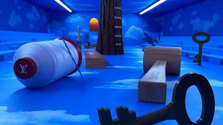 Virgil在我們身處的這個塵世中,打造了一個天堂。在秀場中,遍佈了許多別有用心的道具:放大版的剪刀、工作台、鉛筆、釦子、線,這些都是LV皮匠日常工作的器具。