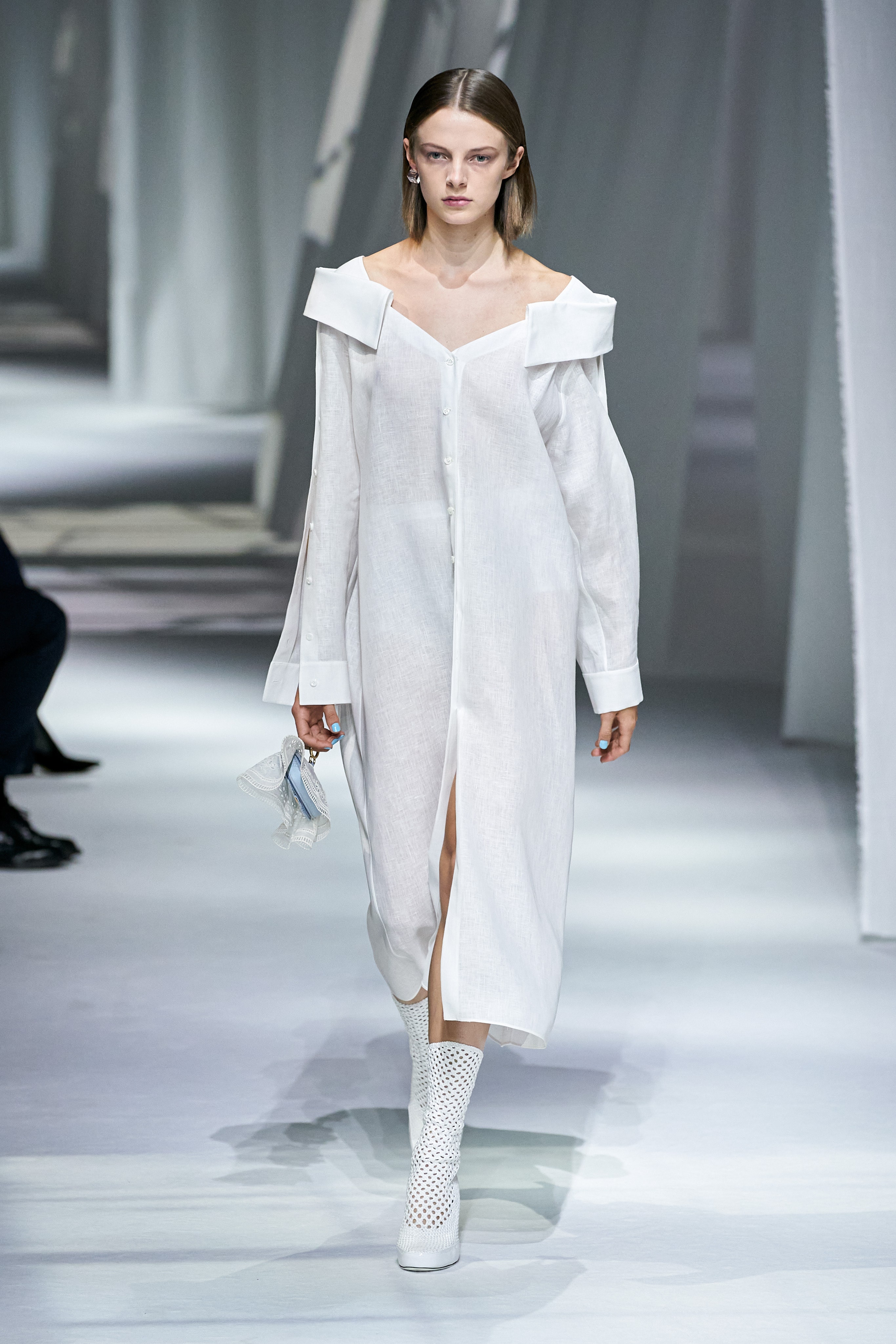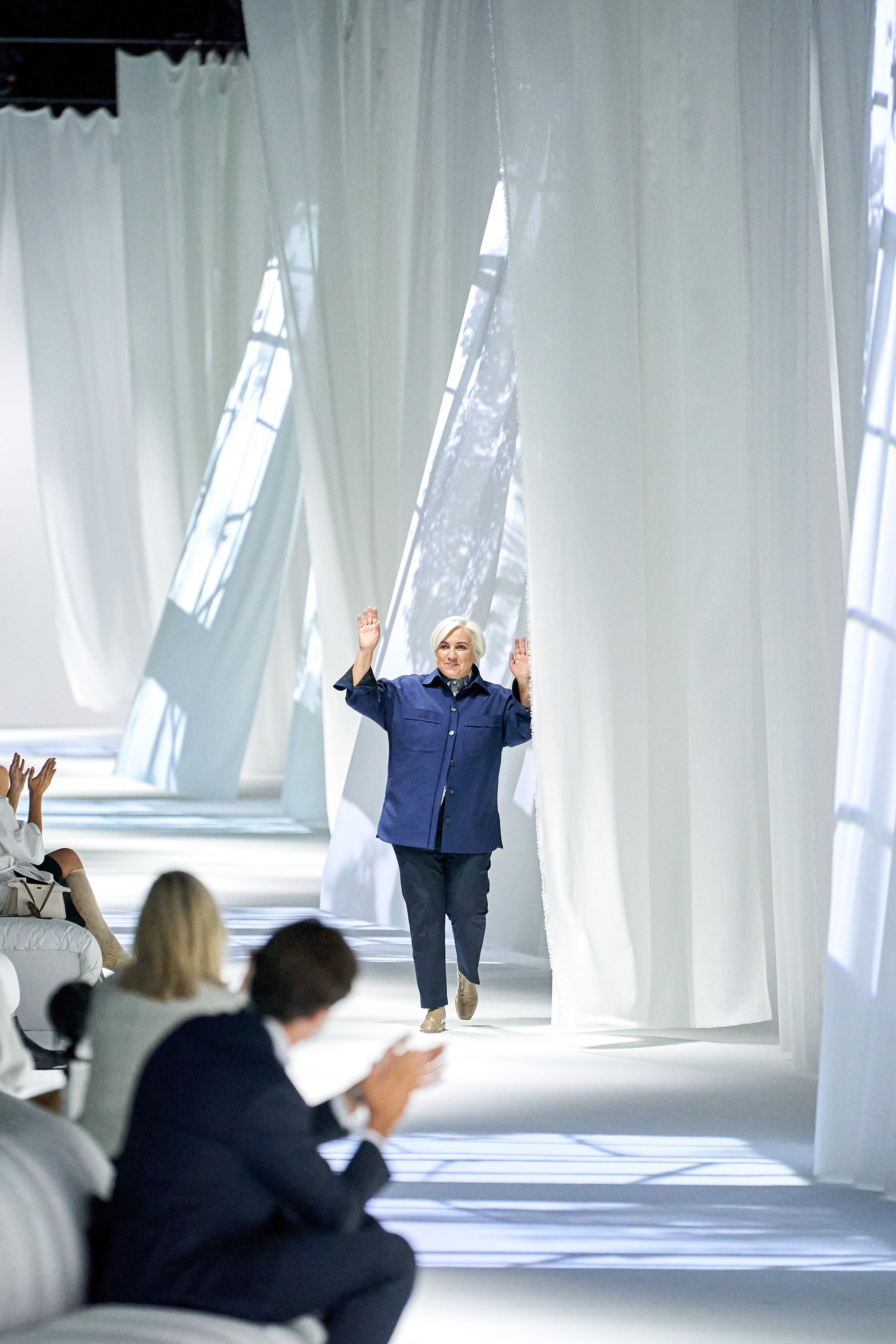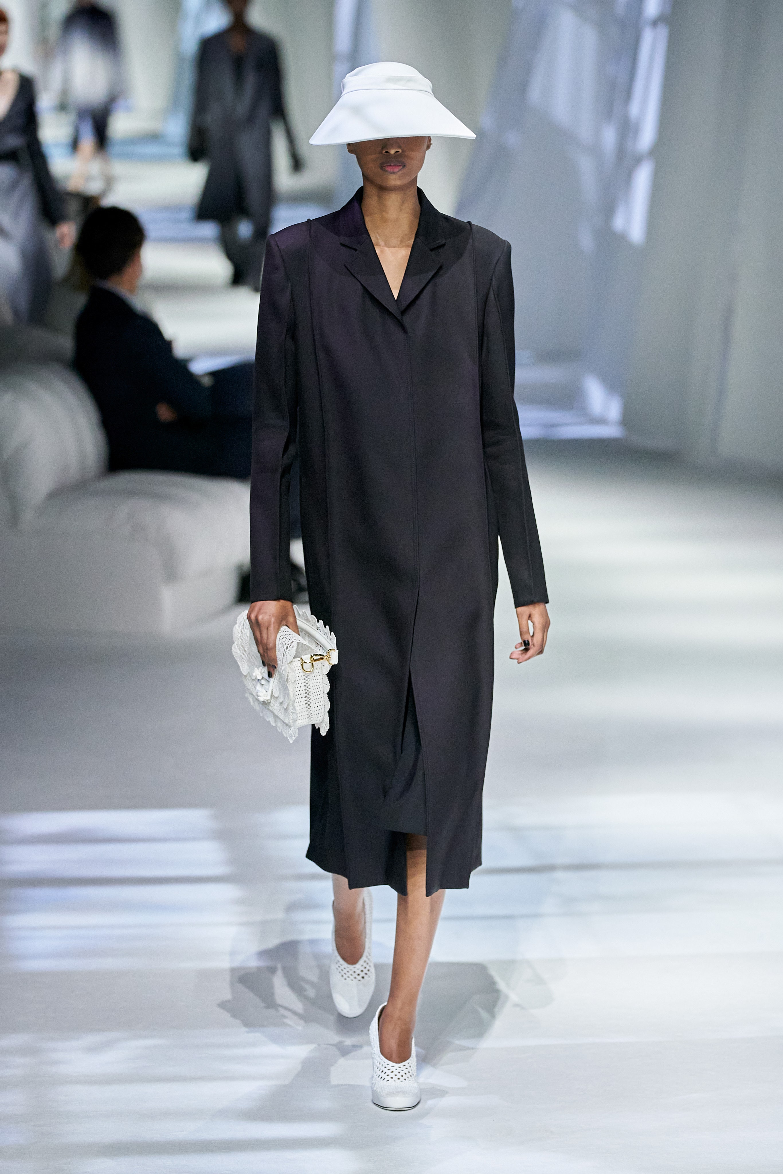 秀場的擺設輕柔優雅,在滿滿垂墜的白布上,打上窗愣與窗外樹影晃動的倒影,製造從家裡房間往外看的印象(秀場椅子也猶如家中沙發般);進一層來說,因為前段疫情封城的時期,因為無法外出,在家裡靜靜地、細細地觀察或許原本在忙碌喧擾的生活中會錯失的美好,也趁這段時間,重新往內探索個人與品牌的價值。