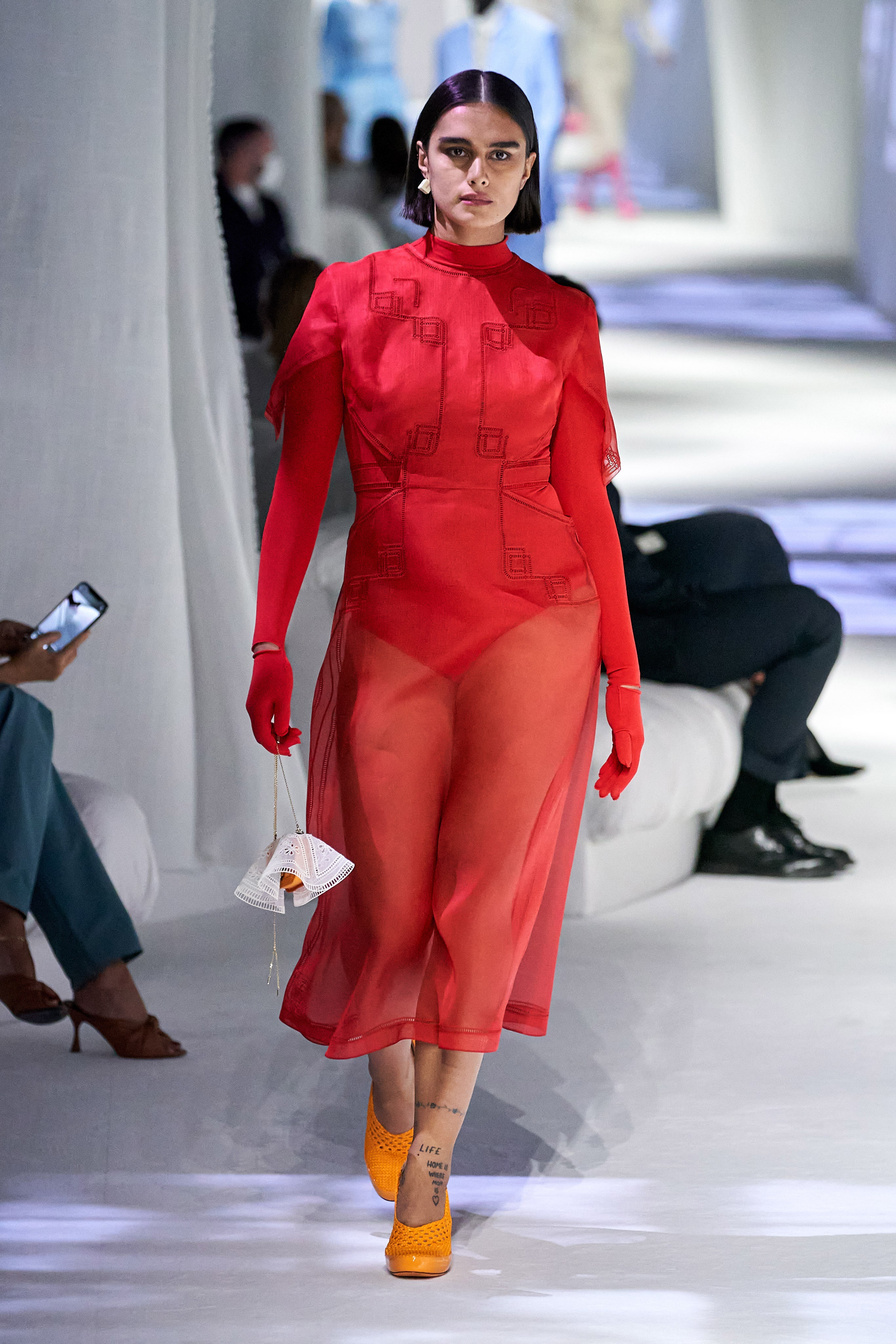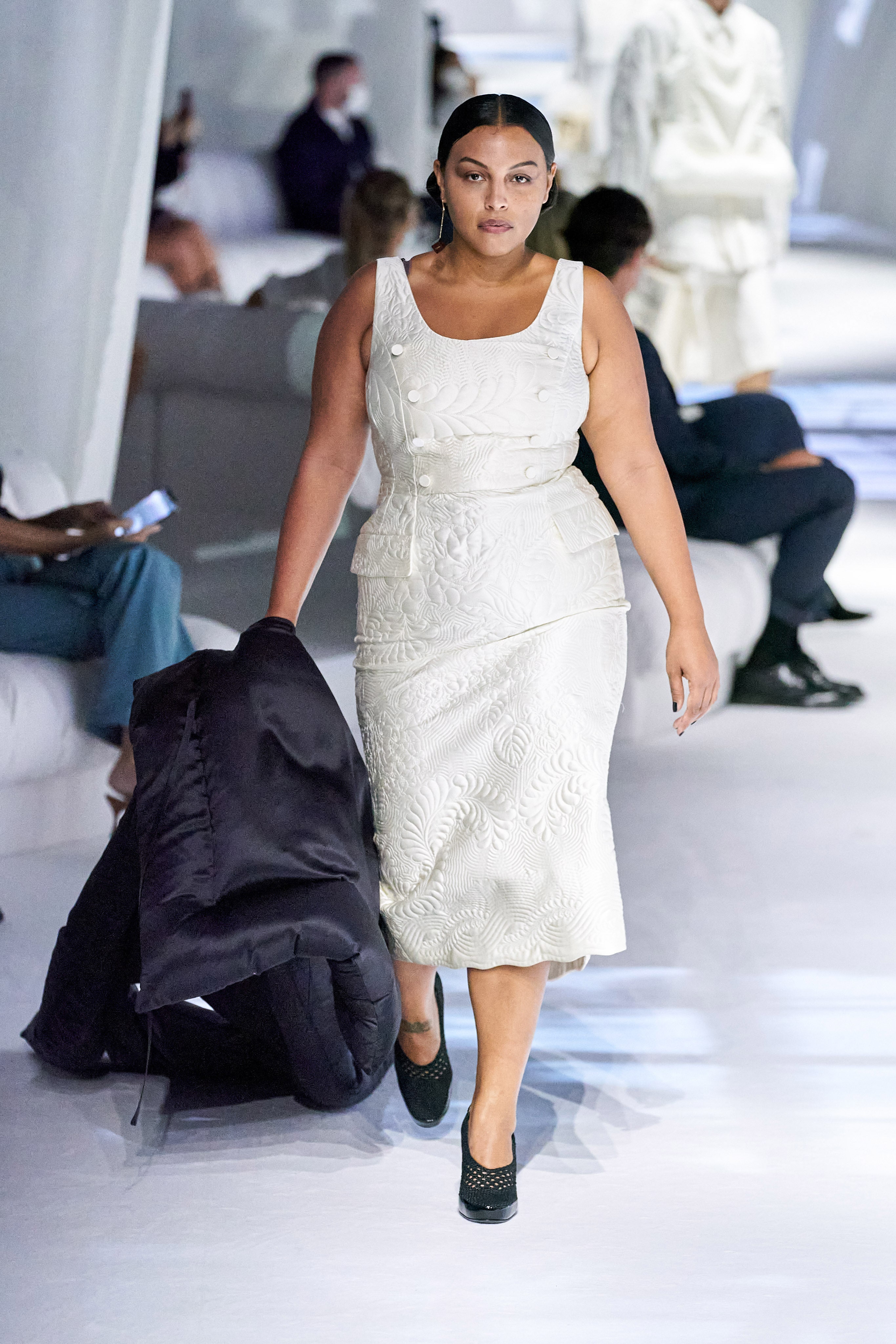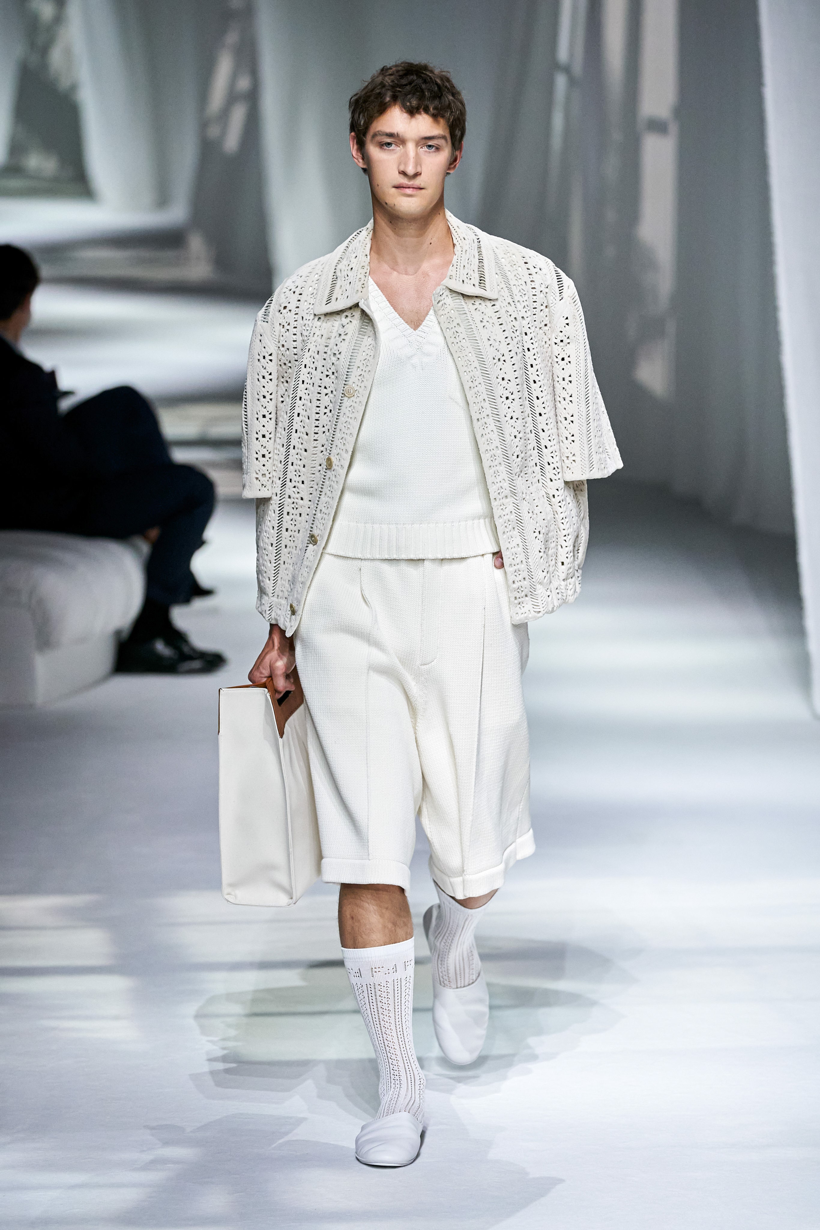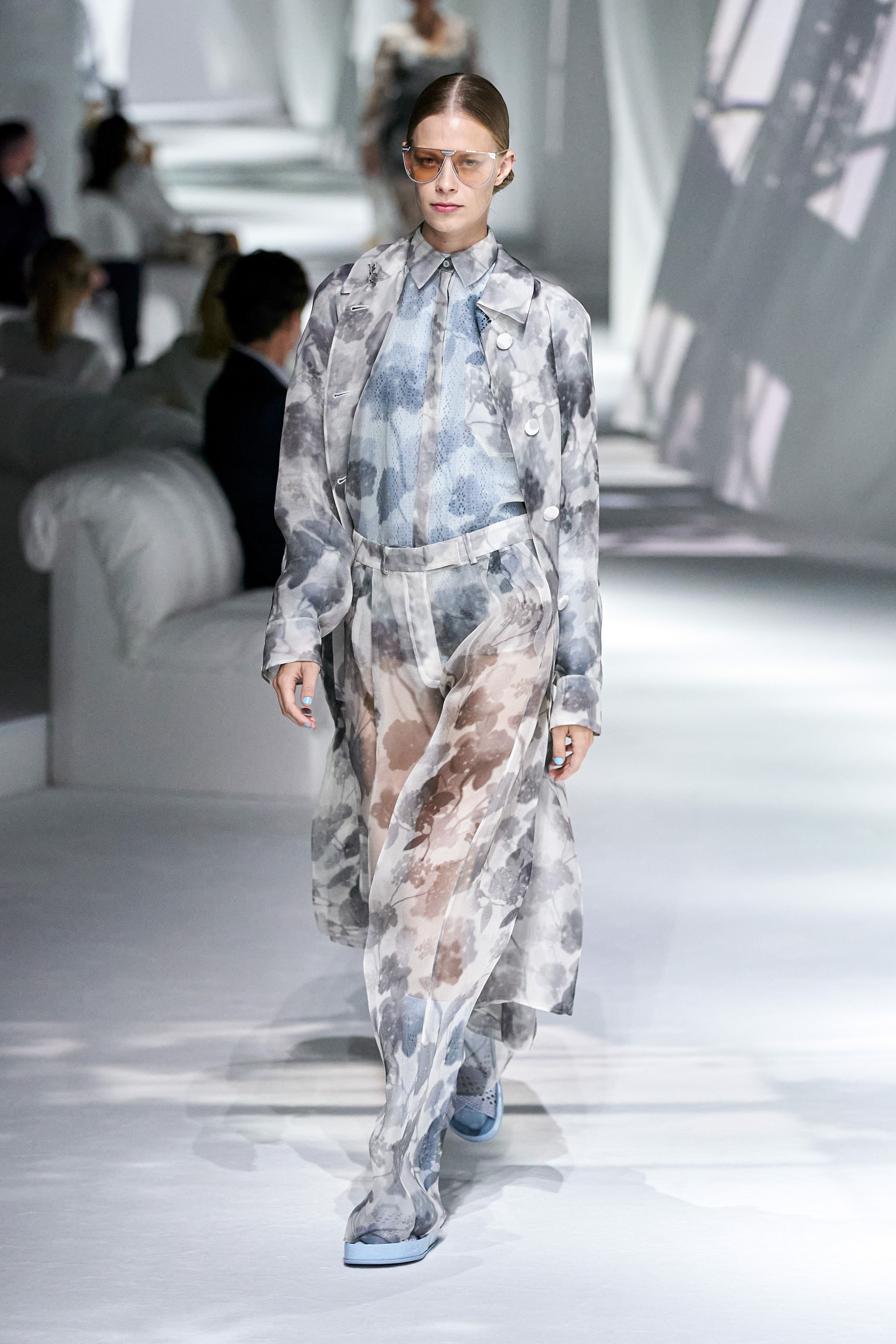 秀場的擺設輕柔優雅,在滿滿垂墜的白布上,打上窗愣與窗外樹影晃動的倒影,製造從家裡房間往外看的印象(秀場椅子也猶如家中沙發般);進一層來說,因為前段疫情封城的時期,因為無法外出,在家裡靜靜地、細細地觀察或許原本在忙碌喧擾的生活中會錯失的美好,也趁這段時間,重新往內探索個人與品牌的價值。