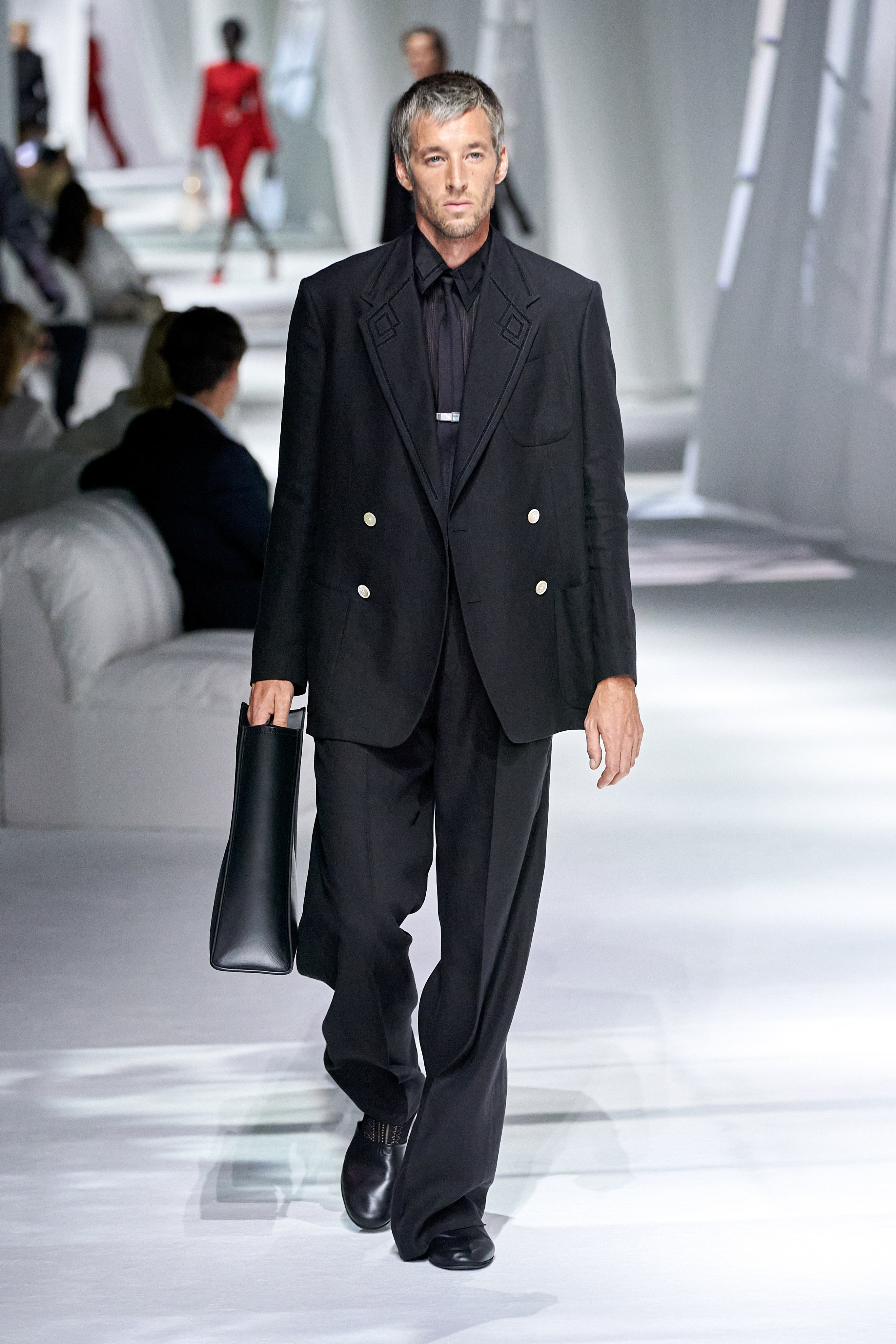 整個系列我最愛的,就是 Mariacarla Boscono 穿的那套白色大衣式套裝(尖叫)!剛柔與氣勢兼具,愛死那個肩線、袖子,如果搭配不同材質的手套與鞋子,就能創造既摩登又性感的樣子,這套必備。