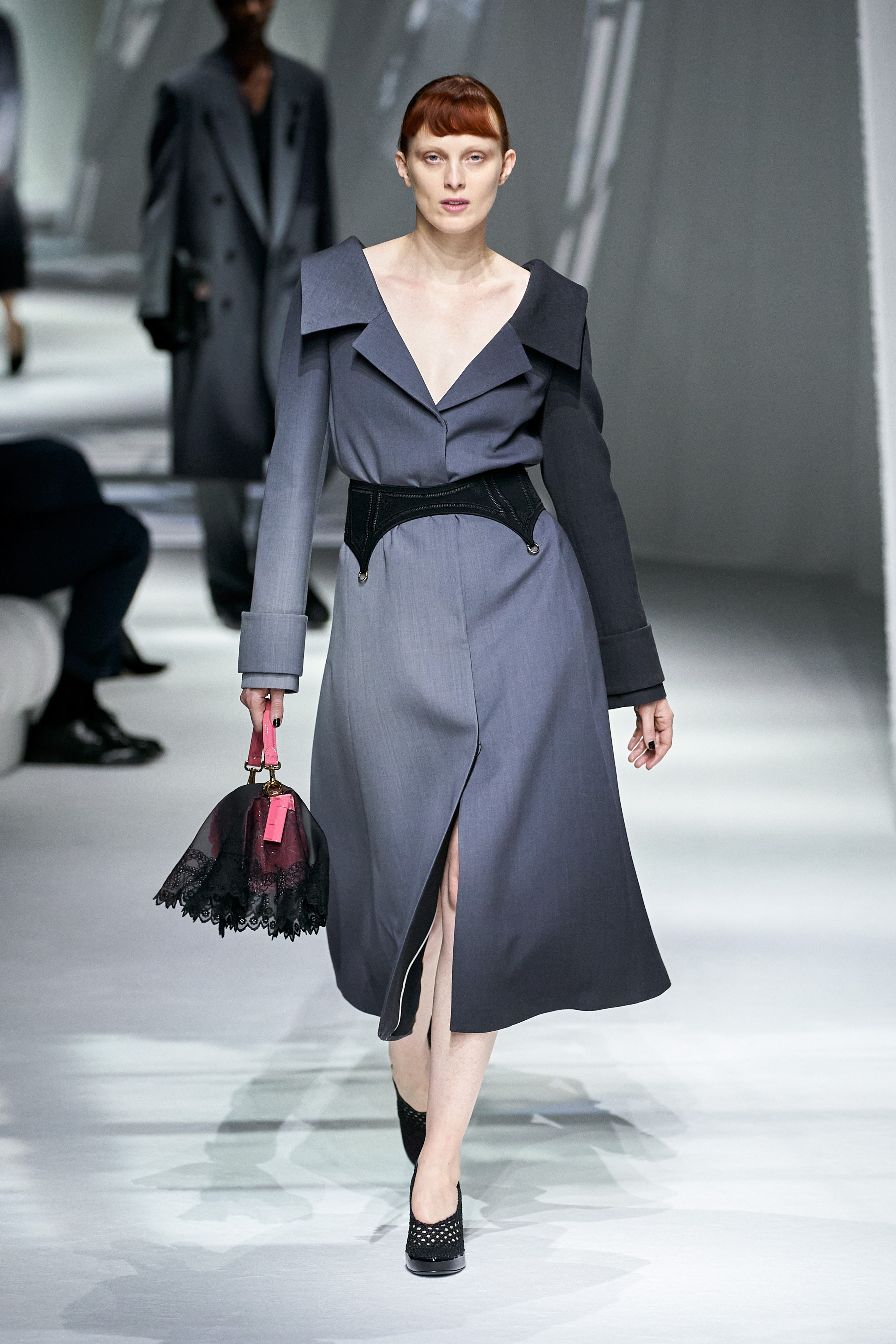仔細看,其實能看出這次的輪廓與線條有許多過去許多季的精華,Vittoria Ceretti那套超難穿的兩側露腰剪裁來自2016春夏(2018春夏也有)、灰色色階的用法來自2015春夏(色階當時刷得較淡),這些都出自於老佛爺之手,而在面料上不但有來自Silvia自己過去兩季的設計,也有老佛爺很愛的桌布與蕾絲大量的使用;這是一次反思與回顧,同時呼應這是她在交棒給Kim Jones前最後一次的作品。