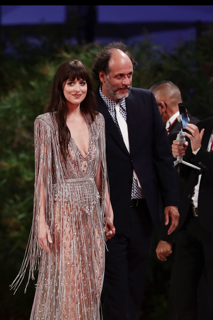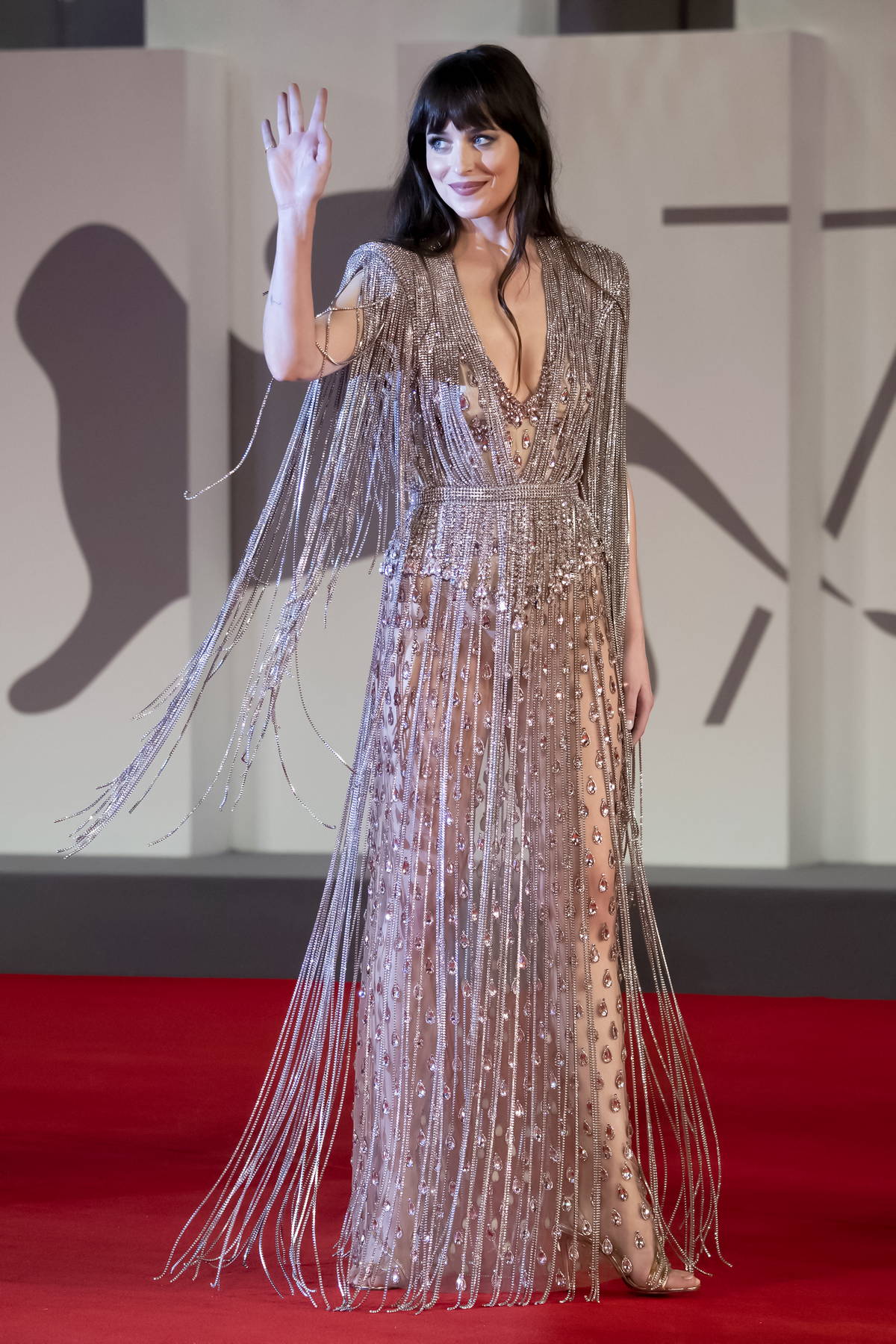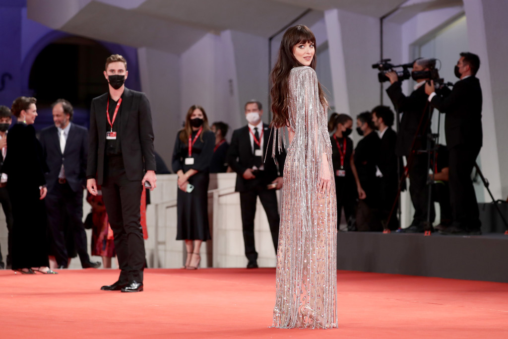 Dakota Johnson 在《The Lost Daughter》威尼斯影展首映紅毯上, 穿的是來自 Gucci 特別訂製的禮服。