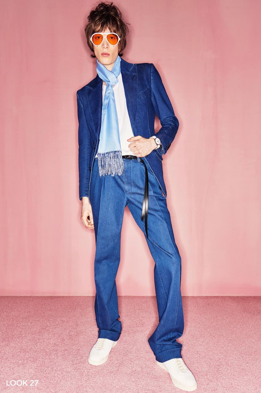 這套應該是由2020秋冬的改良款,看起來是丹寧的面料讓整身西裝乍看很正式,實則帶一點輕鬆感,襯衫微開不使用任何領帶與領結的穿法也帥翻!!!