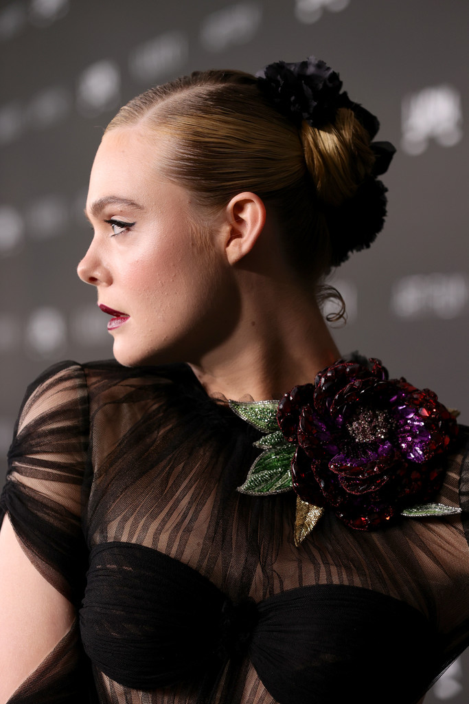 第一位來看 Elle Fanning,她身穿 Gucci 的訂製禮服展現性感,領口的亮片大花增添成熟與華麗感。