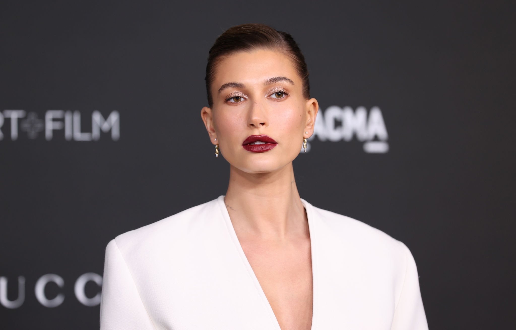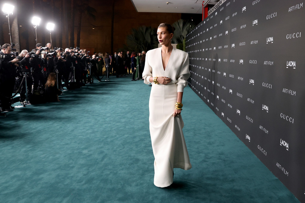 Hailey Bieber 是以 Saint Laurent 2022春夏出席第十屆的LACMA Art+Film 慈善晚宴;這套簡約優雅又大器,超級好看,即使不像秀上搭配較為誇張的耳環與項鍊,依然好美!