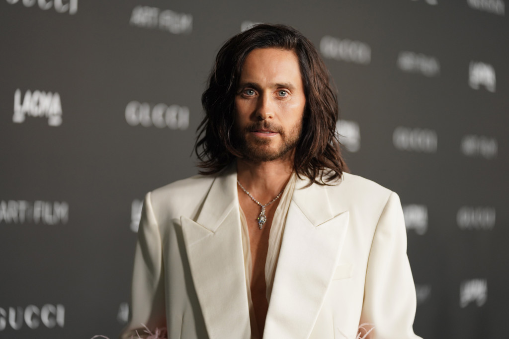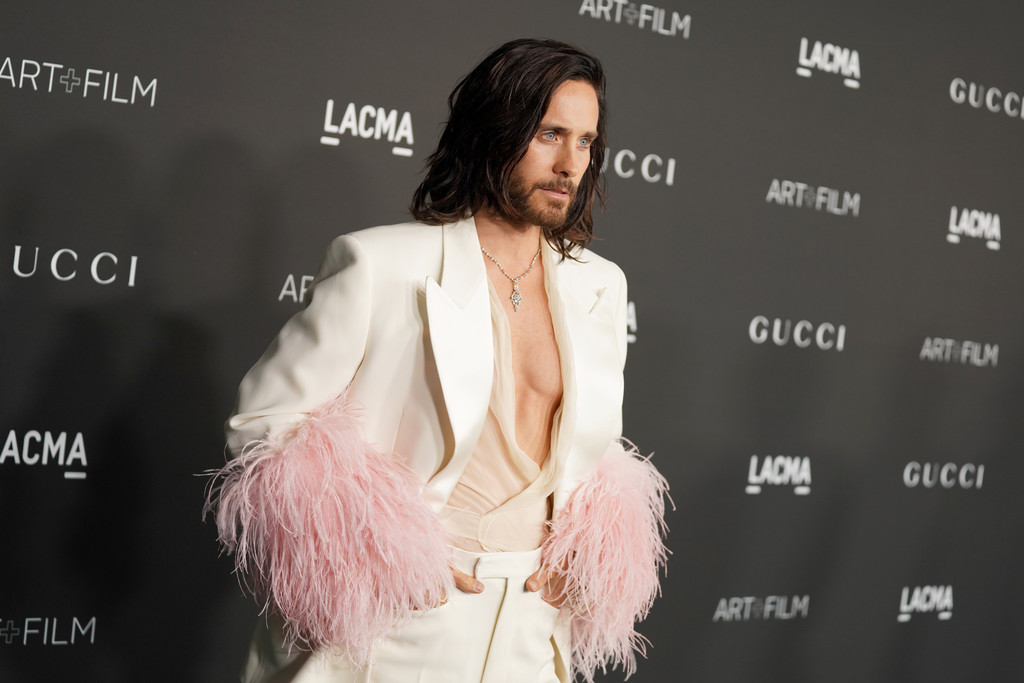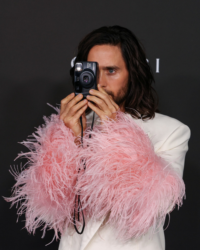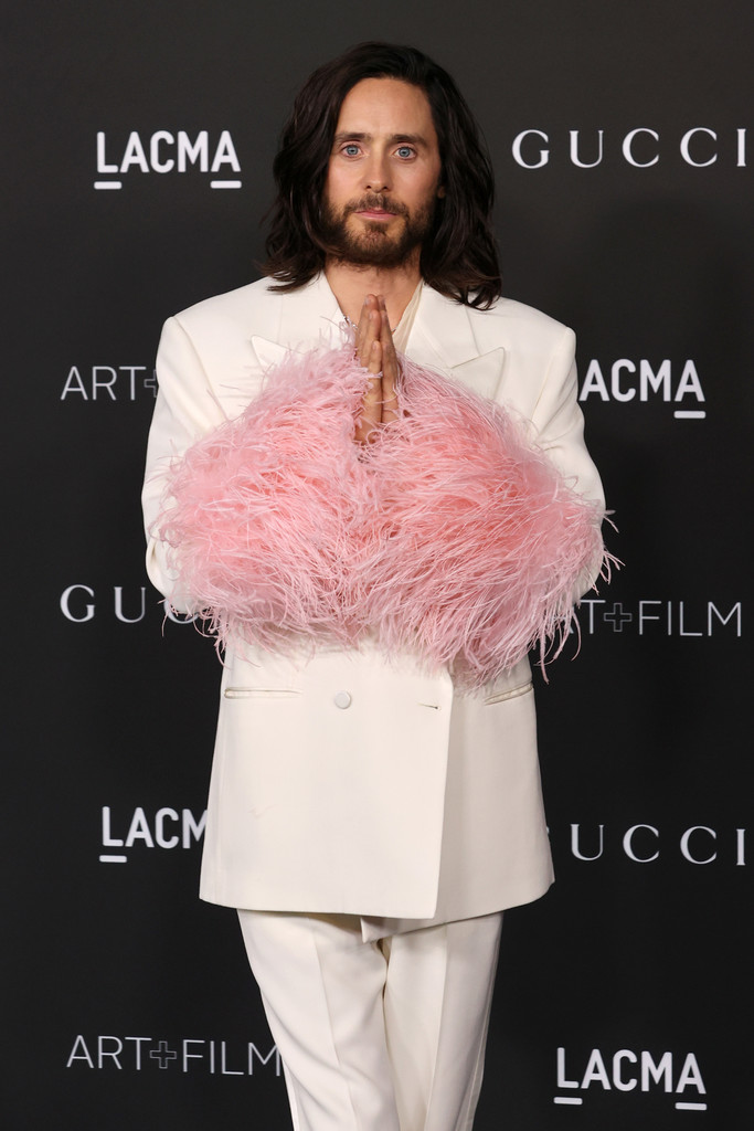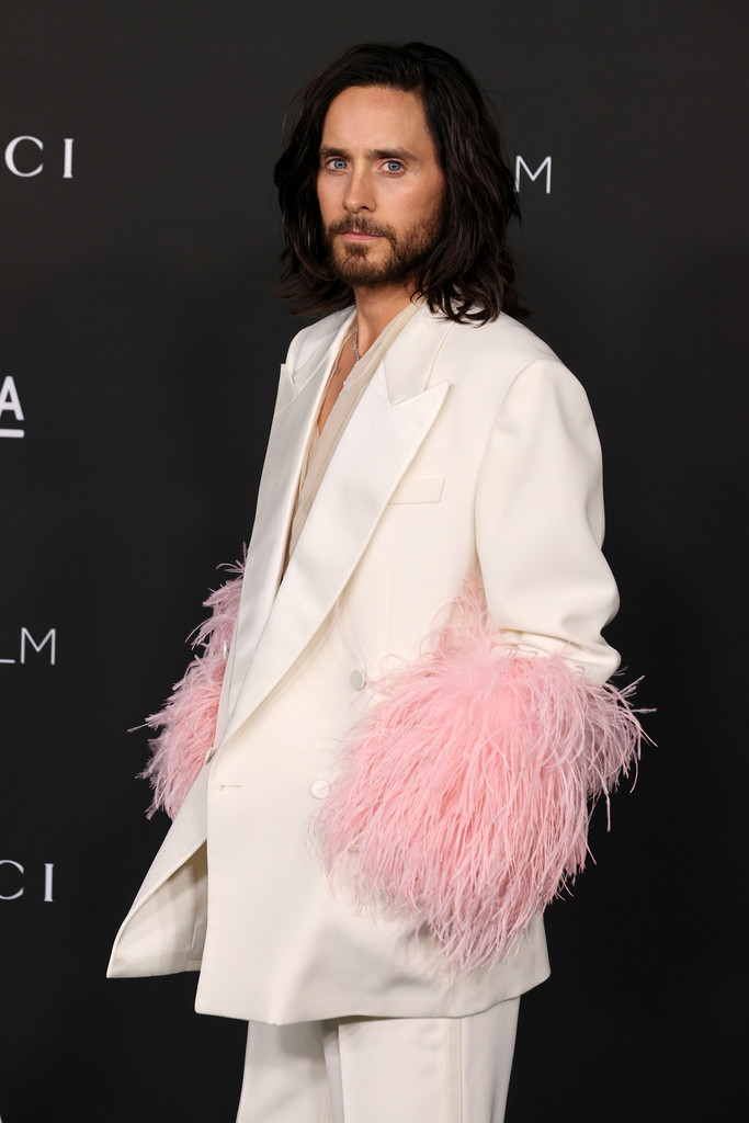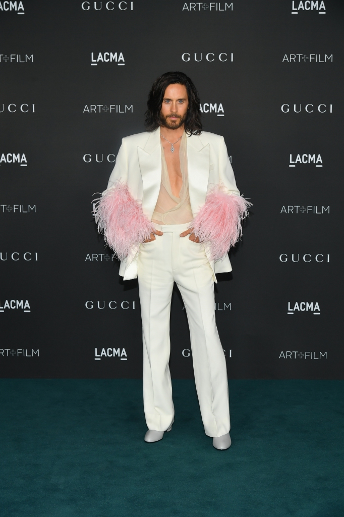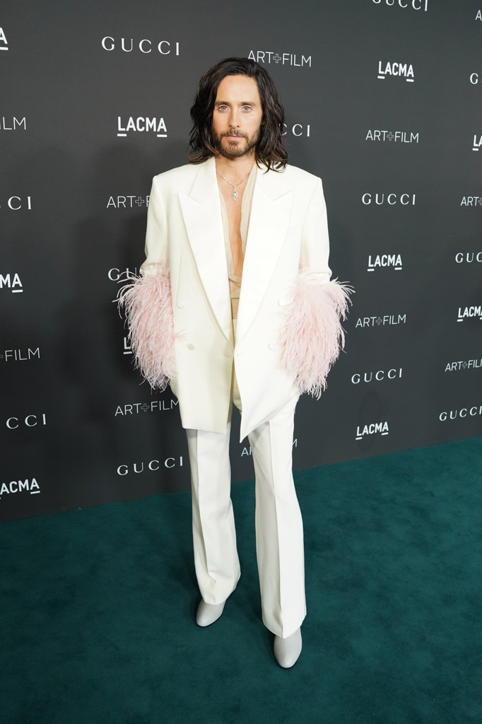 Jared Leto 也是穿了 Gucci 最新款的西裝出席LACMA Art+Film 慈善晚宴,這件應該是從ARIA系列延伸出來的,這套很適合手舞足蹈,啦啦隊的效果超強的!