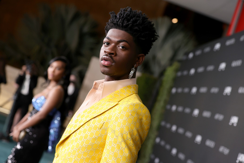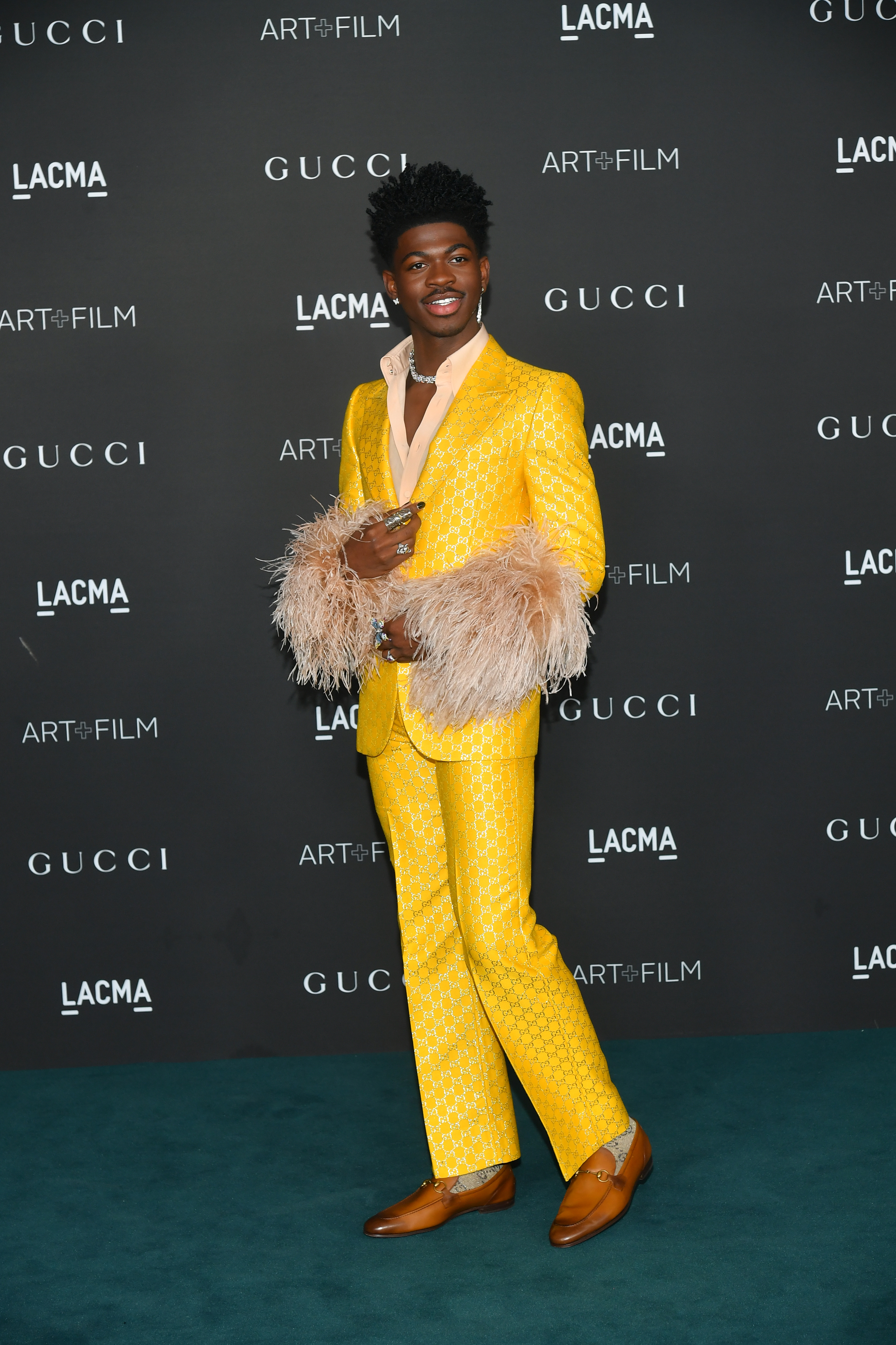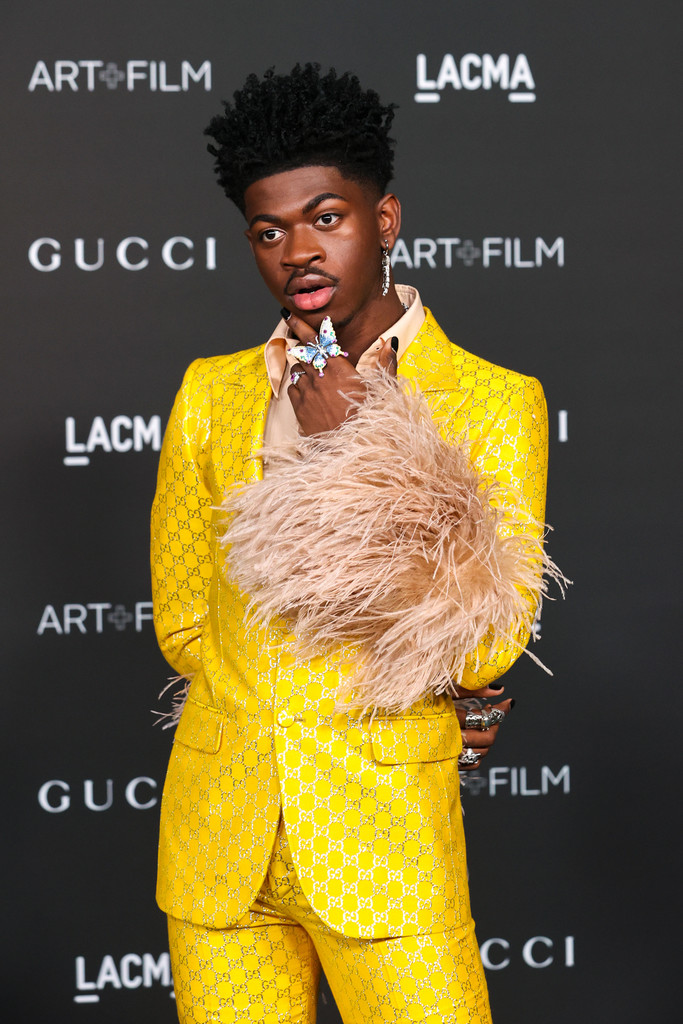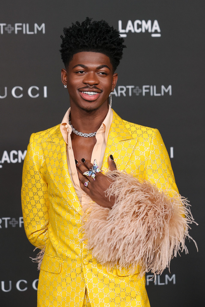 Lil Nas X 在LACMA Art+Film慈善晚宴穿的也是 Gucci 訂製的西裝,這設計和 Jared Leto 有點類似(好啦,羽毛袖套這部分其實就是一樣),但粉色襯衫、鮮黃色logo西裝的搭配很搶眼很適合他,蝴蝶戒指很美![]()