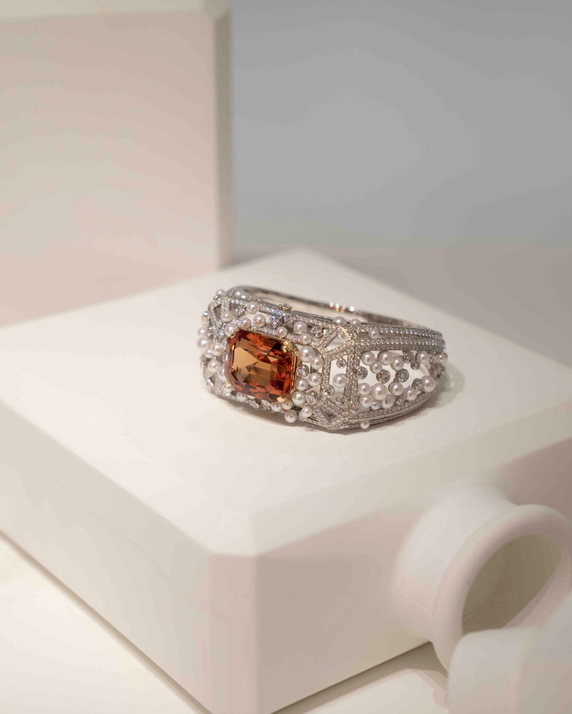 如同我們滿懷期待地拆開N°5的包裝時,首先映入眼簾的,就是瓶蓋,因此瓶蓋(The Stopper)就是這次的第一篇章。以巴黎芳登廣場的八角形作為設計靈感的瓶蓋,如實地表現在這只Rubbly Stopper手鐲上,八角形同時能與祖母綠形切割呼應,展現珠寶的高超切割工法。手鐲中心的帝王拓帕石不但漾著N°5香水的顏色,嵌上的珍珠優雅也象徵香水中的小小氣泡,相當別緻。