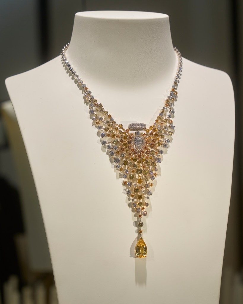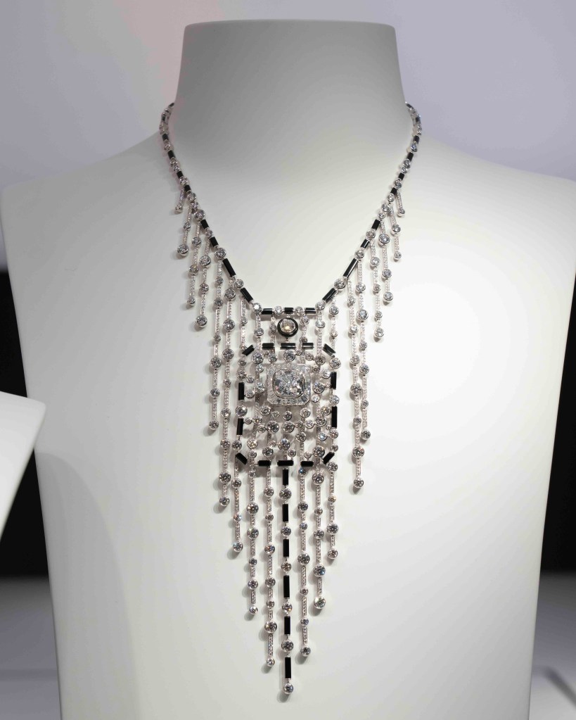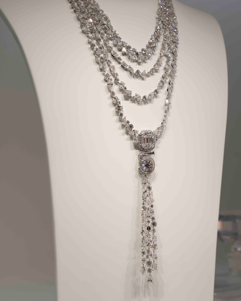 五個篇章都欣賞完以後,N°5頂級珠寶展的最後一站,就是已成為品牌典藏的55.55項鍊。她把所有香水的符碼都融合其中,瓶蓋、瓶身、數字5 (55.55克拉),花卉和香氣的軌跡融合為像是香水瀑布的水滴鑽石,能親眼看到這鬼斧神工的卓越珍寶,真是太值得了!