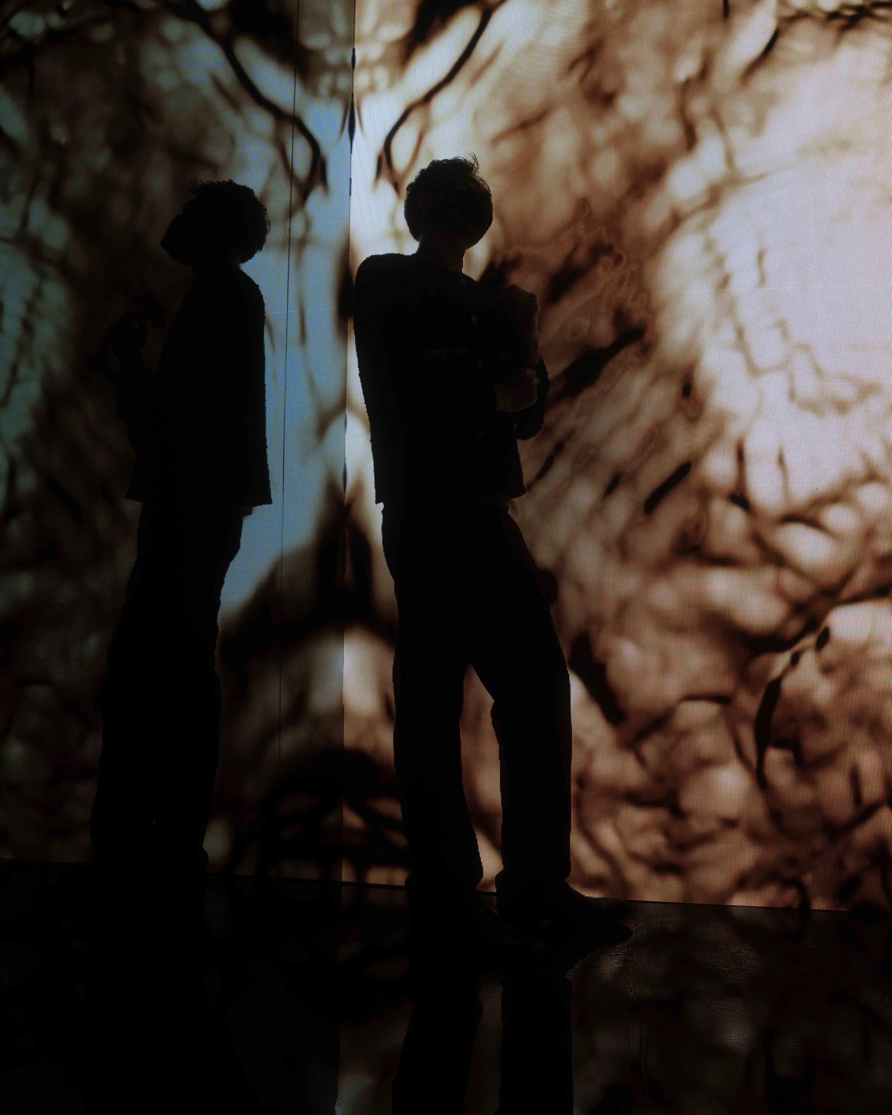 正式進入展間前,有個特別設計的空間,要讓我們一方面放鬆,另一方面可以完全性地沈浸、沈醉的N°5的香水之中,於是空間打造成琥珀色的香水不斷流動的樣子,我們得以想像自己隨著香水,感受N°5頂級珠寶五個篇章的每個細節。