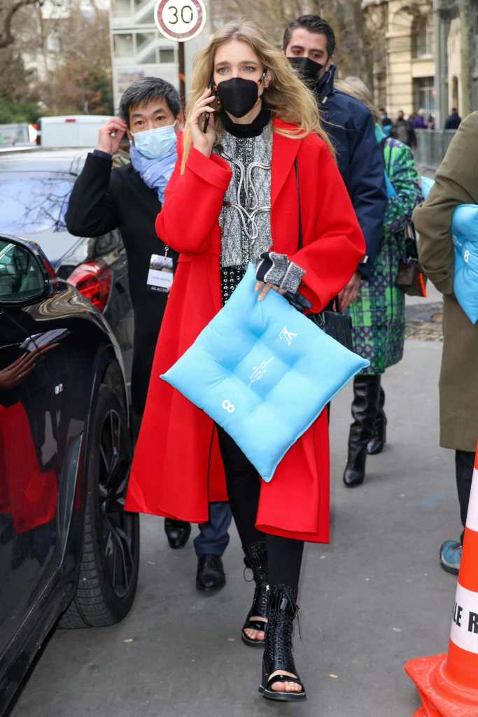 她身穿品牌2022春夏女裝,我是非常喜歡她另外搭配的紅色大衣,感覺全身更加協調;看來這次看秀的其中一個禮物就是坐墊(她還拿在手上),真的粉美