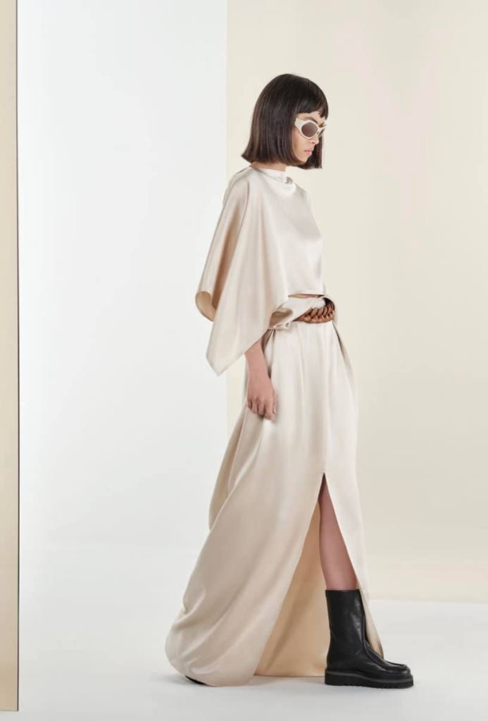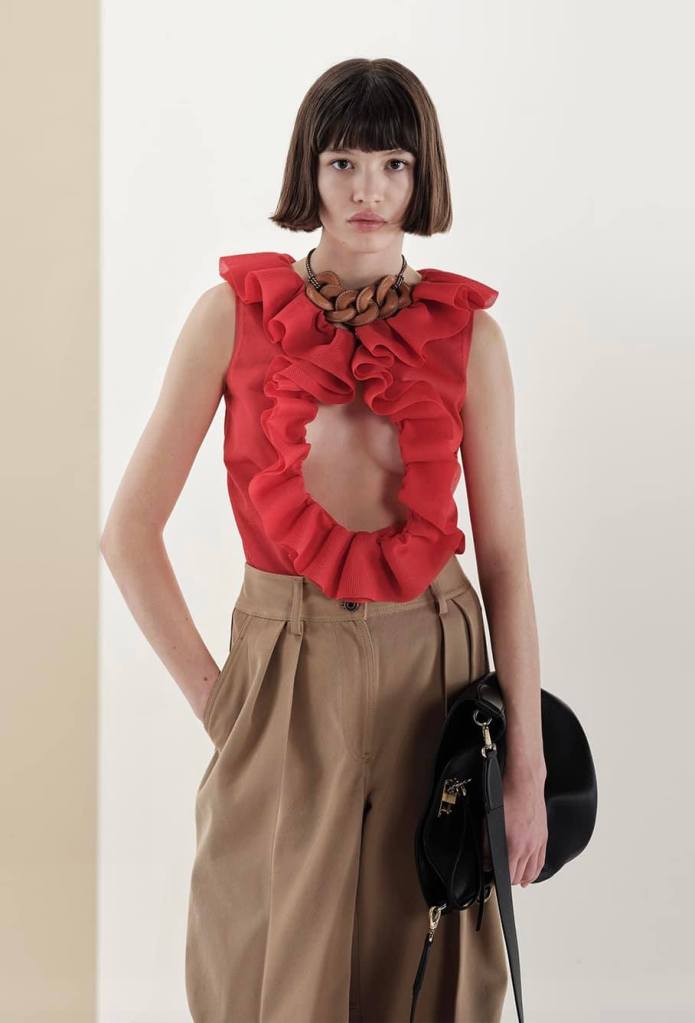 品牌把拿手的絲巾,做成輕盈的洋裝,也在短版上衣中把荷葉邊的元素加入(這件可以從中間扣起來成為若隱若現性感的單品),還有把皮革做拼接與混搭的使用;最後張圖那件黑色皮革大衣,就是把皮革製成猶如潛水衣感的面料(當然也輕盈),秀上還有一件綠色大衣,輕薄到好好看!