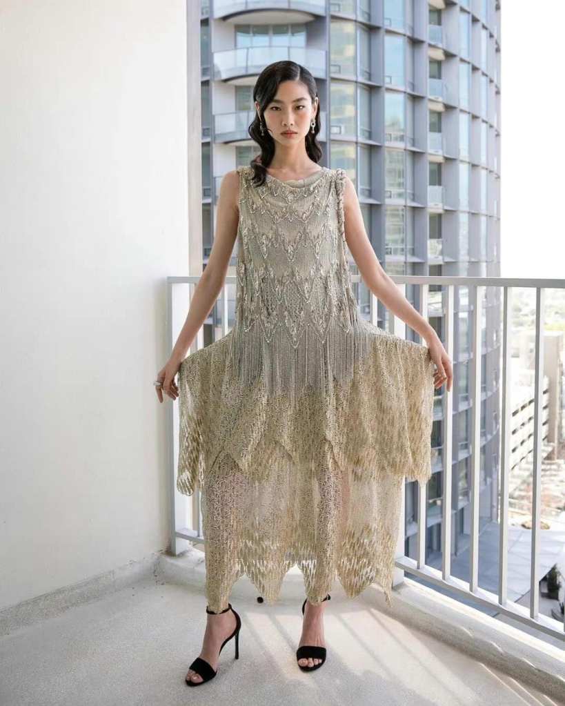 這件禮服靈感來自十八世紀的蓬蓬裙,取其結構,卻不讓裙身那麼龐大;禮服身上的亮片與珠綴取自20年代古董衣,試圖創造一種前衛的古典華麗感,鞋子好看。