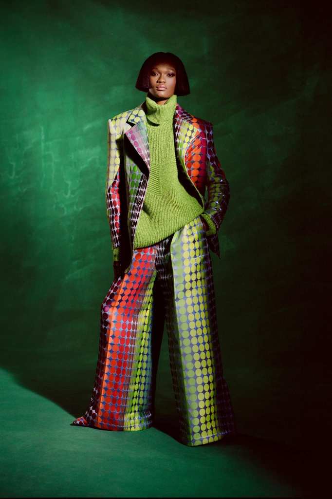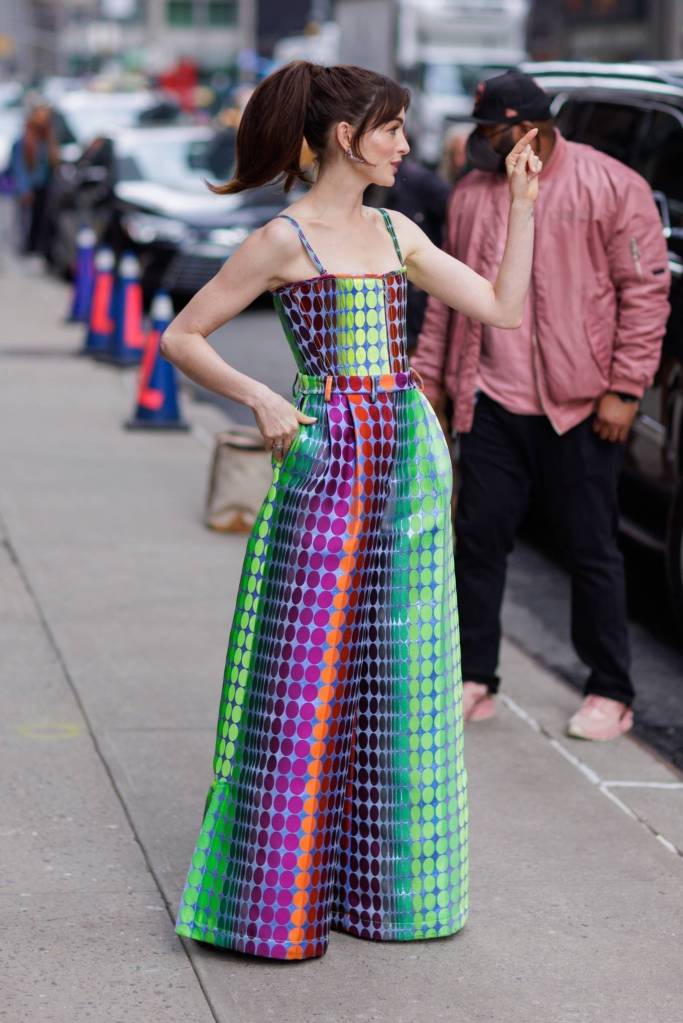 這一套 Christopher John Rogers 2022早春的彩色圓點褲裝竟然也可以,這套穿不好會很像漫威的反派角色,但她手上的藍色 Versace包包我喜歡,算是很好的一個轉折分號
