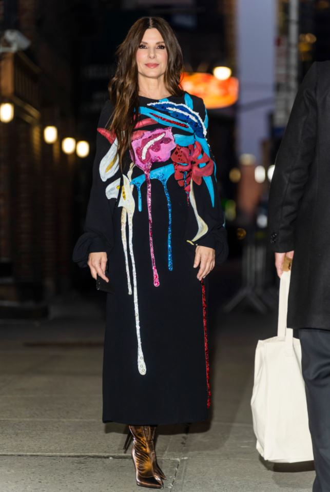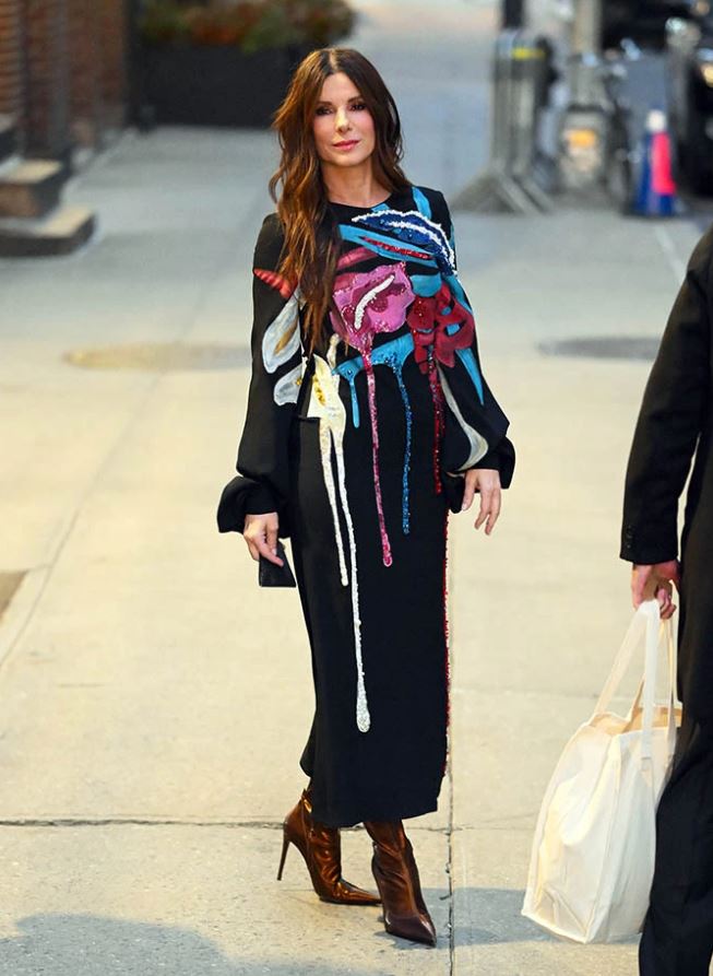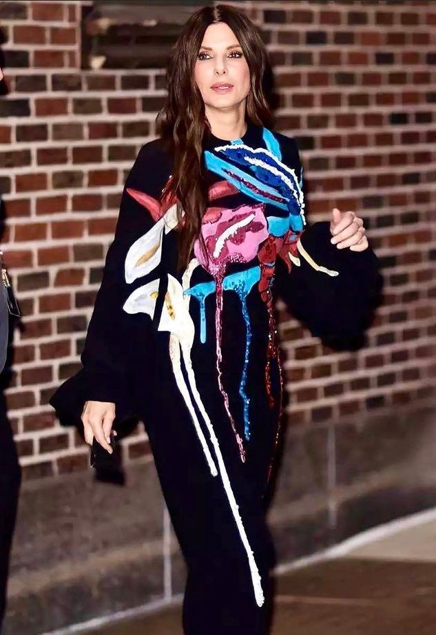 Sandra Bullock 出席《The Lost City》紐約首映時,選穿 Stella Jean 2021秋冬的洋裝亮相。