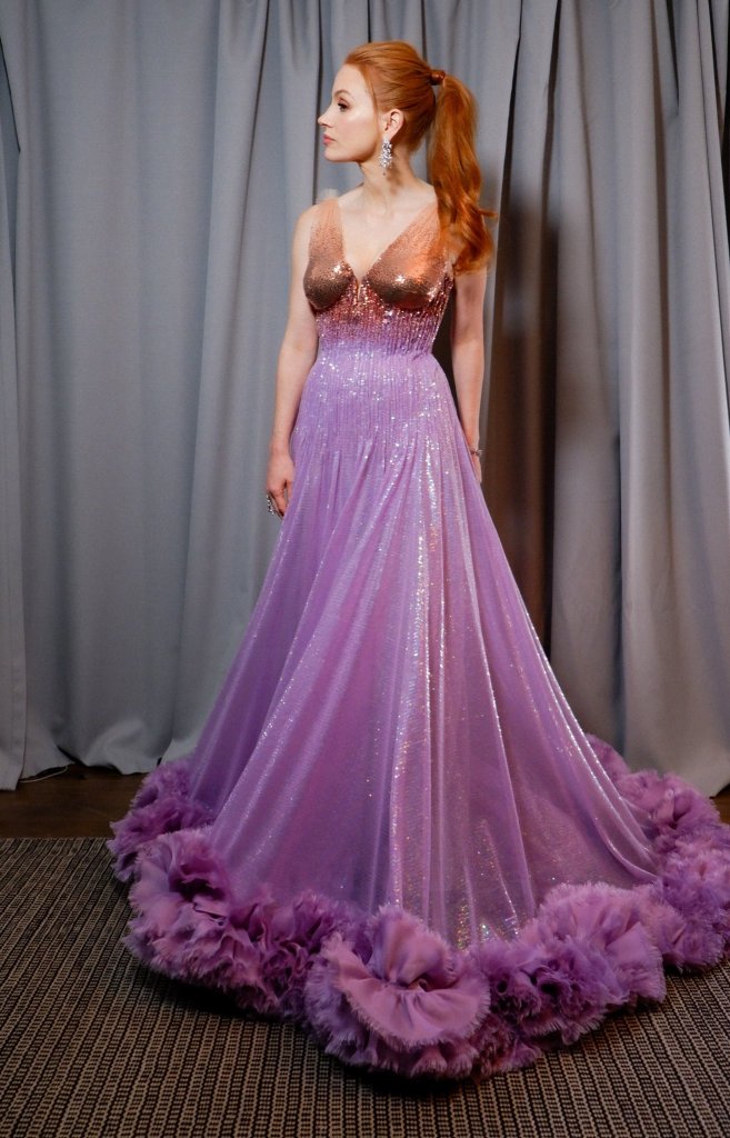她選擇的是來自 Gucci 的訂製禮服(從Love Parade系列延伸),這件禮服在行走的時候裙身上的薰衣草紫亮片溫柔的閃耀超美,上半身漸層的色彩也好迷人,裙襬的花朵製造的層次與重量感很好看![]()