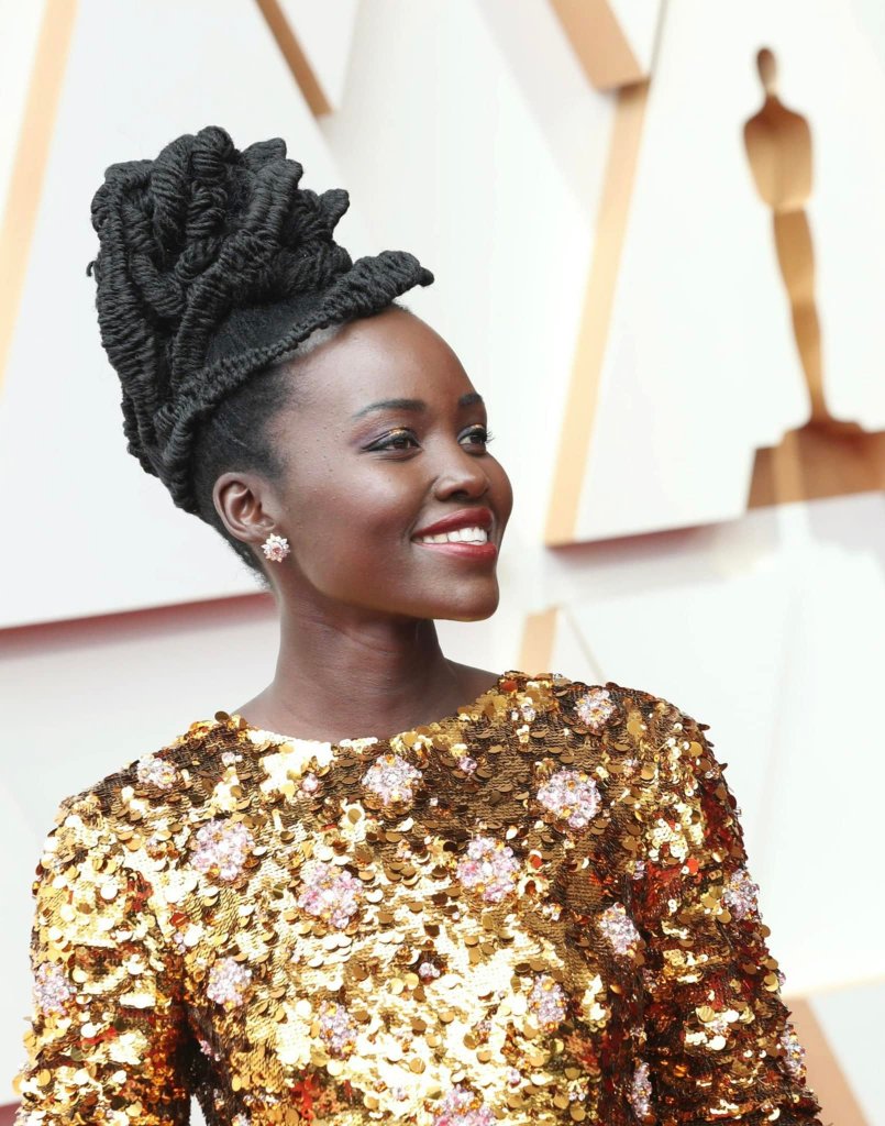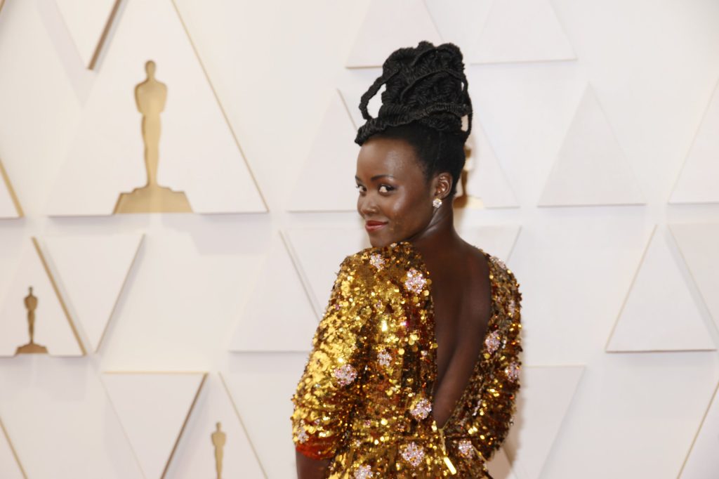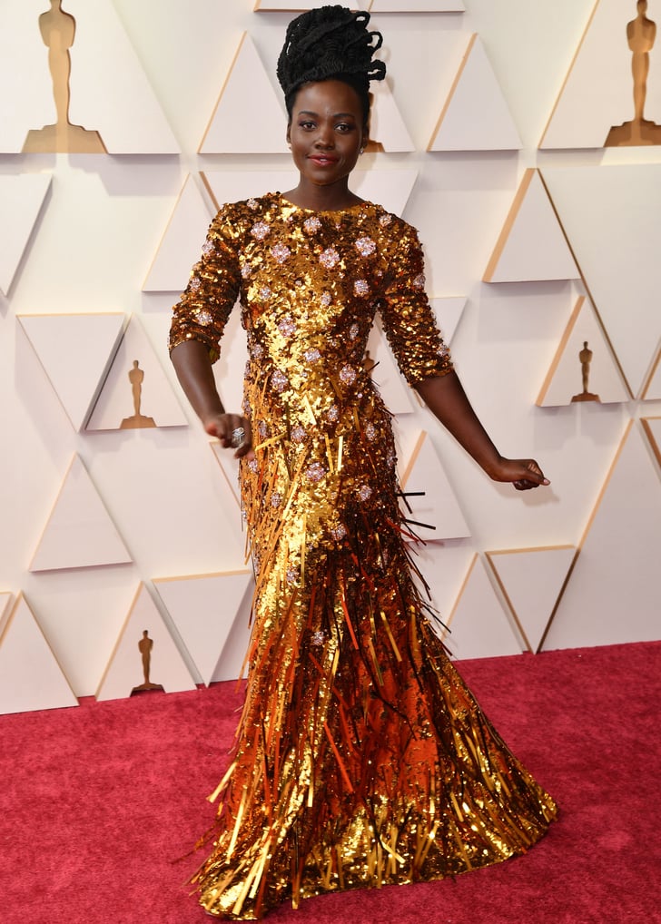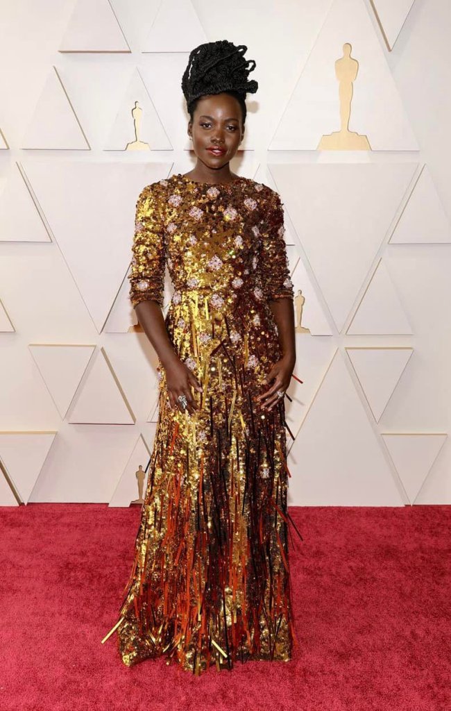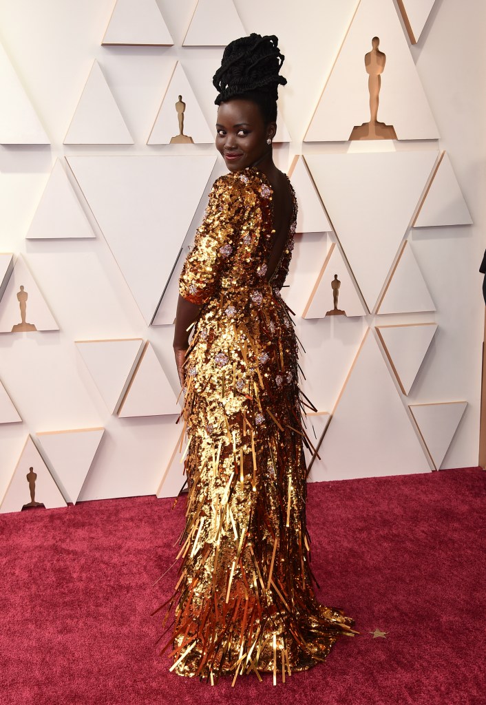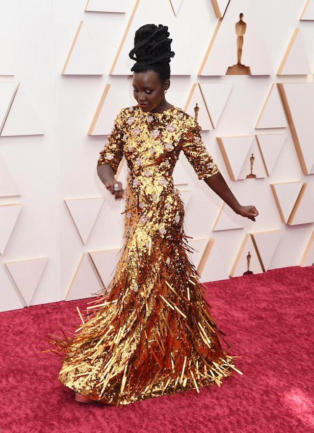 Lupita Nyong’o 今天是以 Prada 特別訂製的金色亮片與流蘇禮服出席奧斯卡獎,有點成熟,好像是位有氣勢不好惹的丈母娘…