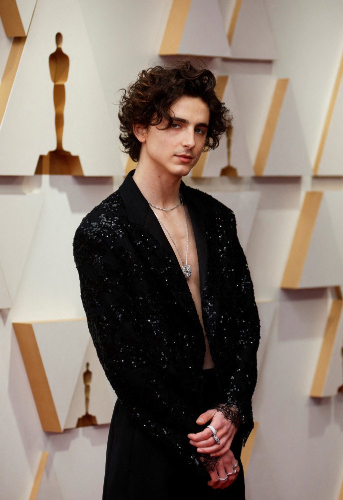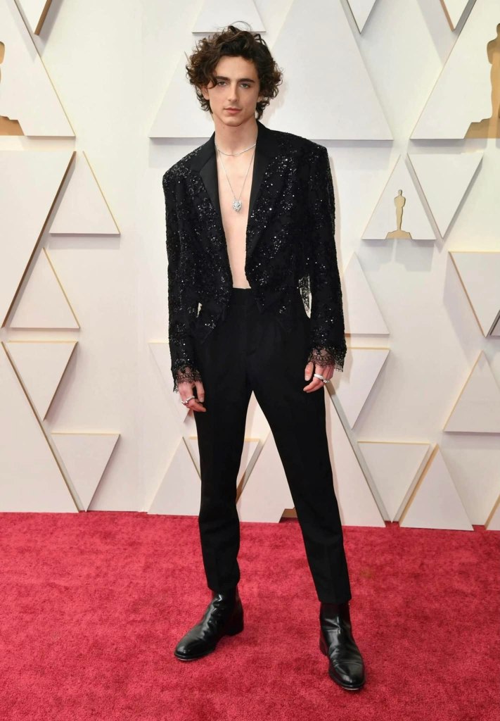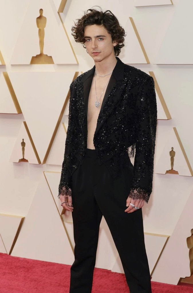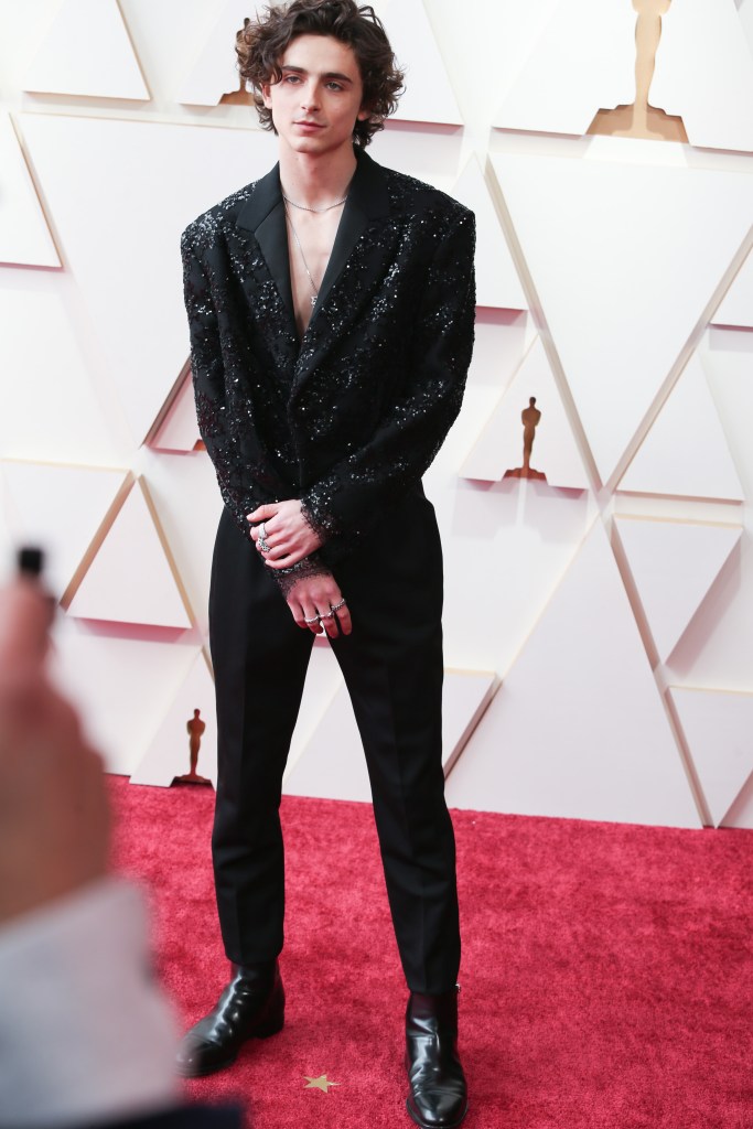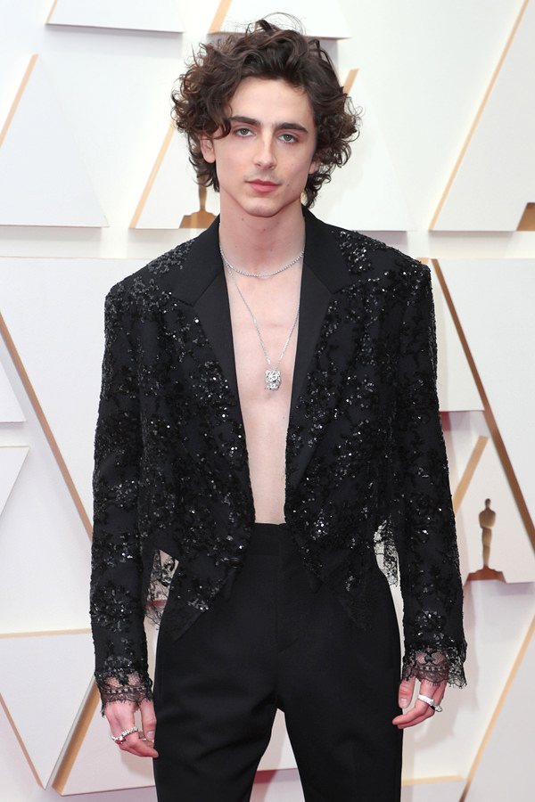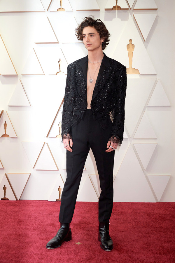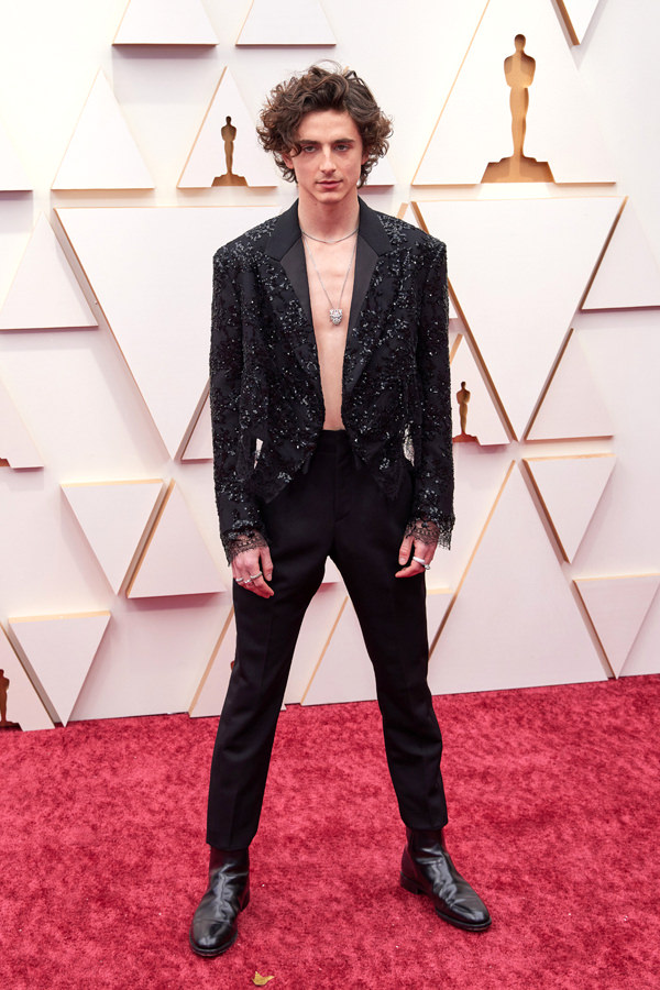Timothee Chalamet 真的是資優生,穿衣品味和氣場超強!他今天穿了 Louis Vuitton 2022春夏的女裝,亮片與蕾絲短版西裝外套,選擇不穿內搭,直接以黑褲與靴子走上紅毯,帥不用說,還有點媚,真好看!